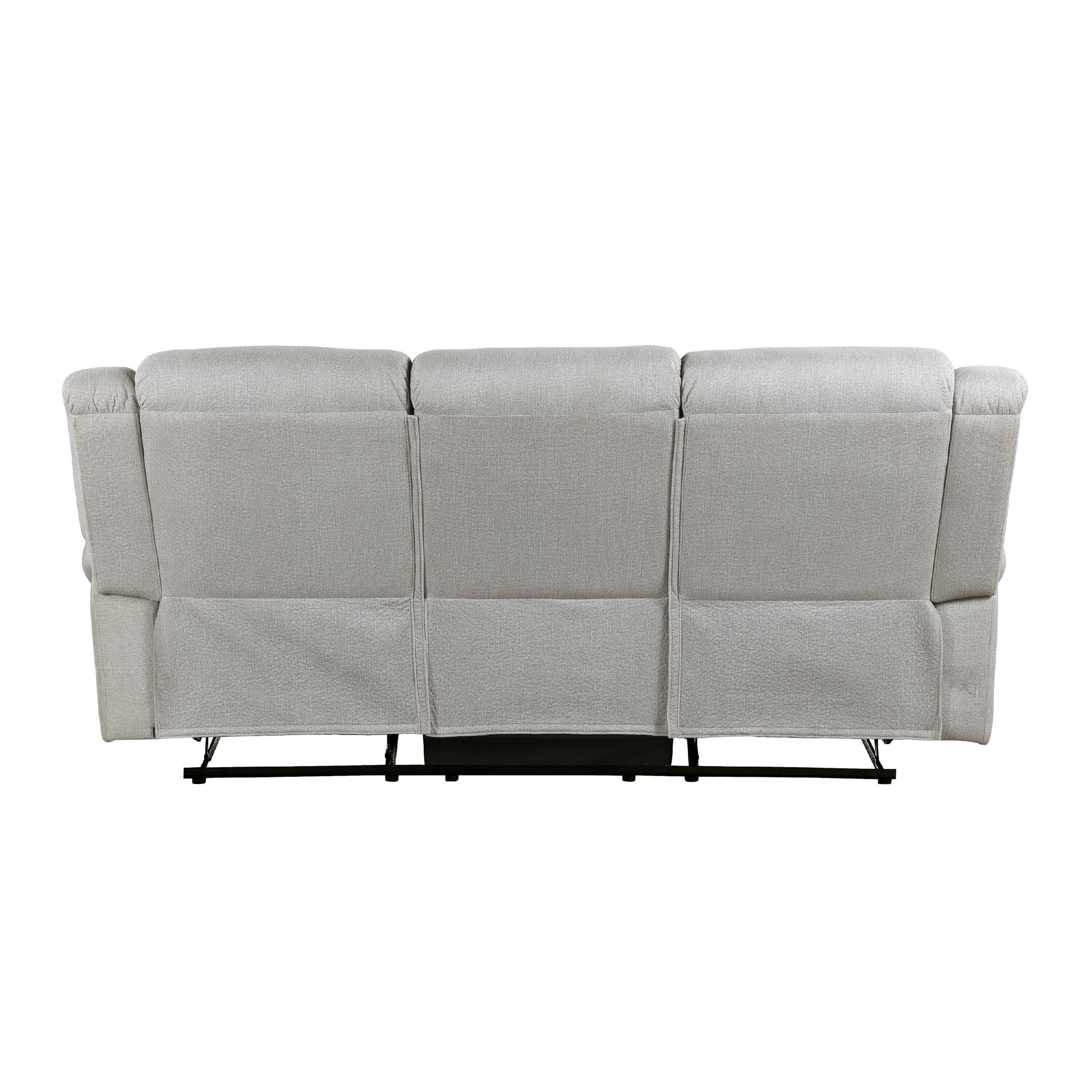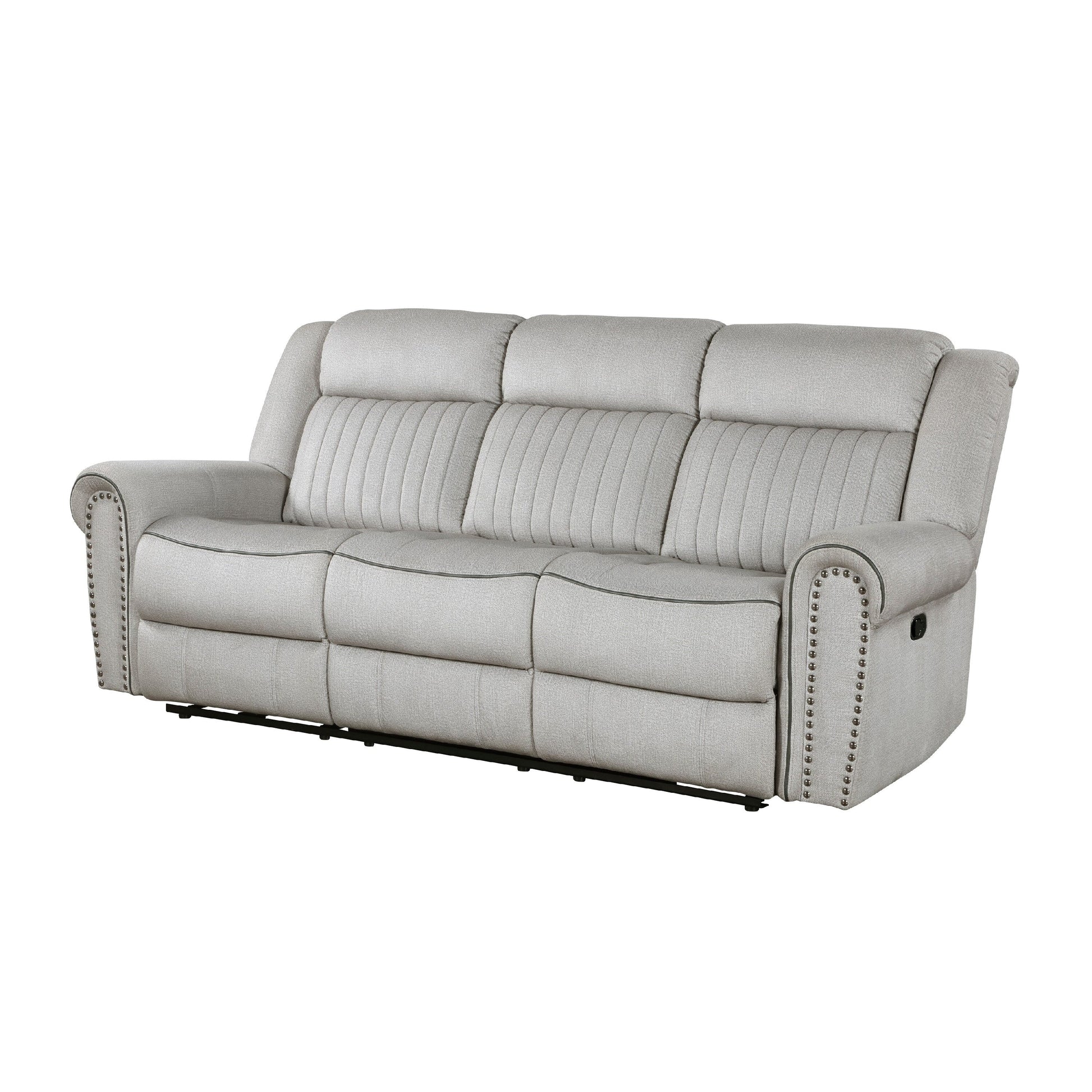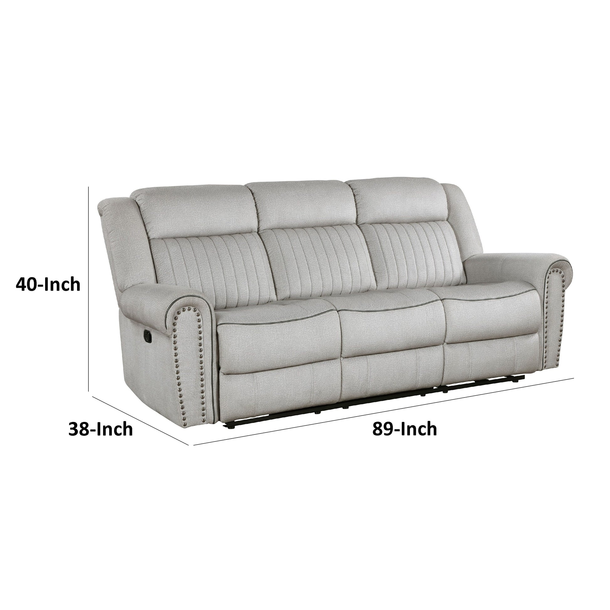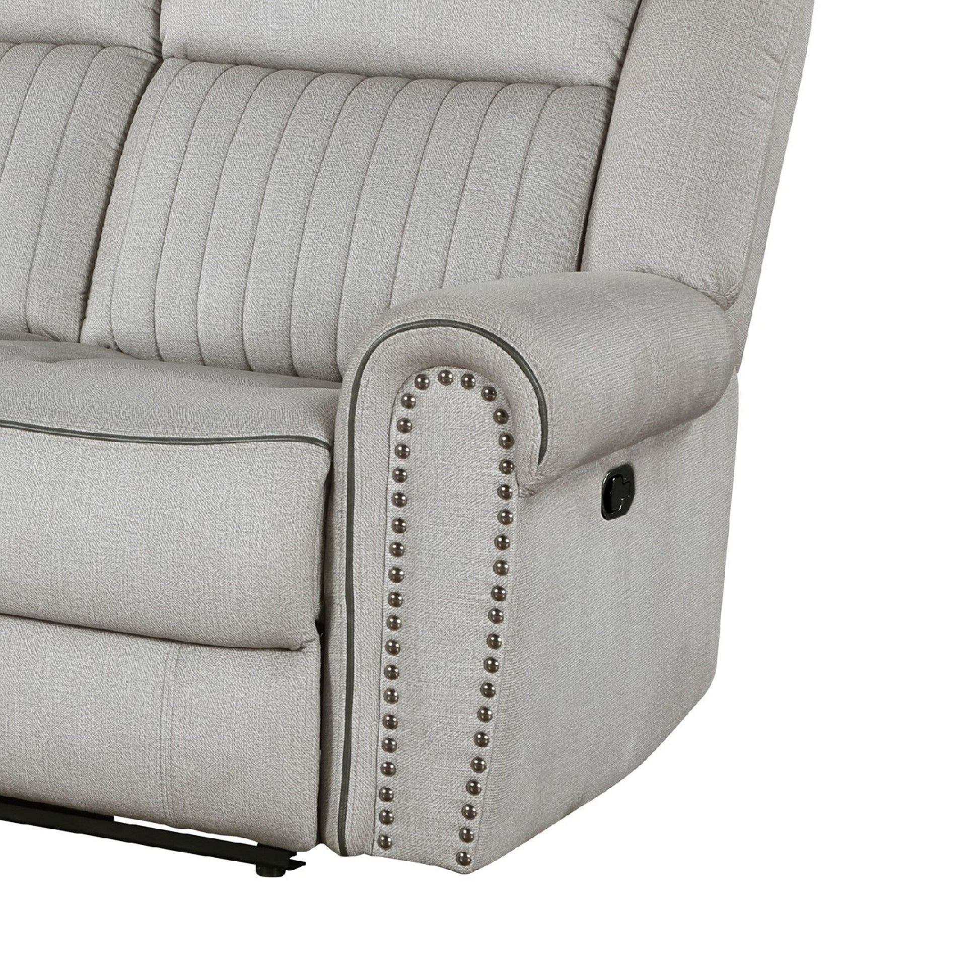 Relax in casual elegance with this cozy sofa that grants utmost comfort. Built with a solid wood and plywood frame reinforced with metal, it features textured microfiber upholstery in a striking gray finish. A manual reclining mechanism, contoured stitching, and nailhead trim enhance both its comfort and transitional style. Explore our Ben collection for more options.