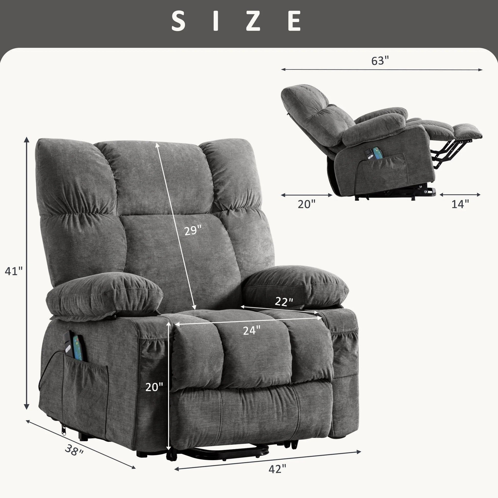 [Convenient Design]: This electric lift chair includes a USB charging cable for charging devices while sitting or reclining. It also has dual side pockets for storing the remote control or magazines, and front dual pockets for storing phones or other small items. (Note: The USB ports are only for low-power devices, such as iPhones or iPads.)