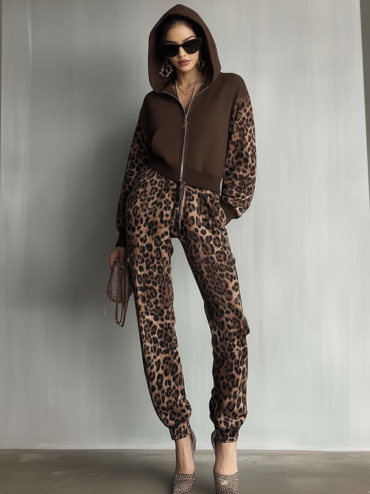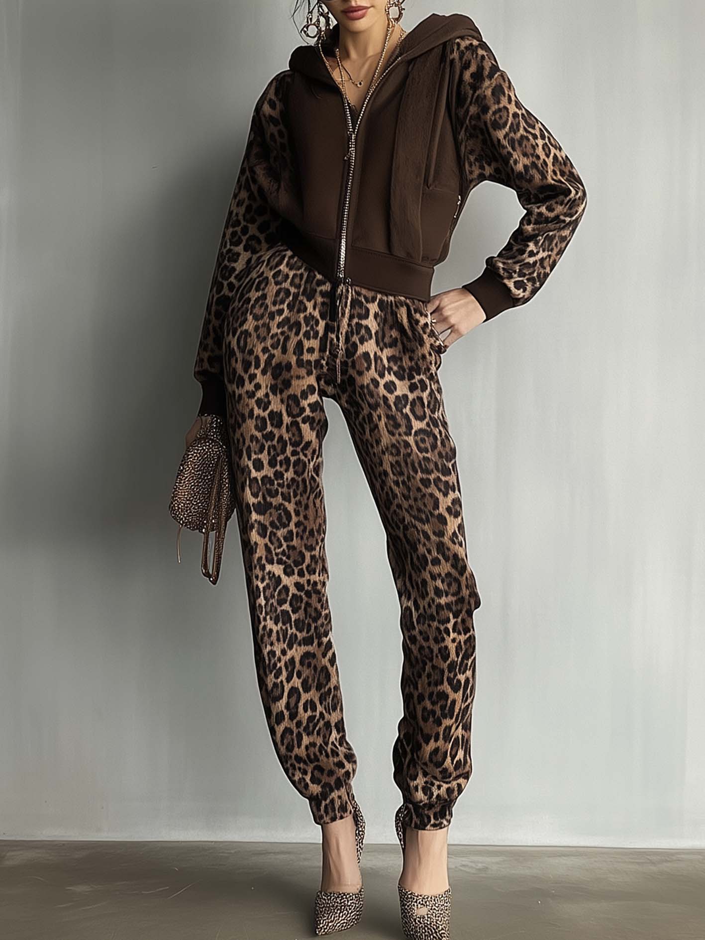 Brown Hooded Sweatshirt Jumpsuit With Leopard Print