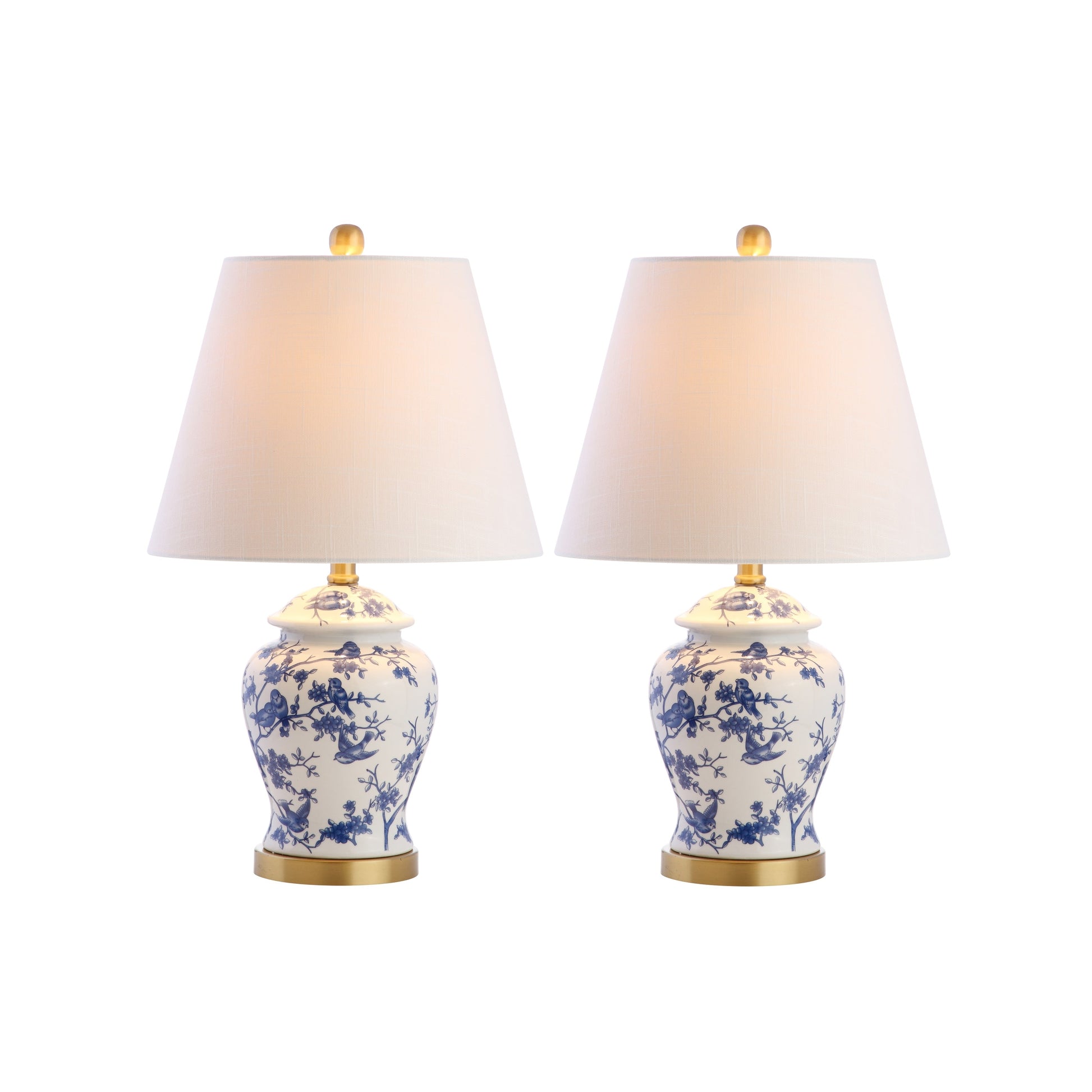 Illuminate your traditional space with the quiet grandeur of the Choi 22' Chinoiserie table lamp. Hand-painted with antiqued brass ornamentation, this ginger jar lamp comes with a tapered linen hardback shade that complements its elegant design. A brass finial on top and a silk-wrapped cord in the back add to its charm. This set of two lamps will add a touch of sophistication to your home decor.