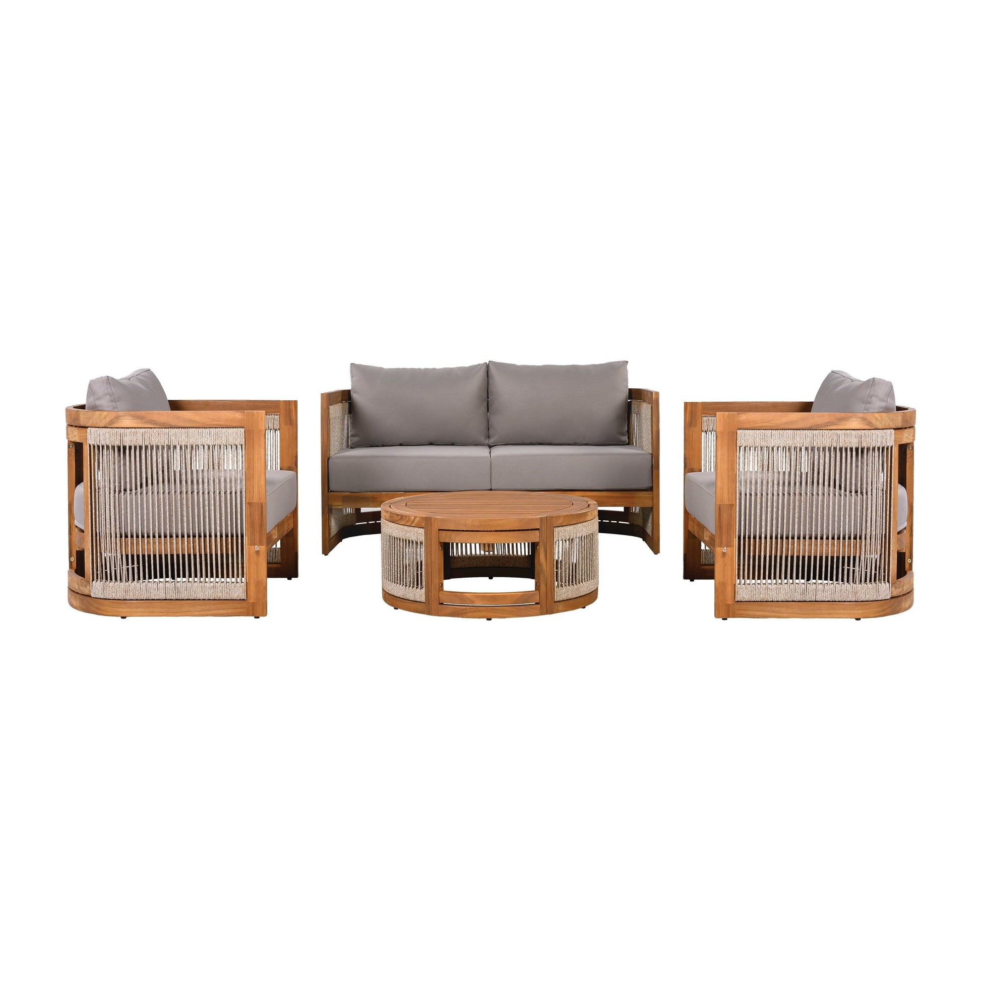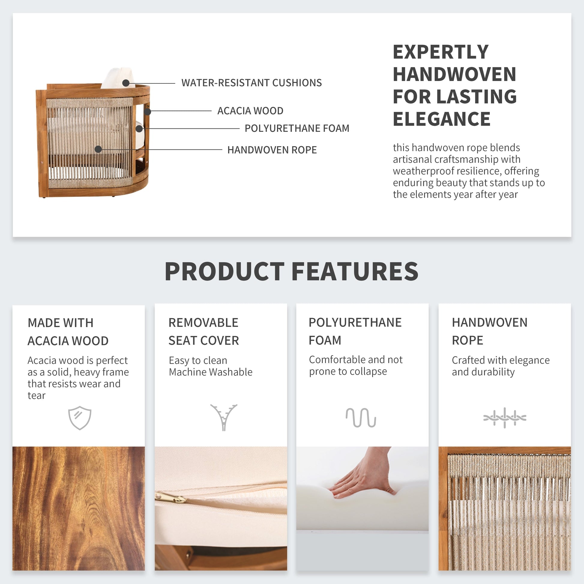 Durable Acacia Wood Craftsmanship: Crafted from premium-grade acacia hardwood, this outdoor lounge set embodies both strength and elegance. The naturally weather-resistant wood resists fading, cracking, and warping, preserving its rich, smooth texture and sleek appearance over time. Its dense grain structure ensures resilience against outdoor elements, making it an enduring choice for patios or gardens that withstands daily use and seasonal changes without compromising structural integrity.