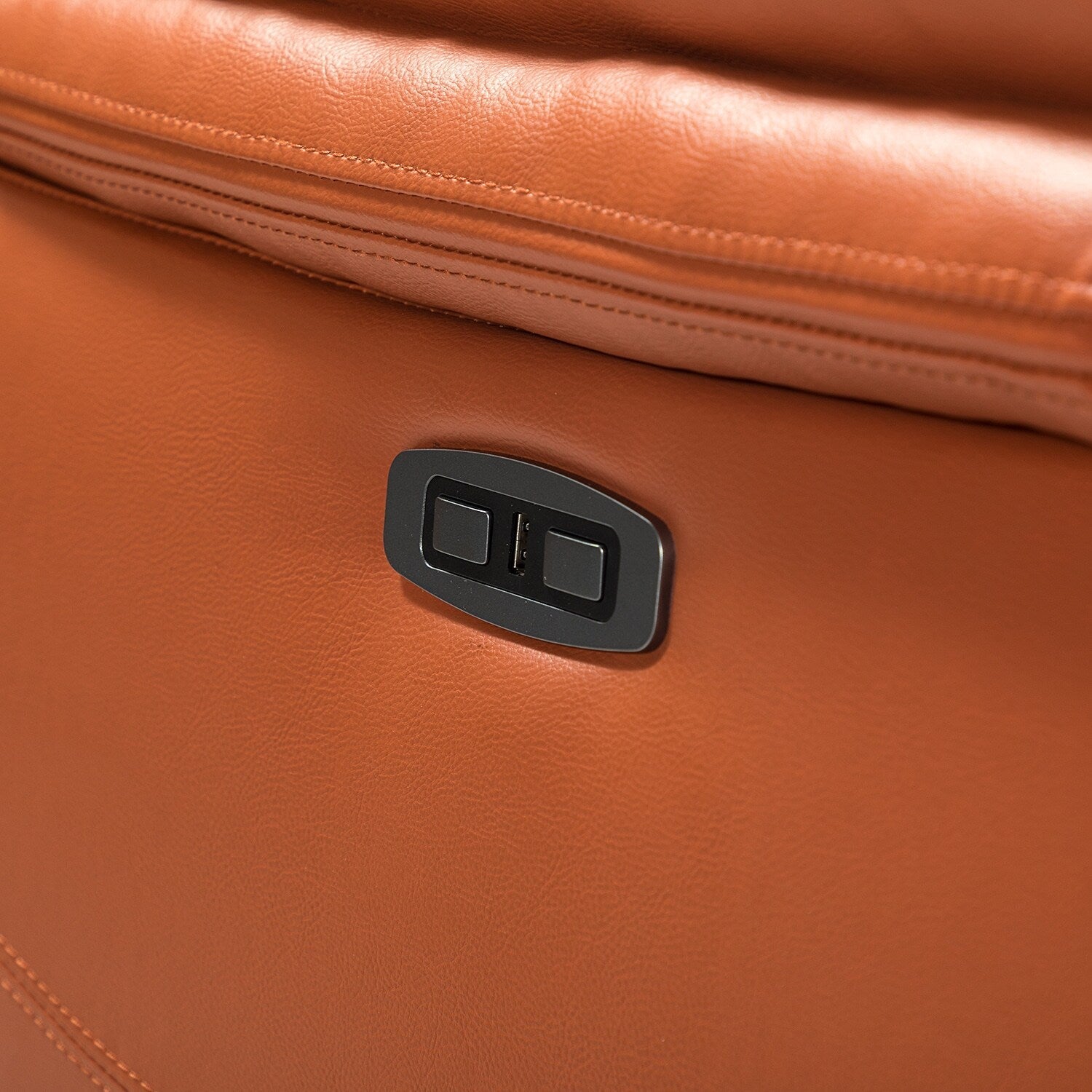 Add a touch of luxury to your home with the Clara Genuine Leather Power Recliner with Cushion Padded set. Sink into the thick foam and soft polyester fiber upholstery, while the extra cushion padding on the back provides exceptional lumbar support. The sturdy wood and metal structure is enveloped in genuine leather, making it durable for long-term use. With a maximum reclining angle of 150 degrees and a convenient USB port, you can easily adjust the angle and unwind in ultimate comfort. Perfect for the living room, media, and master bedrooms, this statement-making set features unique arms that give it an approachable aesthetic. Assembly is required for these two power recliners.