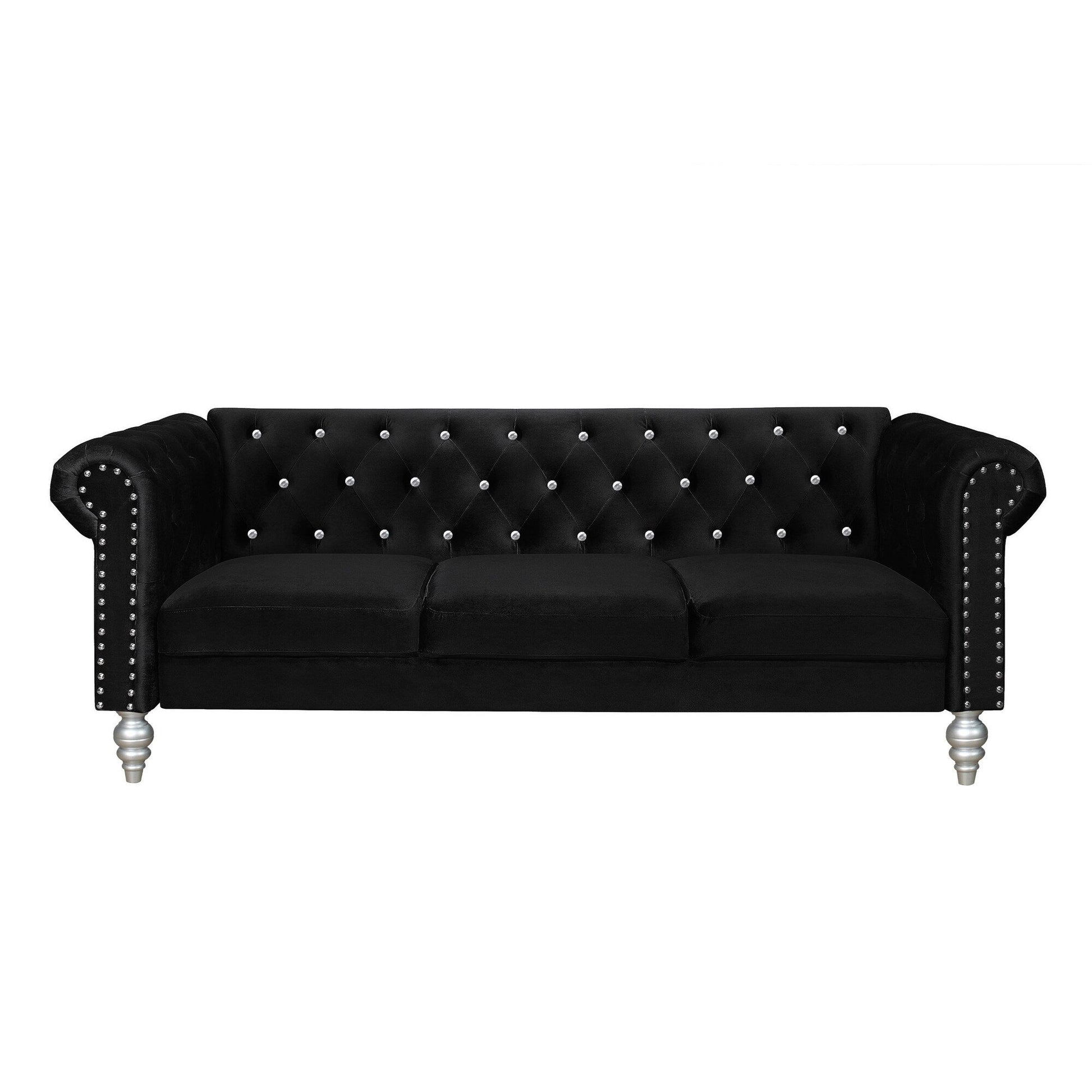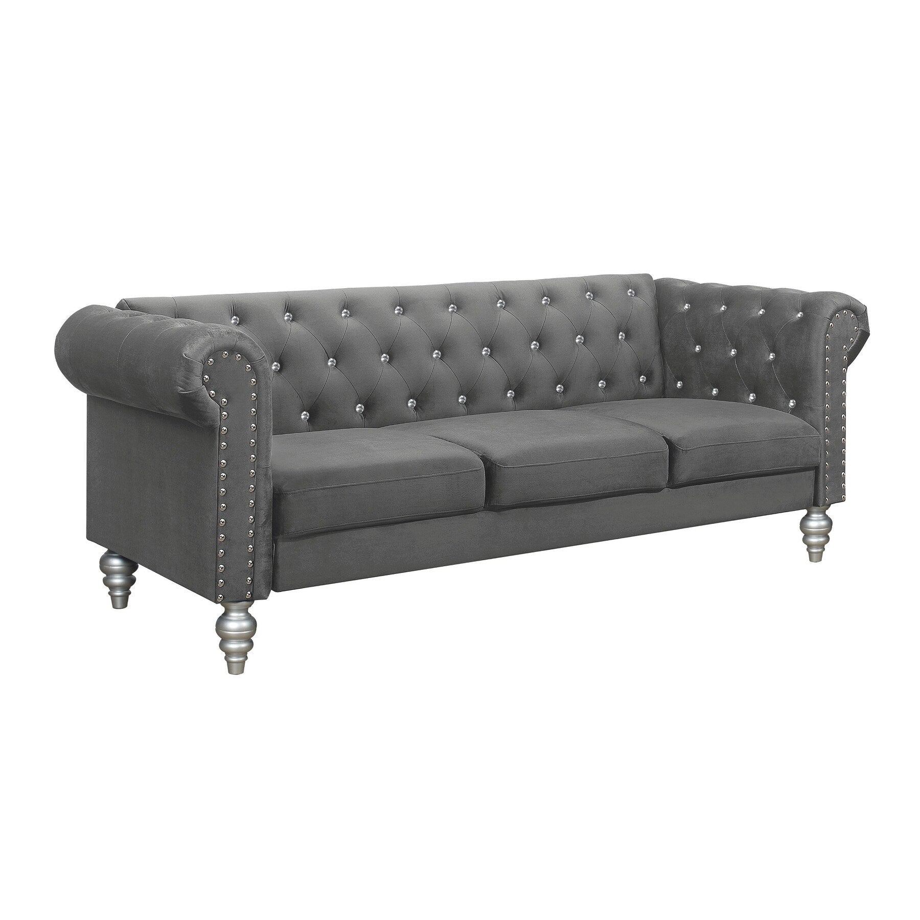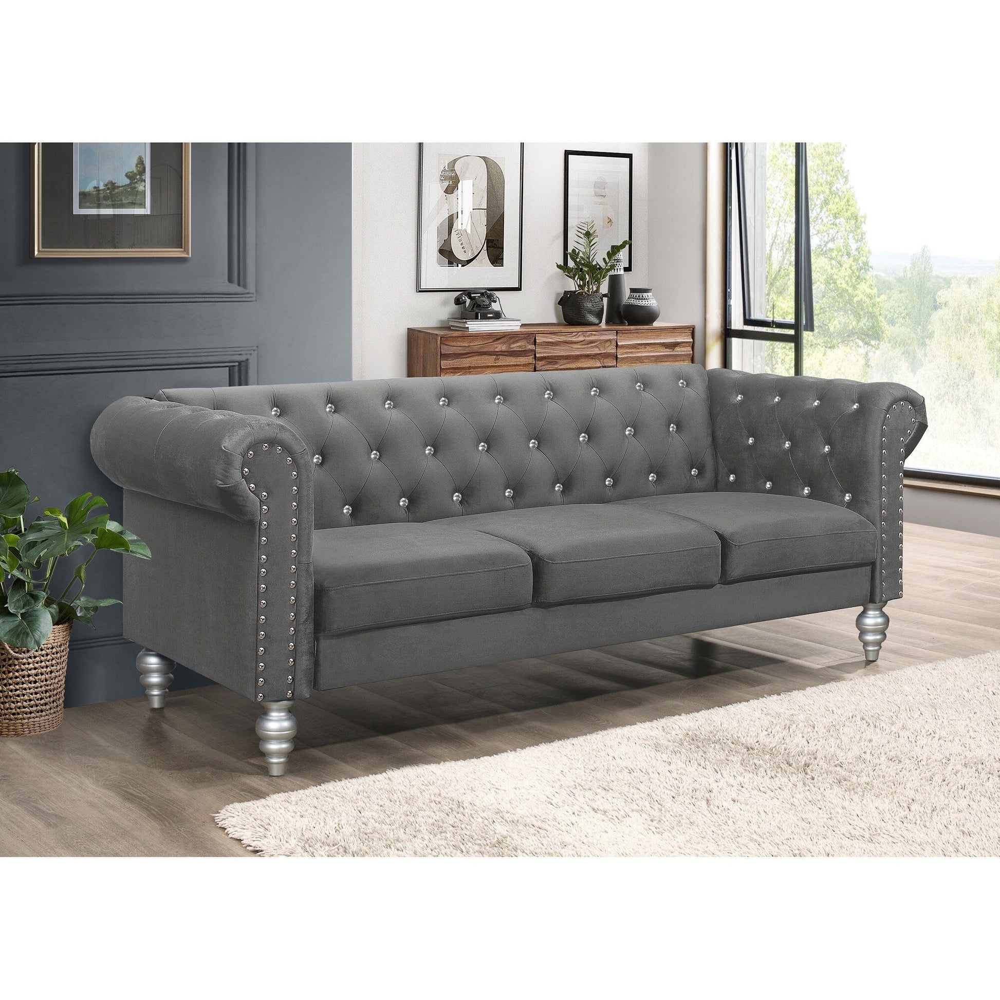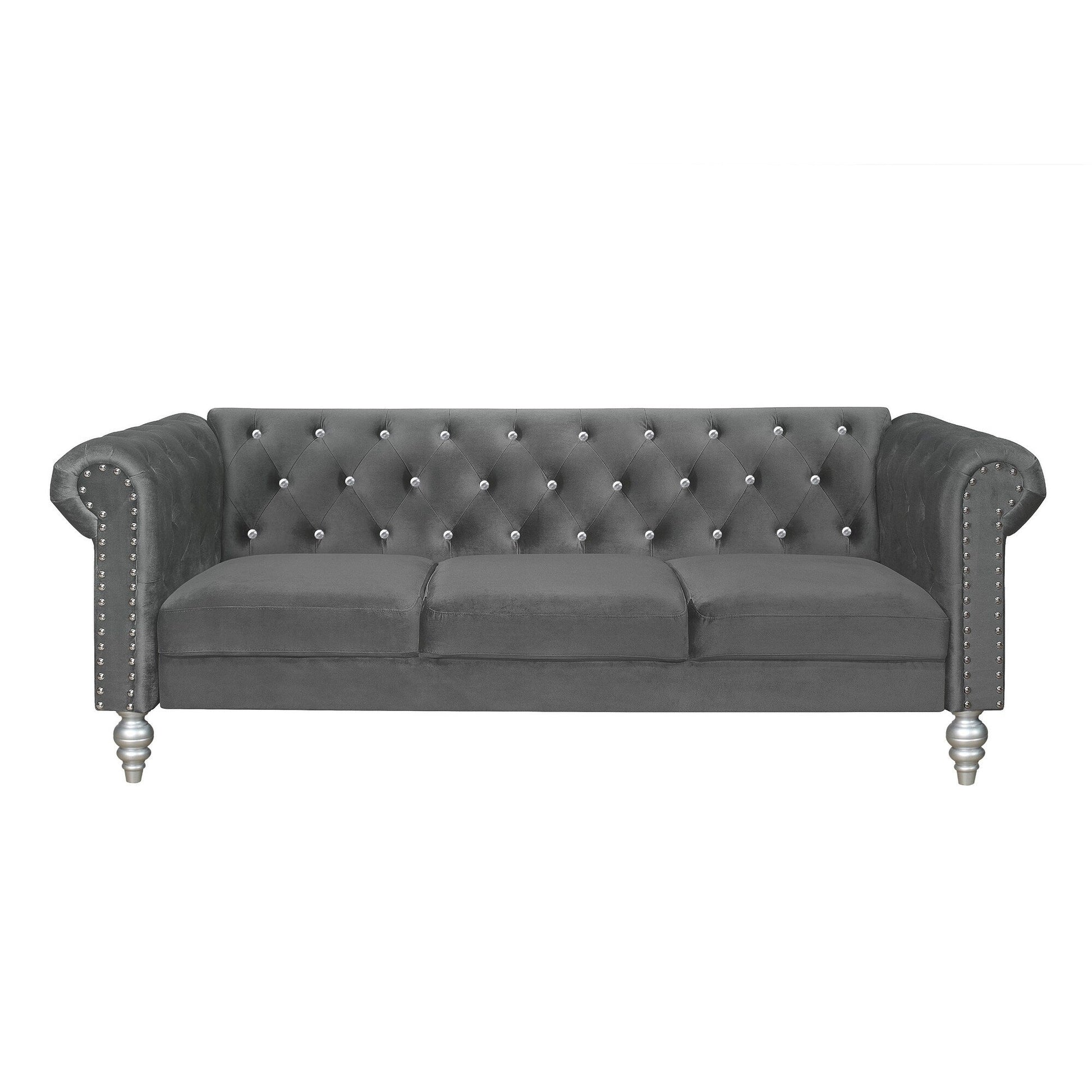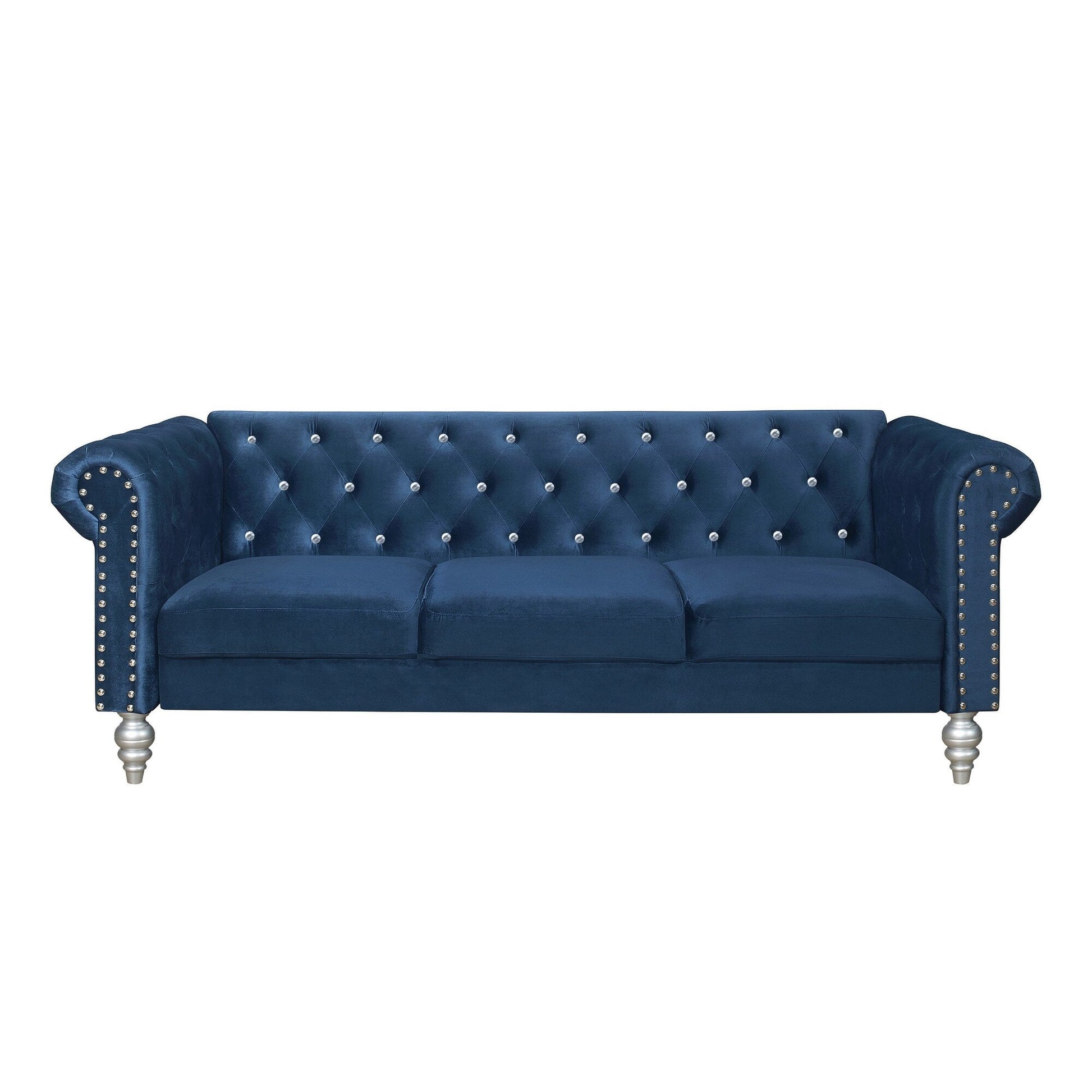 Introduce luxury and comfort into your living room with our rolled arm sofa. Its padded backrest, rolled arms, and deep cushioned seat create a stylish and relaxing atmosphere. The backrest is elegantly diamond button tufted, complemented by nailhead trimming along the rolled arms, adding a touch of sophistication. Supported by four sturdy wood-turned legs, this sofa blends modern comfort with vintage charm, making it a perfect addition for both relaxation and aesthetic enhancement in your home.