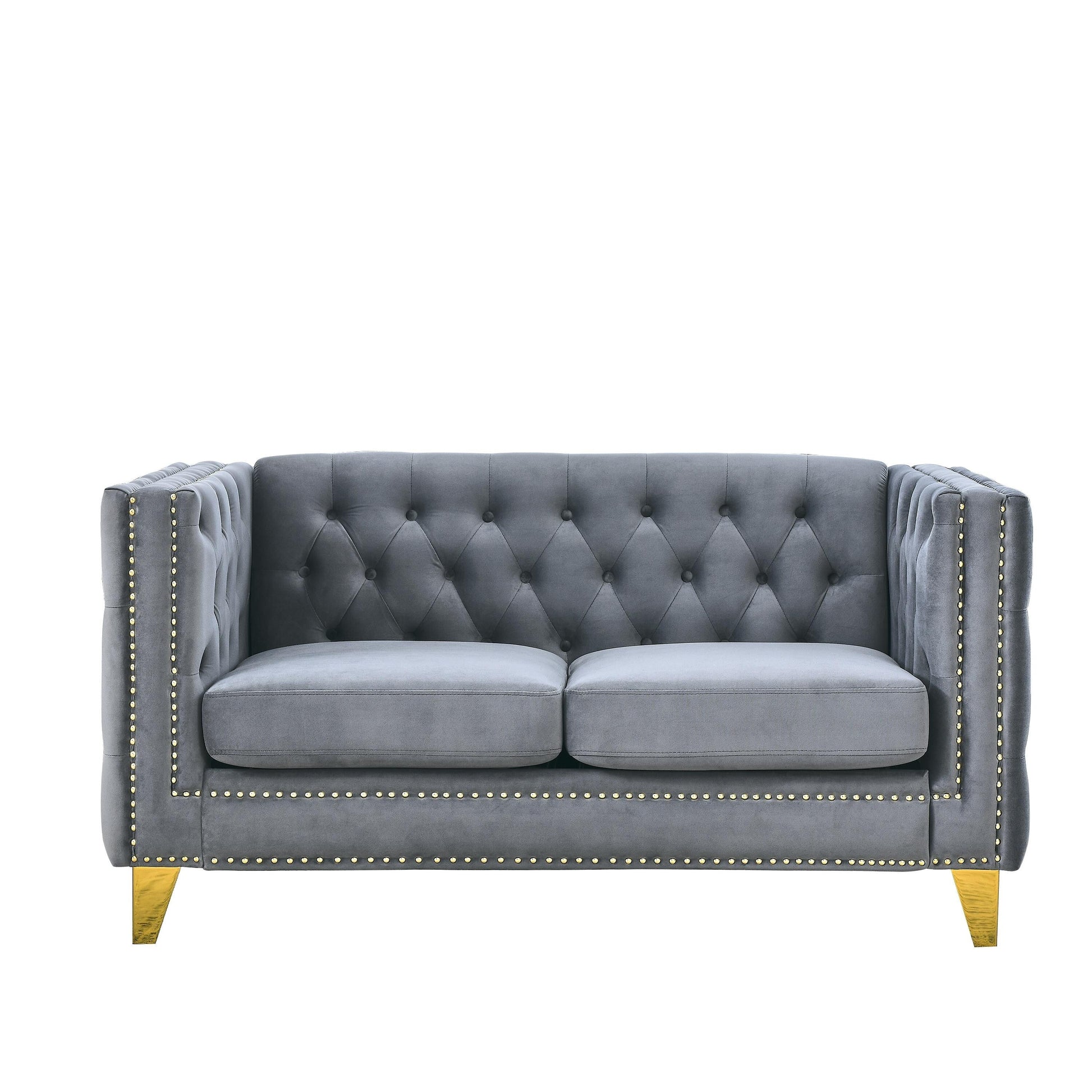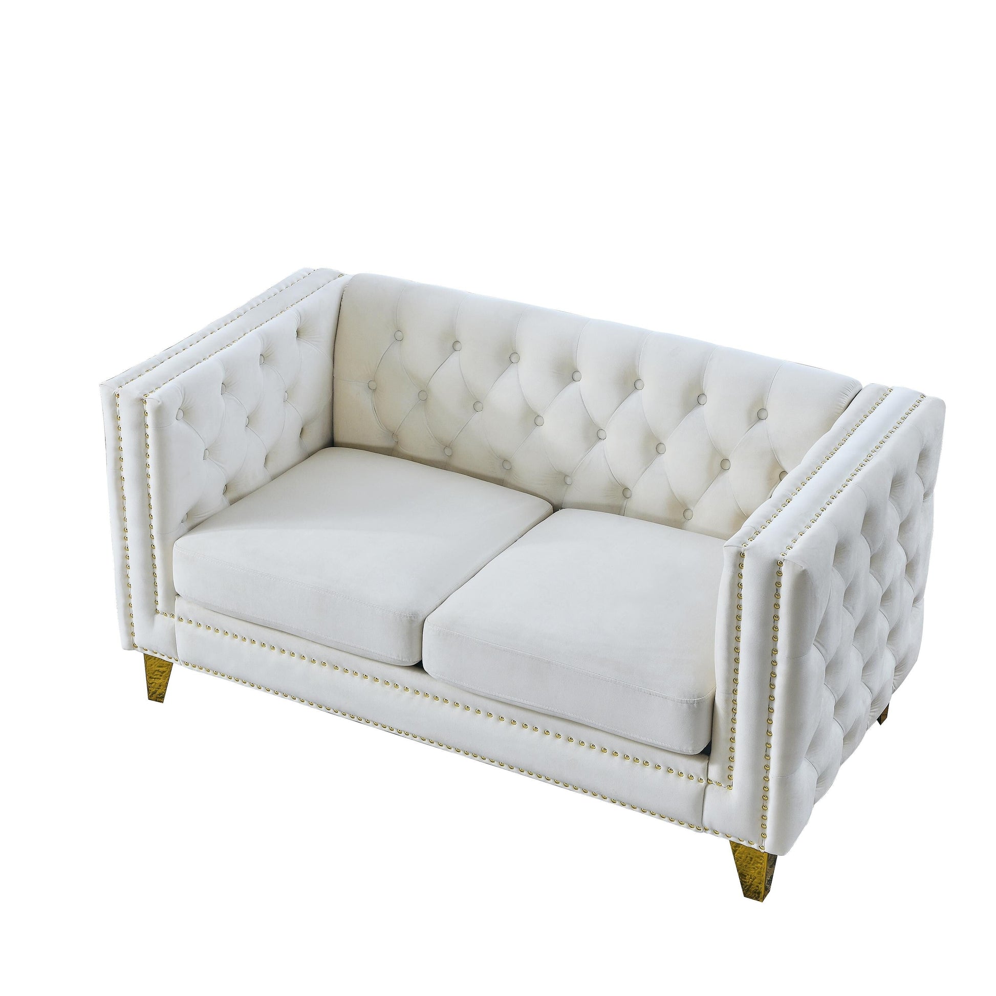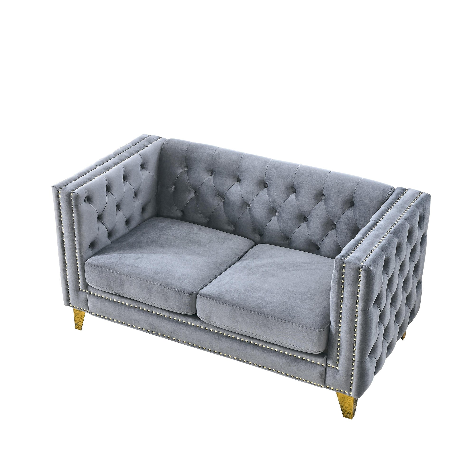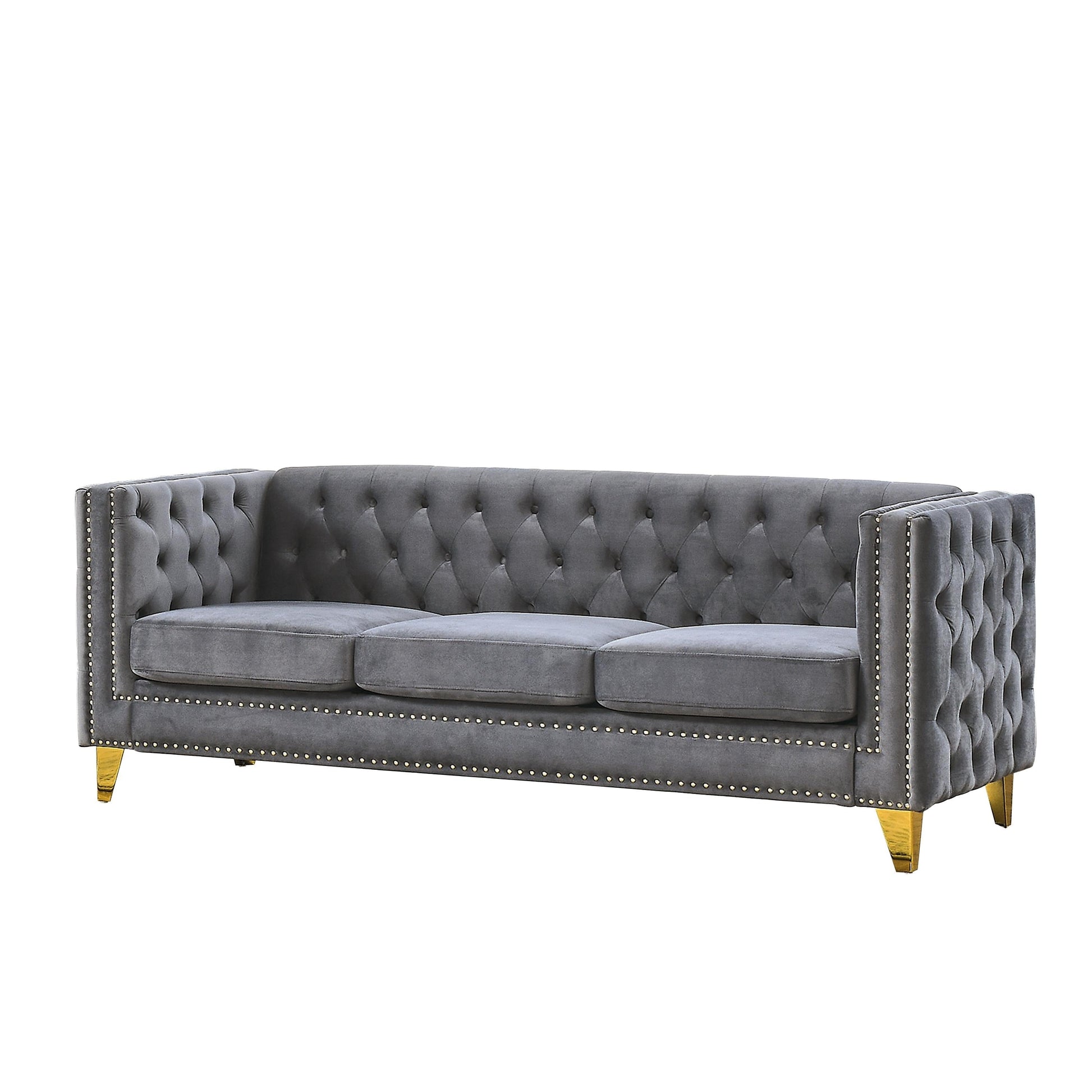 This is a three-section sofa not only comfortable to sit, beautiful appearance, looks simple and generous, fashionable and elegant. _Classic Chesterfield Sofa. Using the classic Chesterfield sofa design, classic and sophisticated. Perfectly combined with any decorative theme, this sofa is the best choice for your living room, bedroom or office. _Nailhead trim. This 3-seat sofa doesn't skimp on decorative details. Expertly designed, this piece has a tasteful nailhead trim and is attached to the armrests. Each nailhead is applied individually and has a beautiful handcrafted touch that creates a rich and luxurious visual effect. _ Sturdy and durable. The sofa's frame is made of solid wood for added sturdiness and durability. With comfortable foam, soft cushions supported by a curved spring structure, metal legs for years of use, and tufted buttons on the back and arms, this sofa is perfect for those who want to rest after a busy day. _ Overall dimensions. Sitting height 17.6 inches, sitting depth 23 inches, sitting width 67 inches, feet height 5 inches, soft doll cotton and foam, ergonomic and comfortable sitting position, soft seating surface, you can feel free to lie on it, watch TV or doze off and relax all day in the living room. _ Regular dusting, gently pat or wipe with a clean dry cloth. Professional cleaning is recommended. Do not let direct sunlight shine. Do not use or clean harsh chemicals. We have a professional support team, if you have any questions, please feel free to contact us.