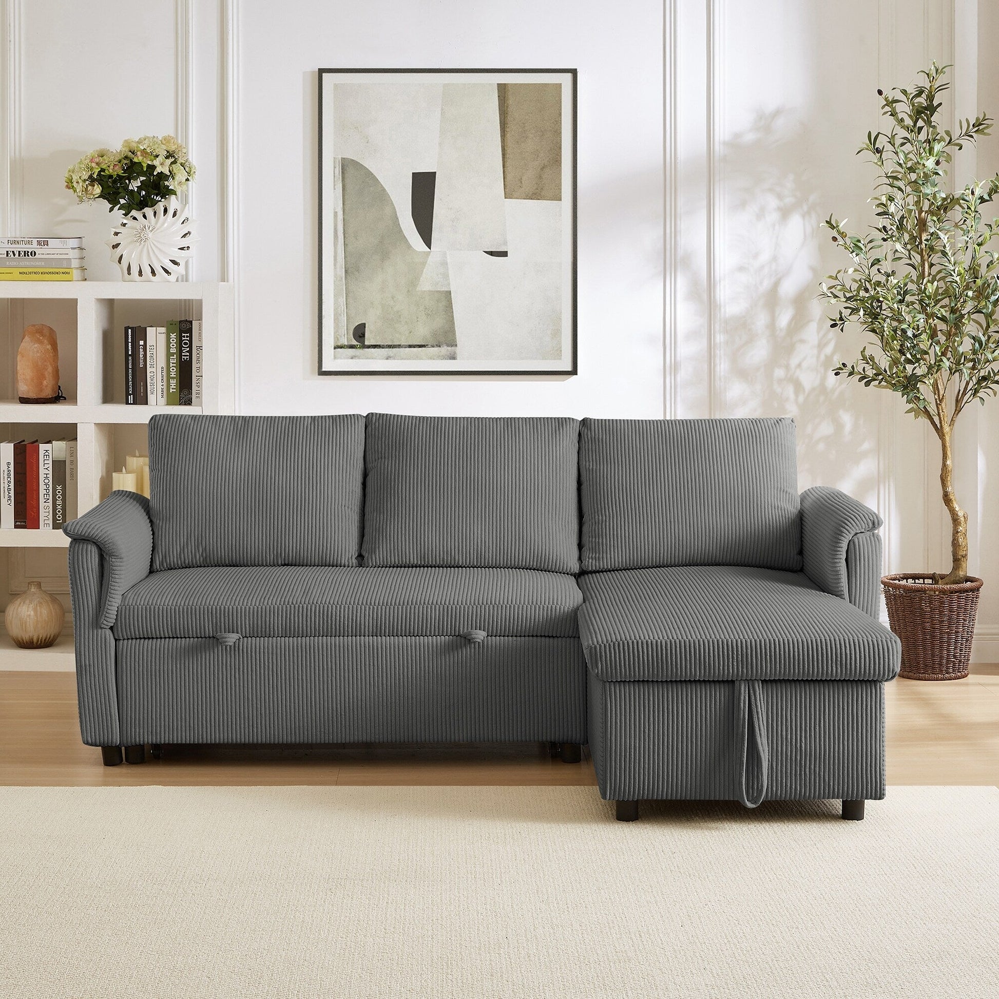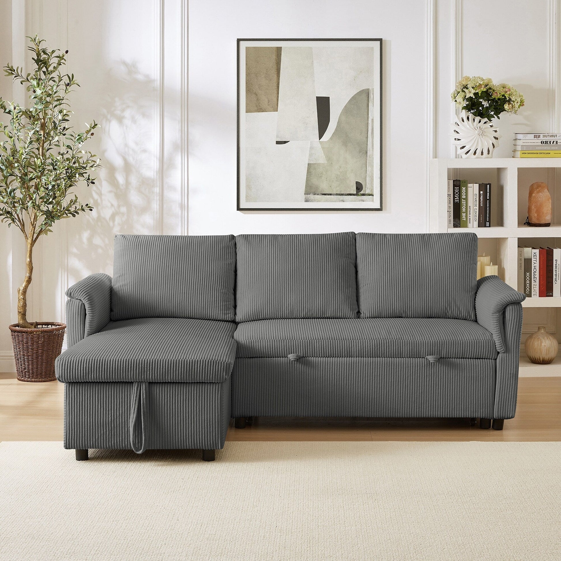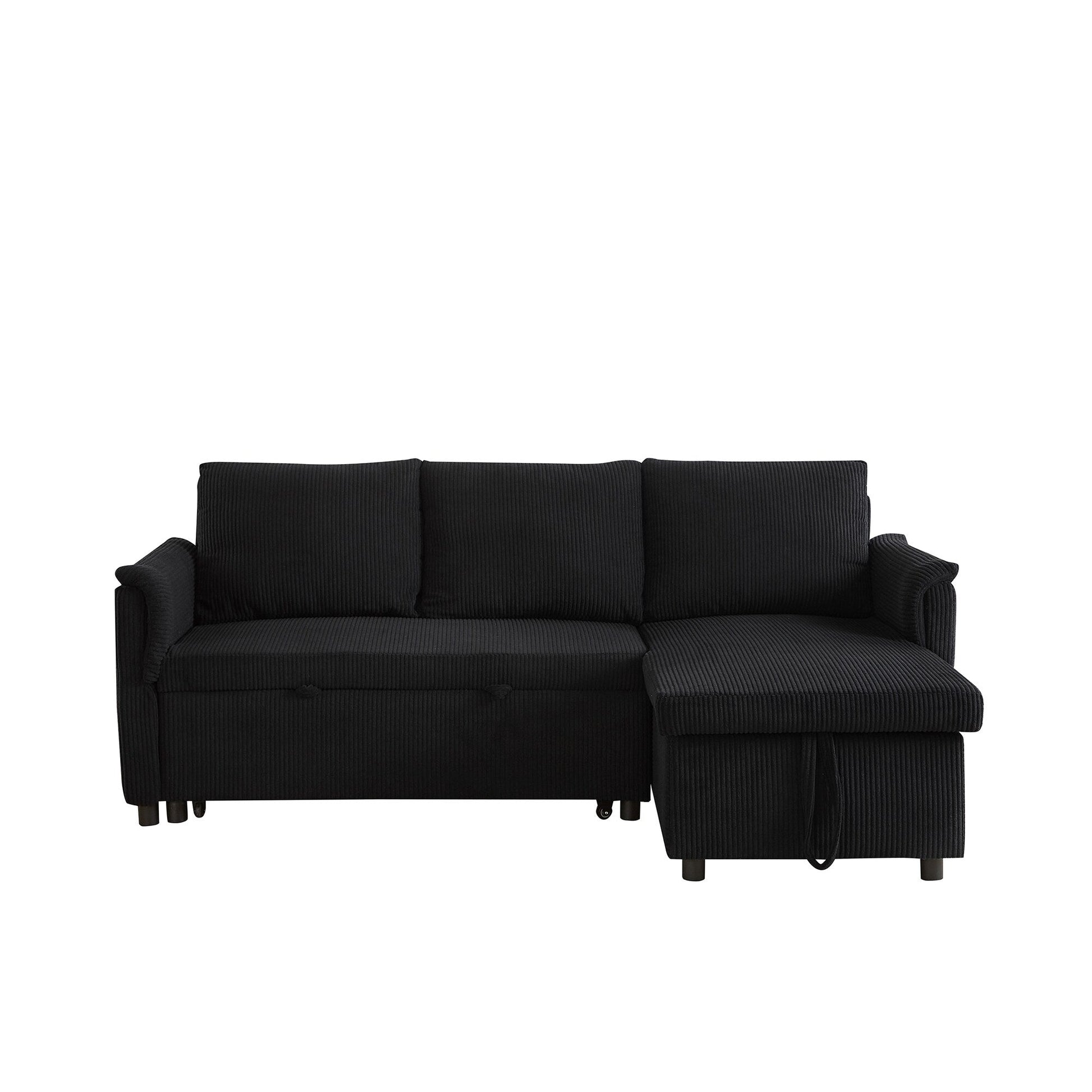 This L-shaped modular loveseat features wide armrests, plush corduroy upholstery, and adjustable backrests for personalized comfort. With a pull-out sleeper, storage chaise, and easy assembly, itâs a versatile piece ideal for living spaces or guest areas.