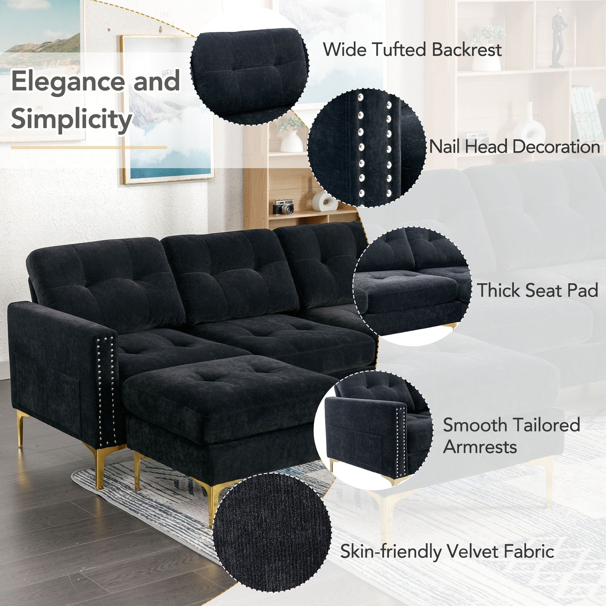 This convertible L-shaped sofa with a movable ottoman brings modern elegance and flexibility to your space. Upholstered in soft velvet with tufted cushions, it features storage pockets, gold-tone legs, and a sturdy frameâdesigned for both comfort and style in any room.