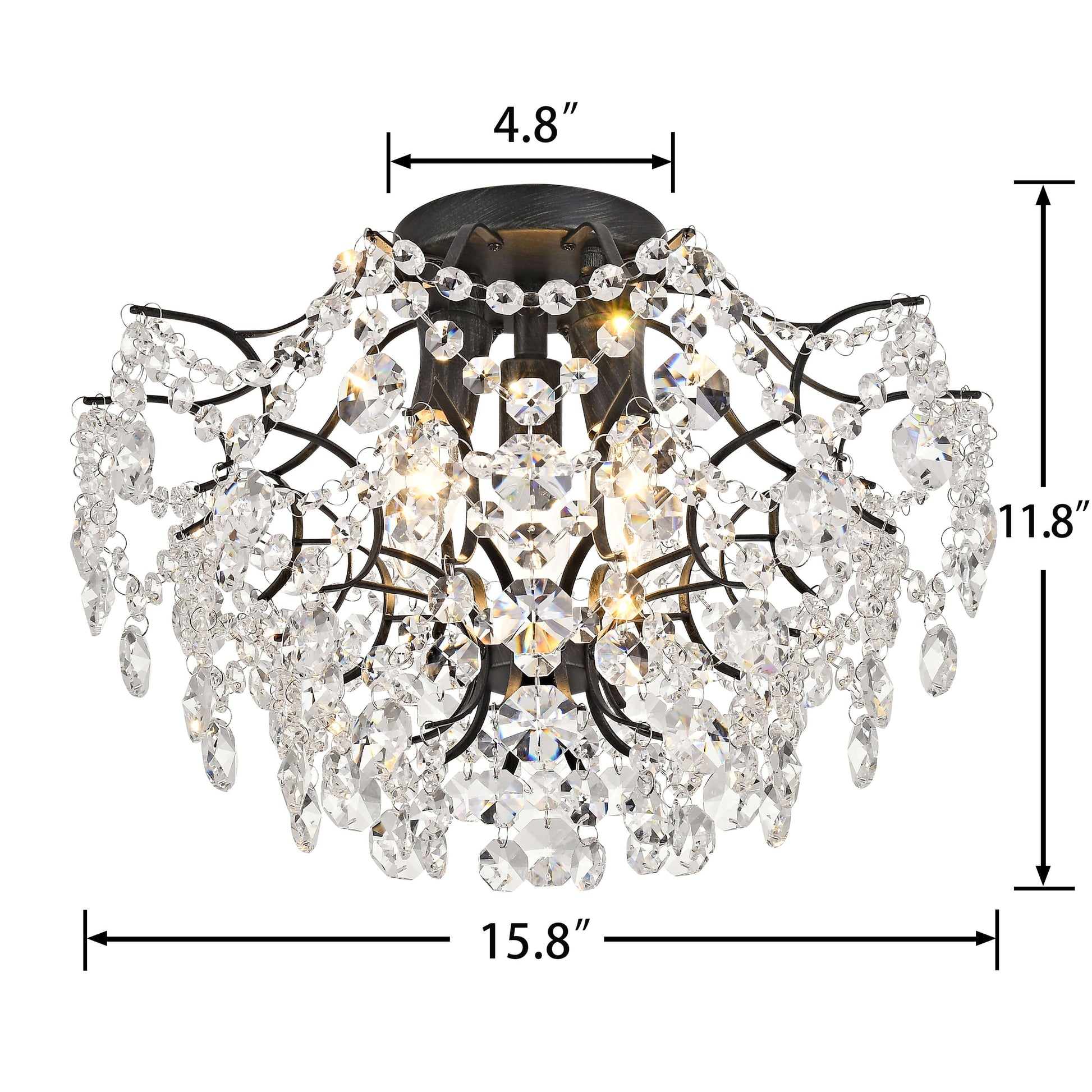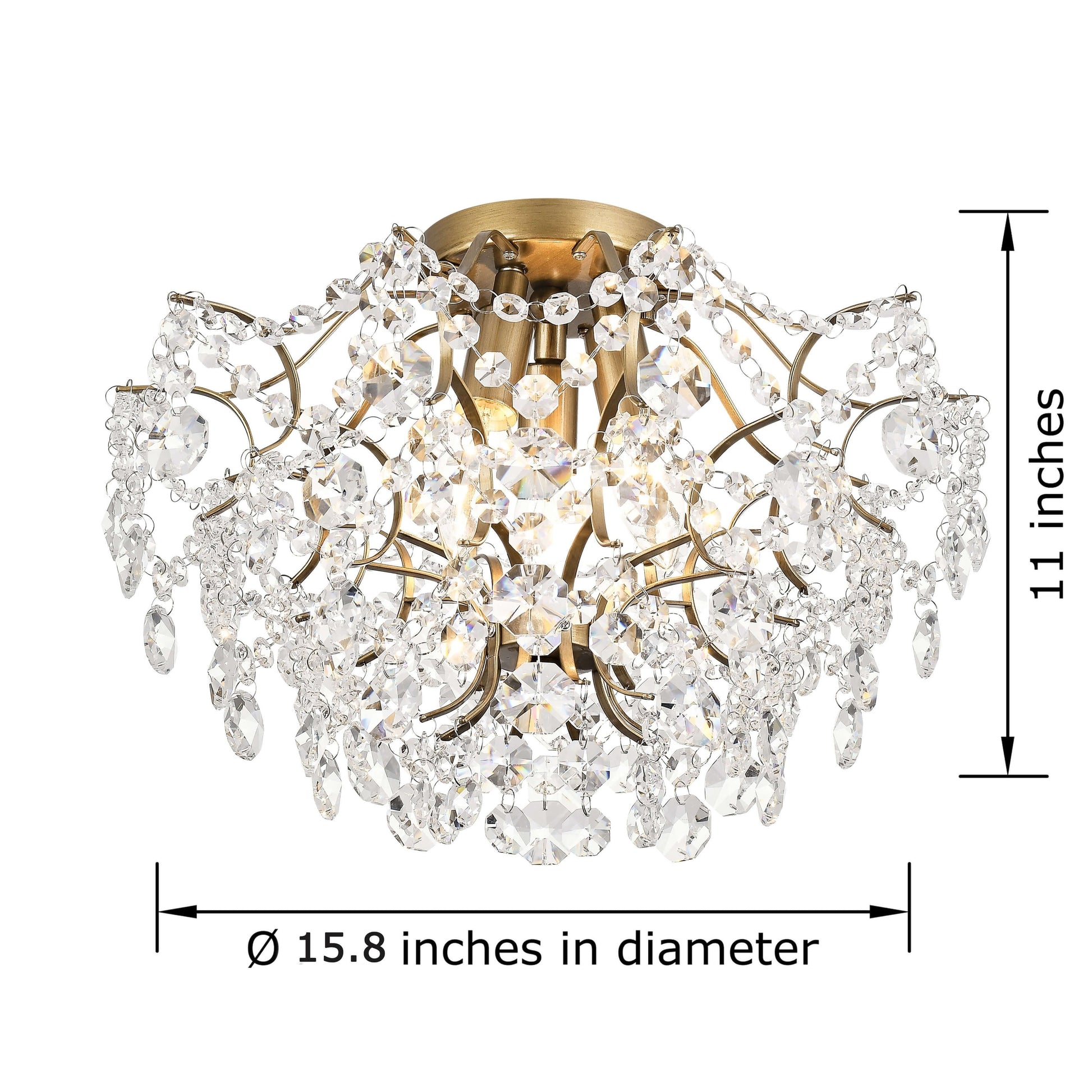Add an elegant touch to your indoor space with the Dalia Elegant Indoor 3-light Crystal Flush Mount. The base color is accented , complementing the clear crystal accents for a sophisticated look. This fixture requires three 60-watt bulbs (not included), and is compatible with incandescent, halogen, or LED bulbs. Its dimensions are 15.8 inches in diameter and 11.8 inches in height, with a ceiling plate measuring 5.1 inches in diameter and 1 inch in height. Please note that this light cannot be installed on a sloped or vaulted ceiling.