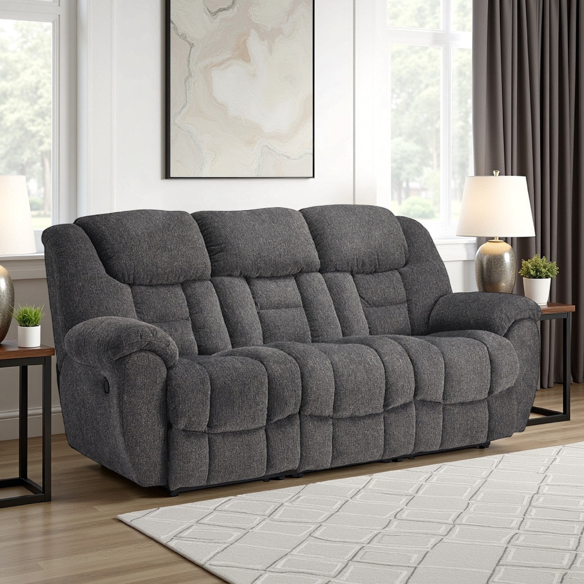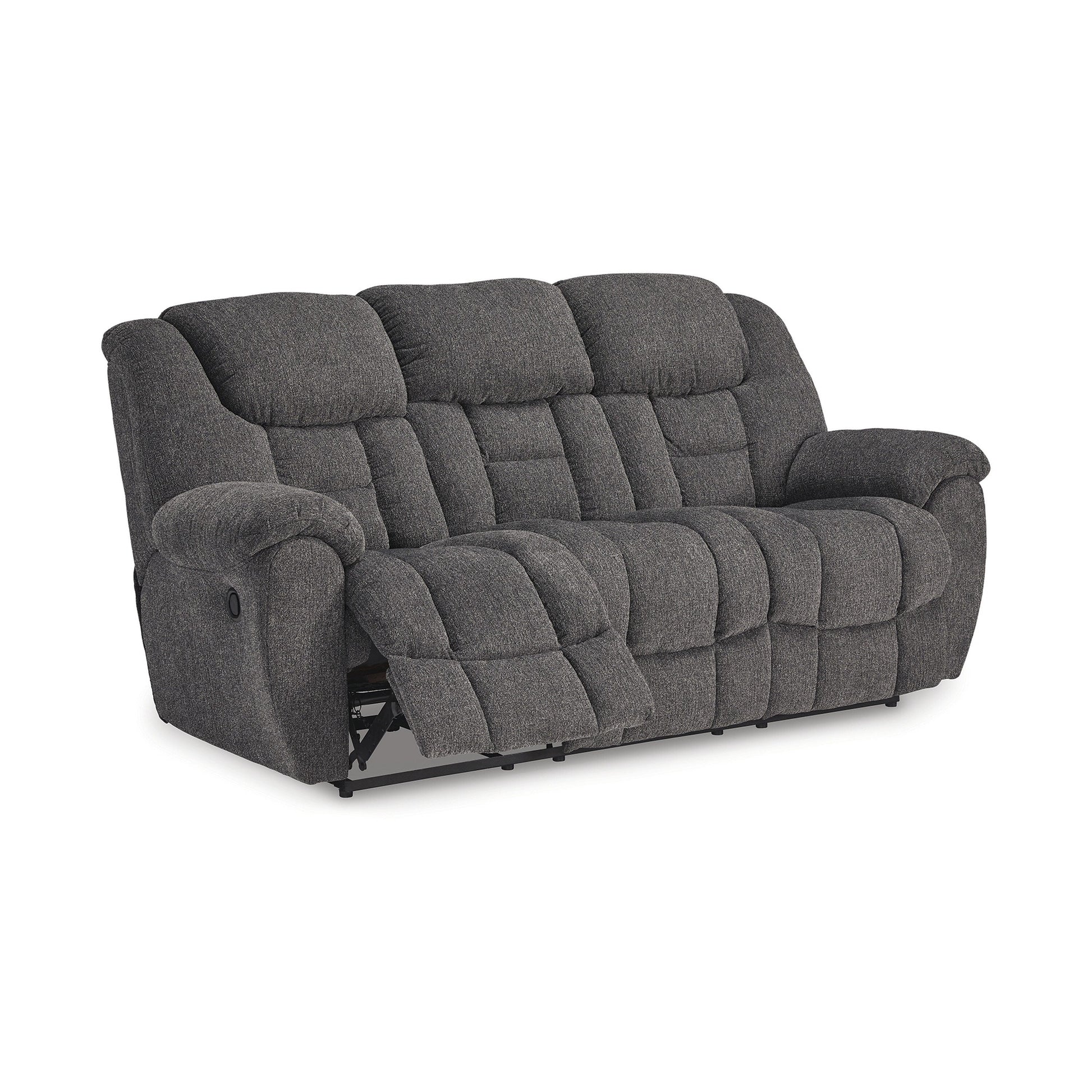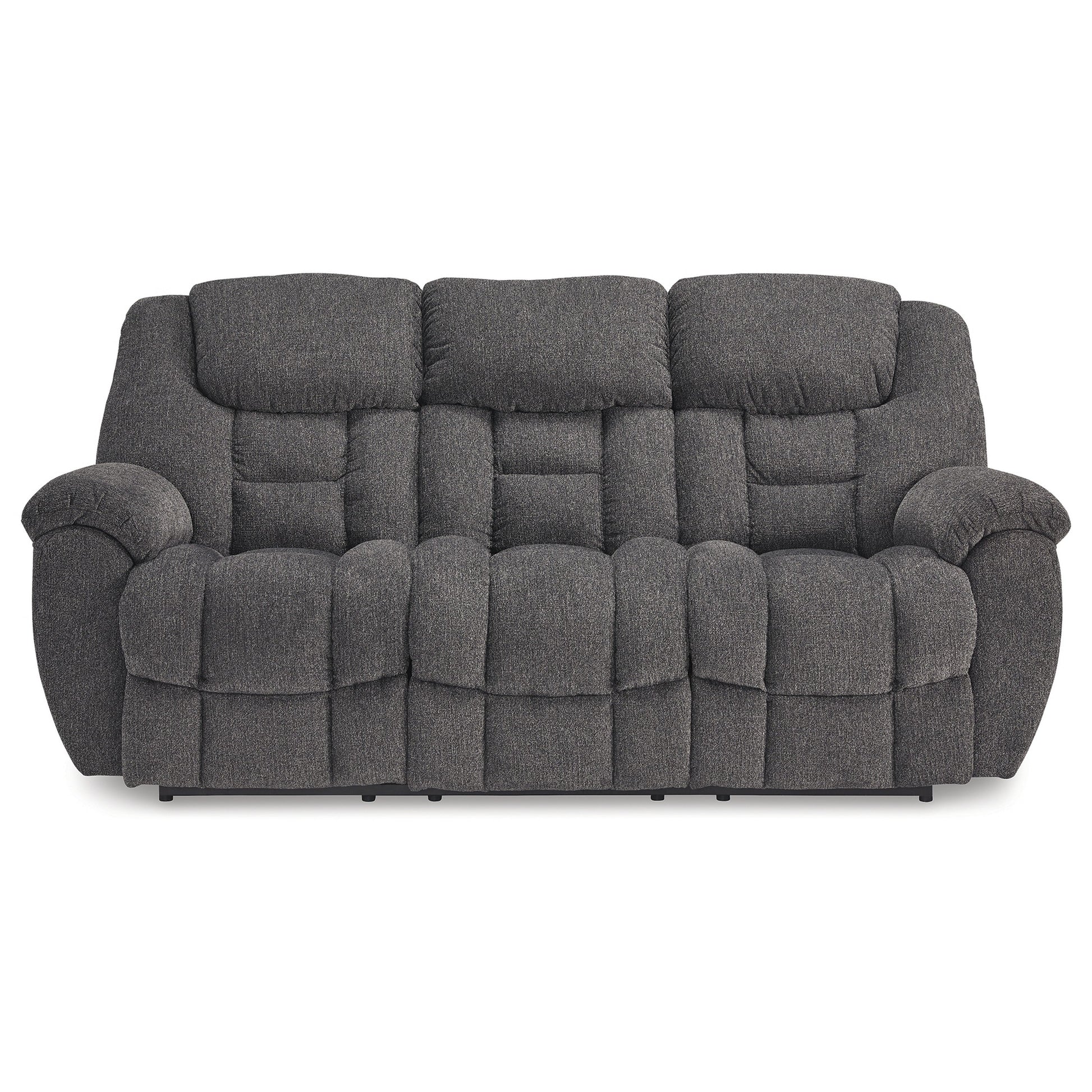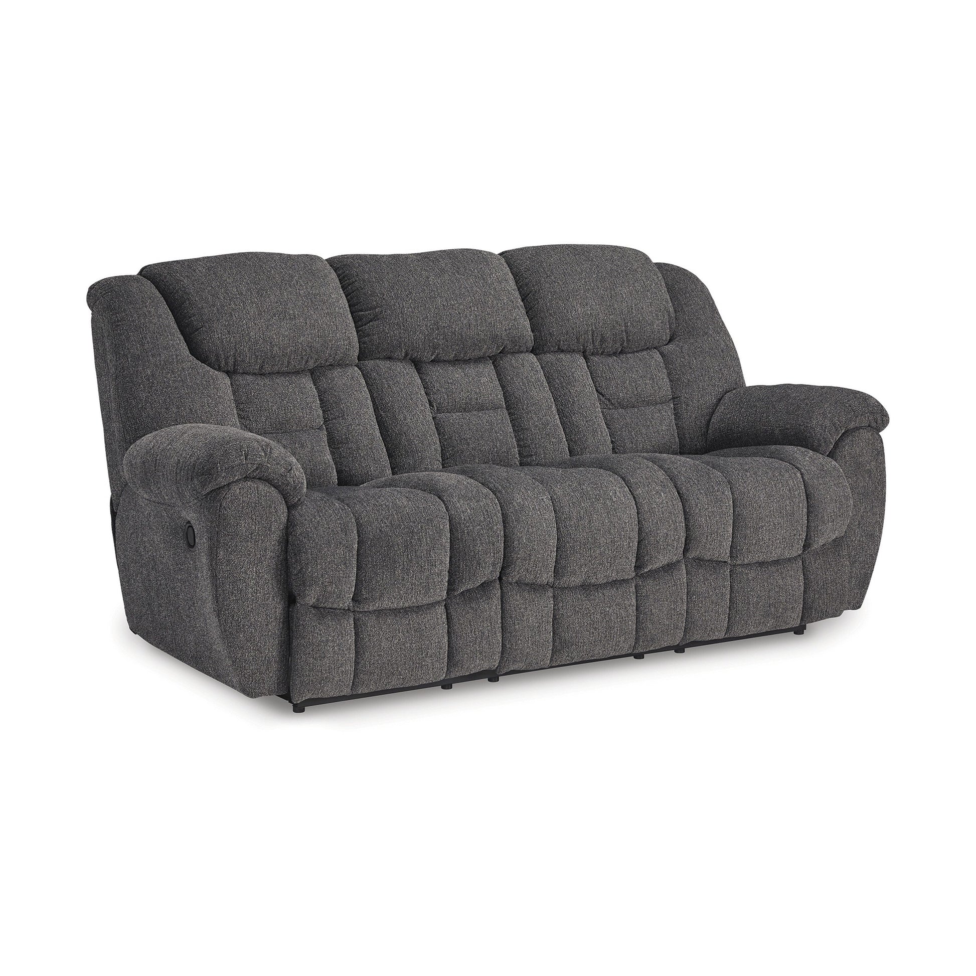 Discover ultimate relaxation with this manual reclining sofa. The polyester upholstery, a soft yet resilient gray fabric, ensures lasting comfort and resistance to stains. Boasting a gentle rocking motion, plush cushioning, and pillow-wrapped armrests, it transforms any room into a haven of luxury. It is designed to deliver maximum comfort with style. Check out our Dane collection for more.