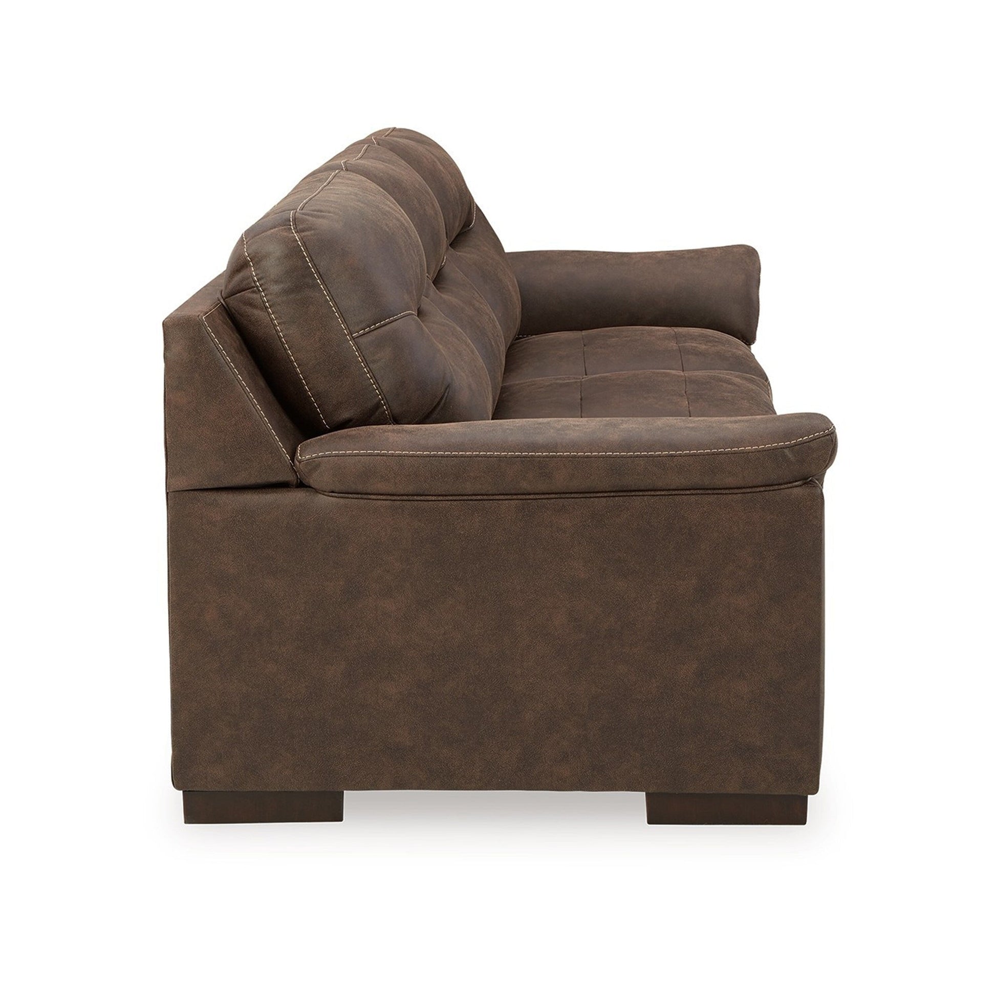 Elevate your living space with this sofa, a perfect blend of style and comfort. Its faux leather upholstery offers a rich walnut brown hue with natural tonal variations, while jumbo stitching and tufted details add a refined touch. The high-resiliency foam cushions and pillow top arms provide plush relaxation, making it a chic yet cozy addition. Check out our Danie collection for more options.