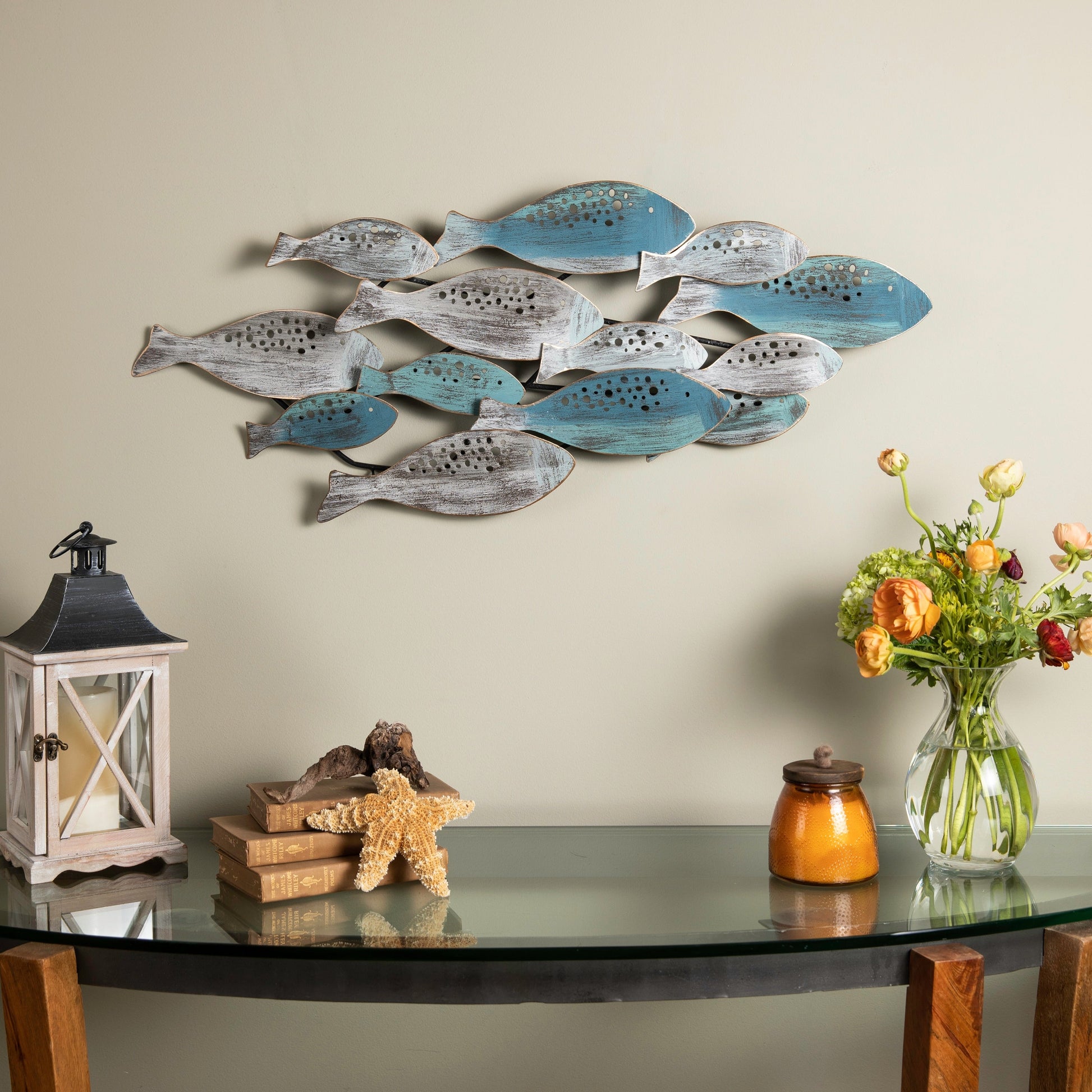 Bring the calmness of coastal living into your home with the Danya B. School of Fish Modern Coastal Metal Wall Art. This elegant wall décor is perfect for adding visual interest to a living space or livening up a boring wall. The metal-shaped fish figurines are painted in varying shades of blue and aqua with a distressed finish, creating a stylish piece that is perfect for beach houses, coastal establishments, or anyone who loves the sea. Crafted from metal and ready to hang with built-in hooks, this piece is perfect for any room with coastal, nautical, beach, or boat décor.
