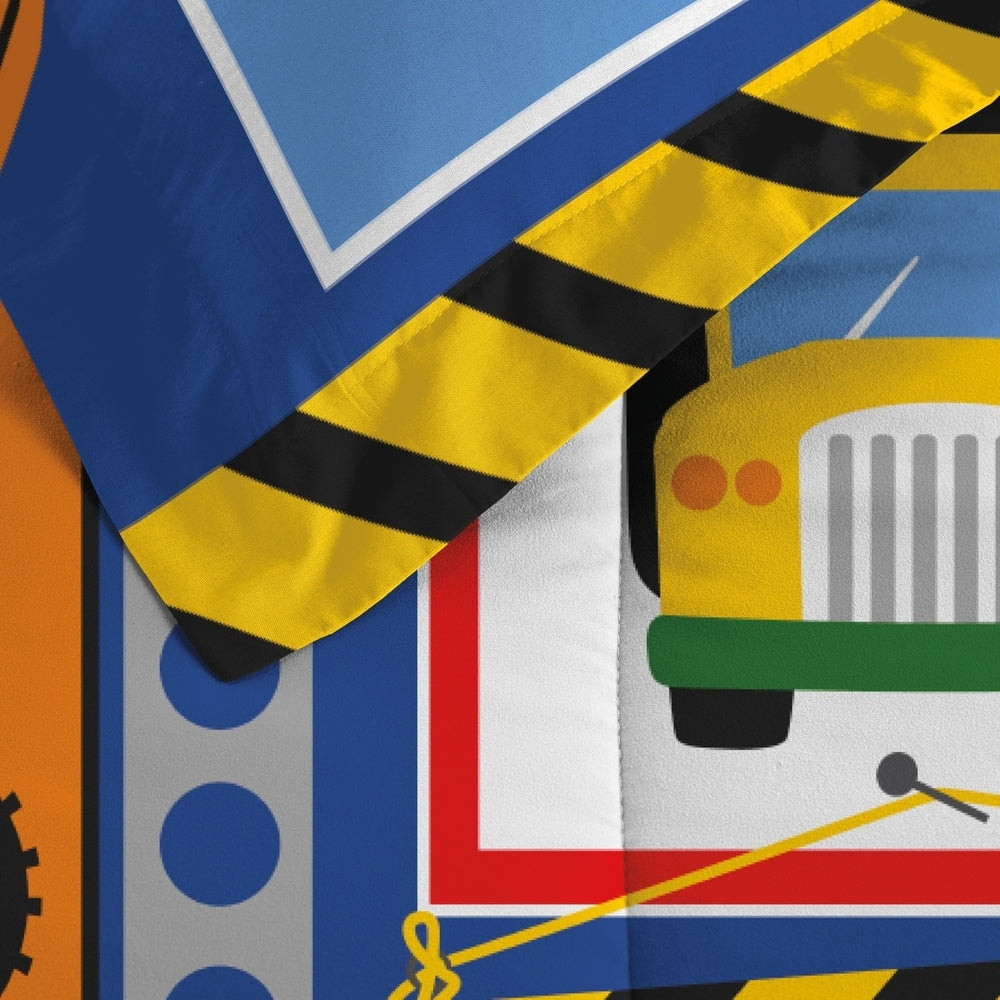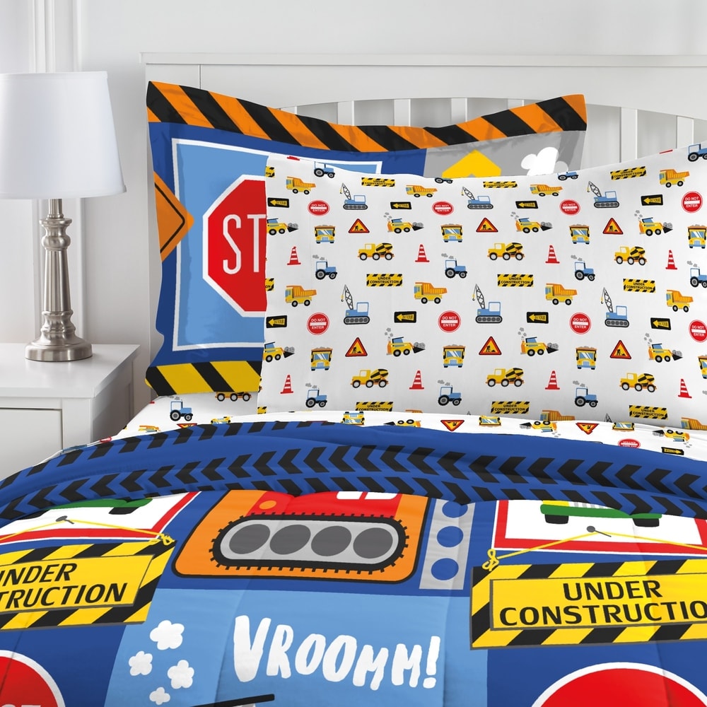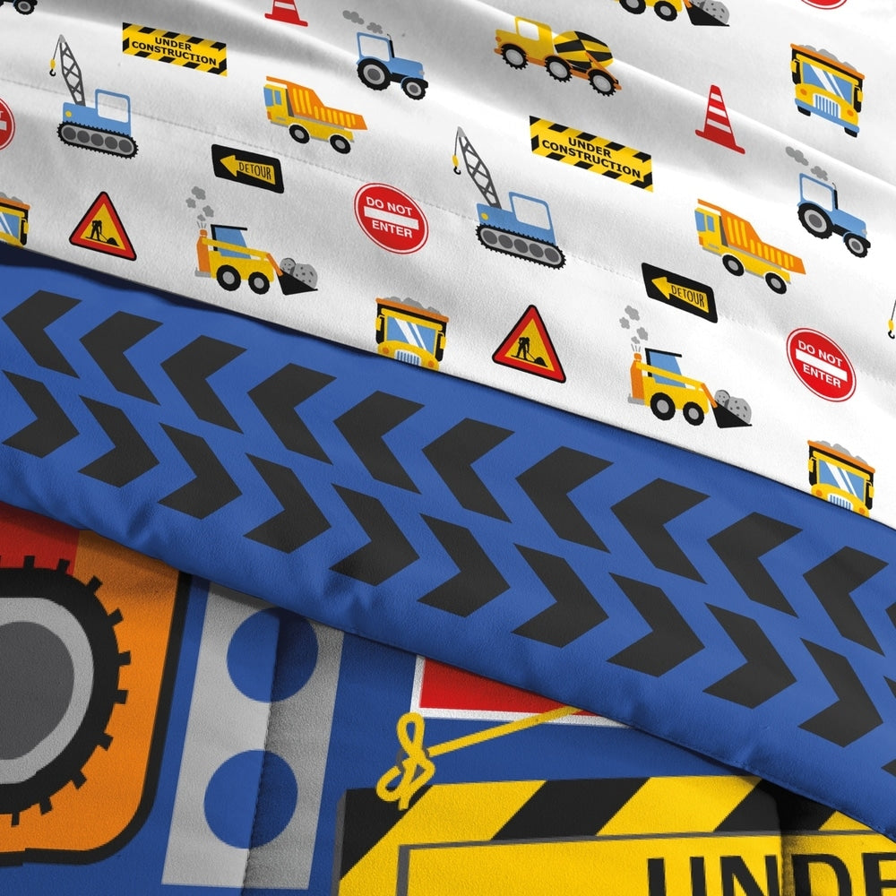 Brighten up your little one's bedroom with this bold Under Construction complete bedding set. Comforter and shams are highlighted by construction vehicles and road work signs for a fun look. This set is perfect for children who love construction trucks, dump trucks and bulldozers. After your child's long day of play, they will be excited to jump into this 100% microfiber comforter set. Your child will love the softness of microfiber and you will love how easy it is to care for this fabric. This bedding set is conveniently machine washable for easy care. Easily change up the look in your child's bedroom by adding coordinating curtains, throw pillows and wall art. The snuggly soft comforter is stuffed with 100% polyester fill for comfort. This bedding set is perfect for year-round and any season. Offered in your choice of available sizes, Twin or Full.