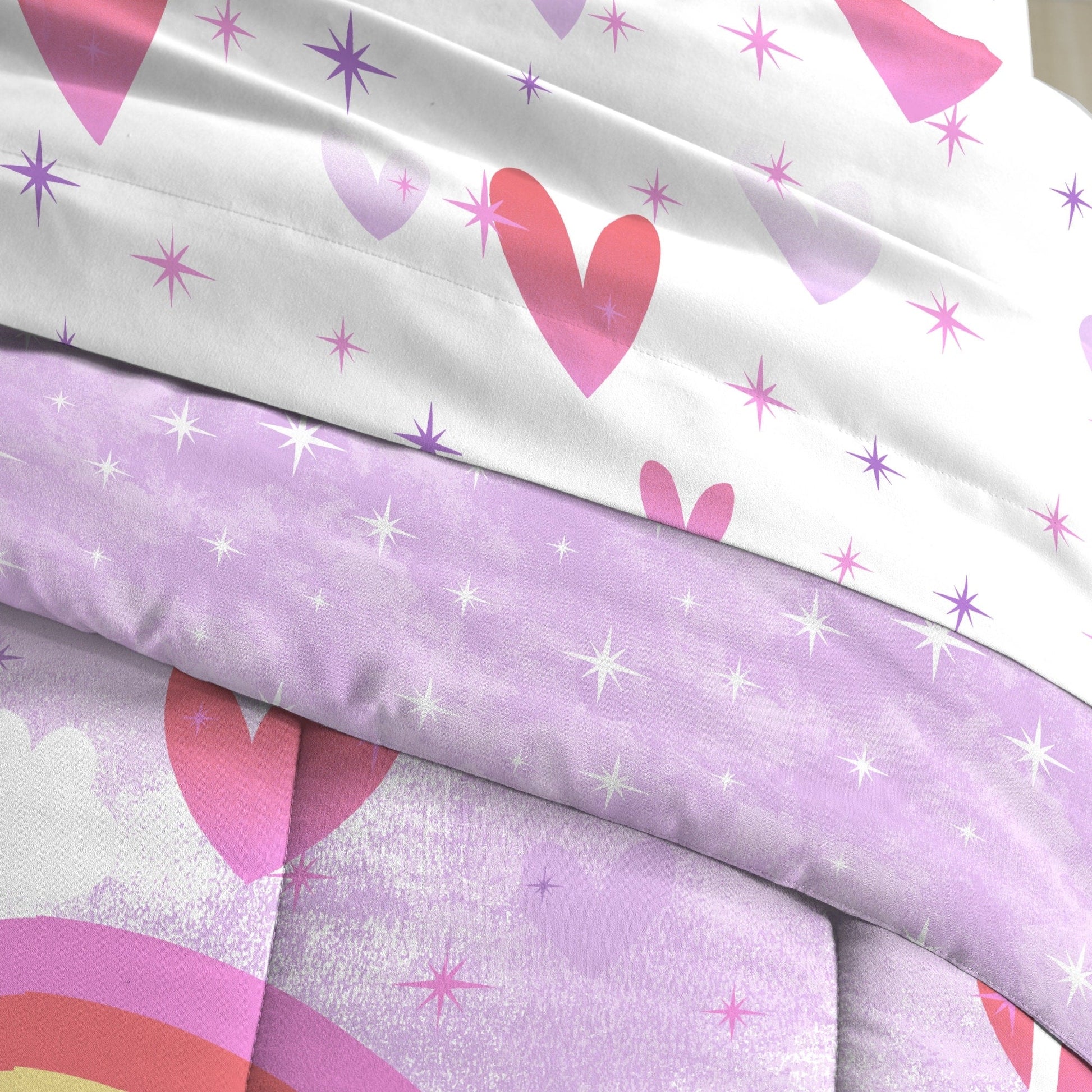 Create a magical and colorful bedroom for your little princess with Dream Factory's Unicorn Rainbow Bed in a Bag set. This complete bedding set features a whimsical design of rainbow unicorns, hearts, and clouds on a pink background, perfect for sparking your child's imagination. The microfiber comforter, sham, and sheet set are incredibly soft to the touch and easy to care for with machine washable materials. The comforter is stuffed with 100% polyester fill for year-round warmth and comfort. With coordinating curtains, throw pillows, and wall art, you can easily transform your child's room into a unicorn-themed wonderland.