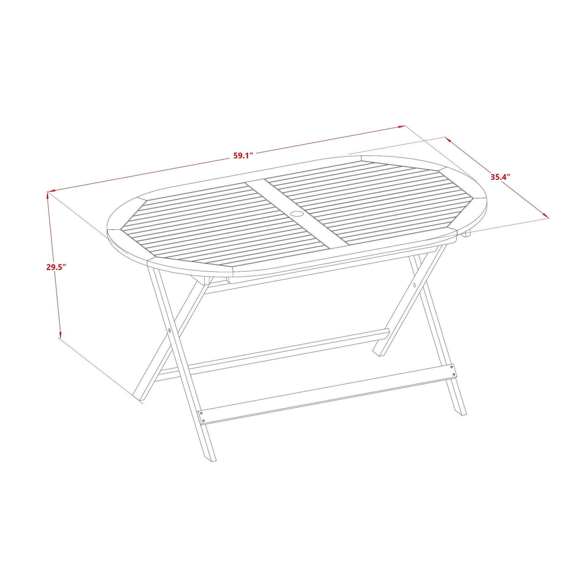 Our outdoor set includes 1 modern table and outdoor folding chairs that could sit up 4 to 6 people easily. Enjoy your family time with this lovely patio folding dining set. This bistro patio set is made with fine Acacia Wood for durability and endurance. This Oval-shaped modern table is developed in a distinctive style with unique features, and bistro chairs will attract everyone who comes to the patio area, and arms are very suitable for use. The modern patio chairs also have armrests to keep your arms at a comfortable level as you can enjoy your favorite outdoor spaces. This patio folding dining set also features a convenient folding function that provides easy storing when it's not in use. The sturdy wood structure maintains its looks and beauty throughout the seasons. The outdoor folding chairs contain X-style legs to offer the greatest reliability. This outdoor dining table set appears like a decorative addition for your garden, balcony, or outdoor. Our outdoor patio set is easy to clean using a wet fabric. Each patio dining table set comes conveniently with easy-to-follow guidelines and all required gadgets included. You need to follow the procedures in the handbook to complete the installation in a short time.