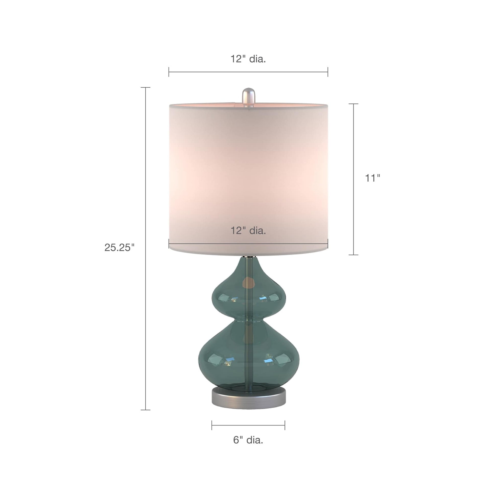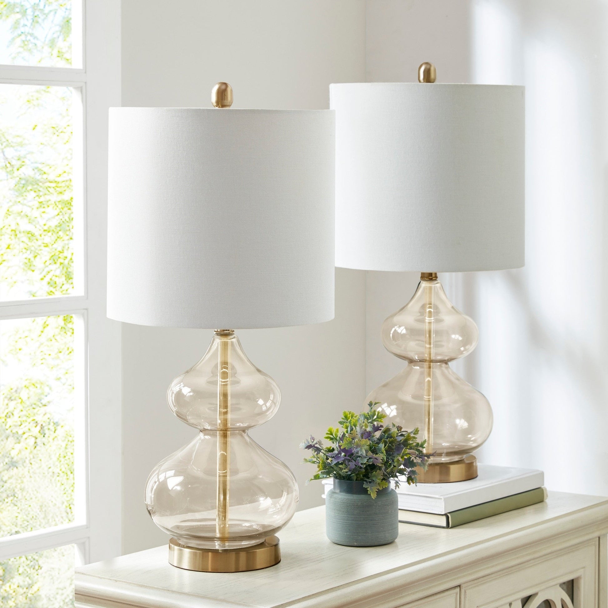 The 510 Design Ellipse Table Lamp Set brings modern elegance to any space. This set of 2 lamps features double-stacked gourd-shaped glass bases with polished surfaces and brushed gold metal accents. The translucent glass softly diffuses light for a warm, ambient glow. Each lamp is topped with a white fabric drum shade and a gold metal finial for a sophisticated touch. Designed for versatility, they provide both upward and downward lighting and include two energy-efficient 9W LED bulbs. Perfect for living rooms, bedrooms, or home offices. Spot clean only. Includes a 2-year limited warranty.