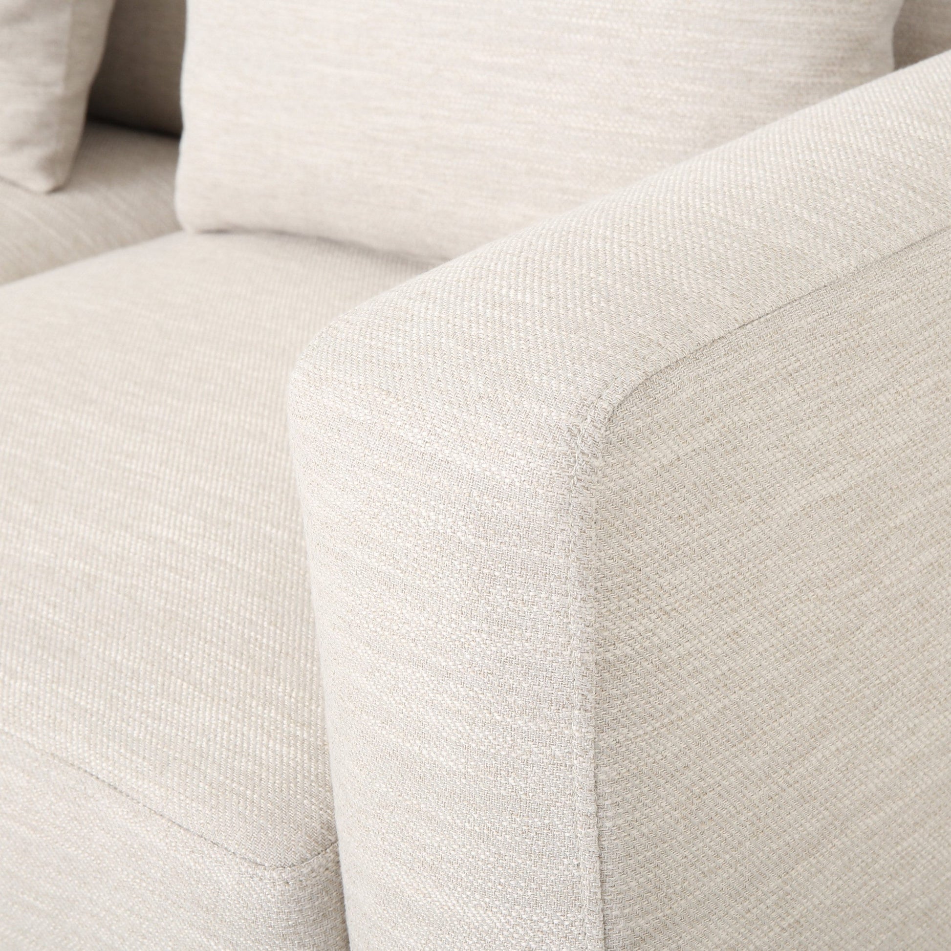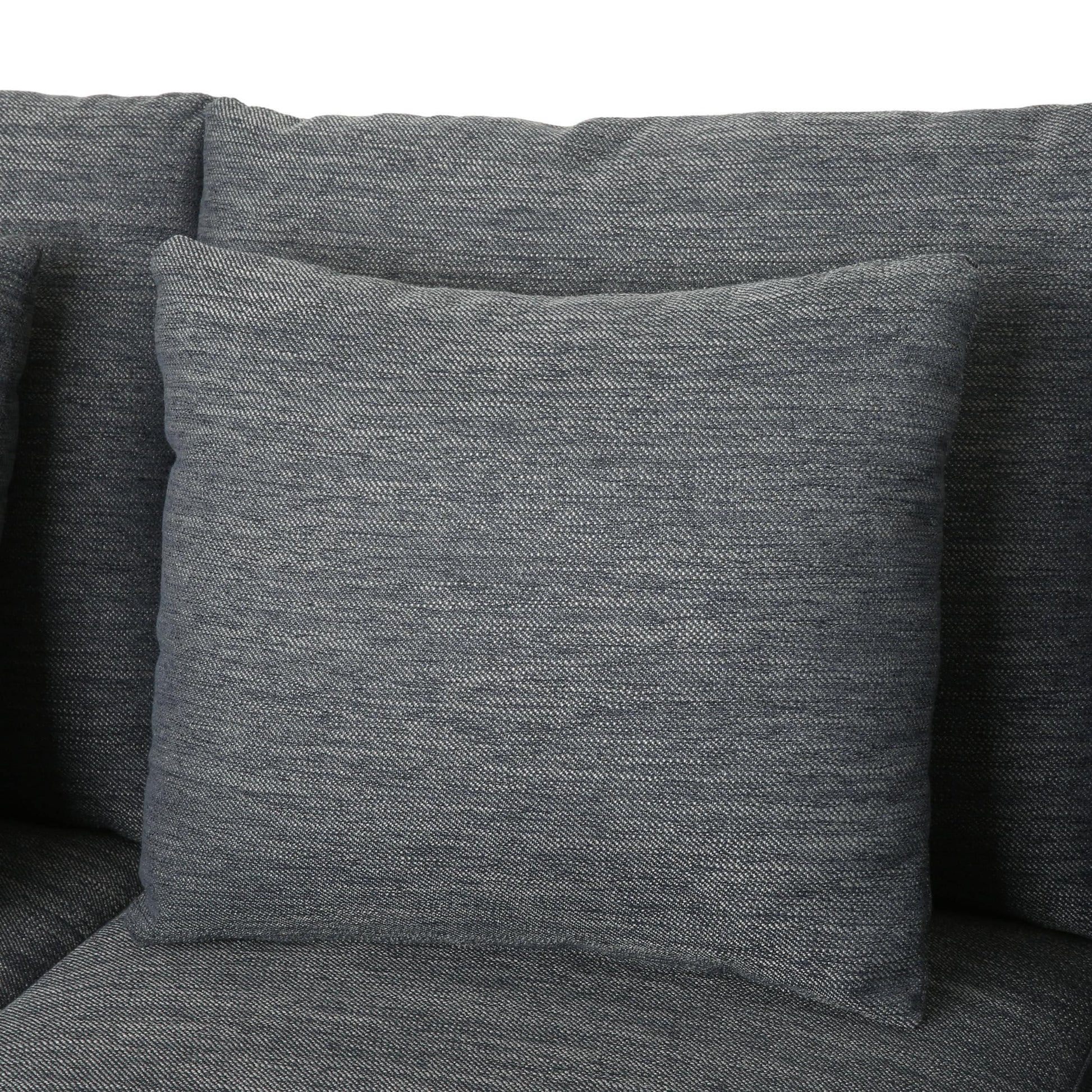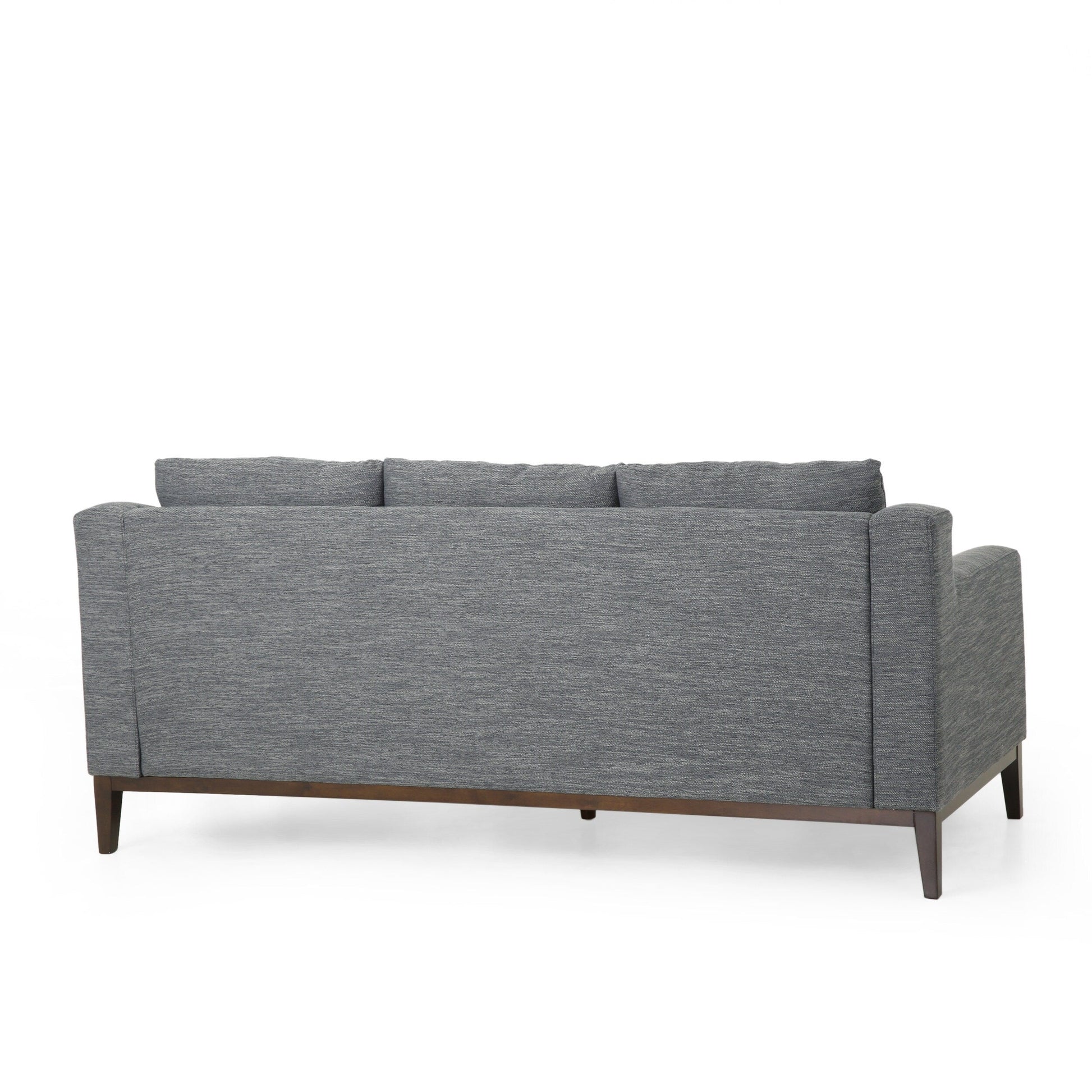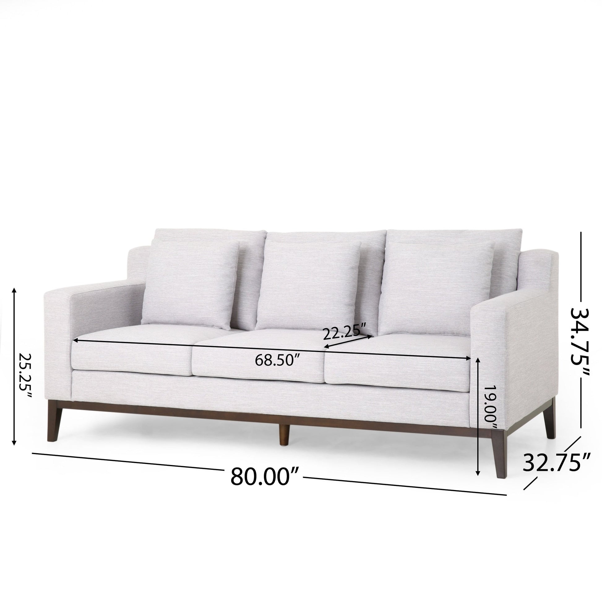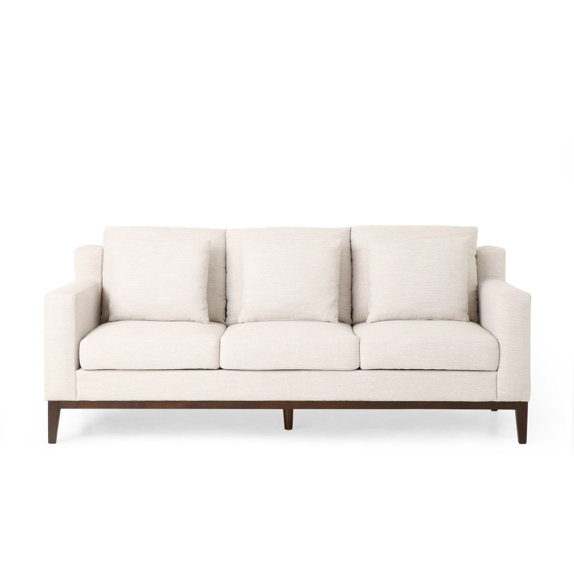 Modern lines and comfortable style define this beautiful 3-seat sofa. The sofa features a sturdy wood frame with track arms, tapered legs, and a stream-lined design that offers minimalist sophistication. The sofa is upholstered in smooth polyester fabric with plump seat and back cushions and matching accent pillows for a touch of timeless charm.