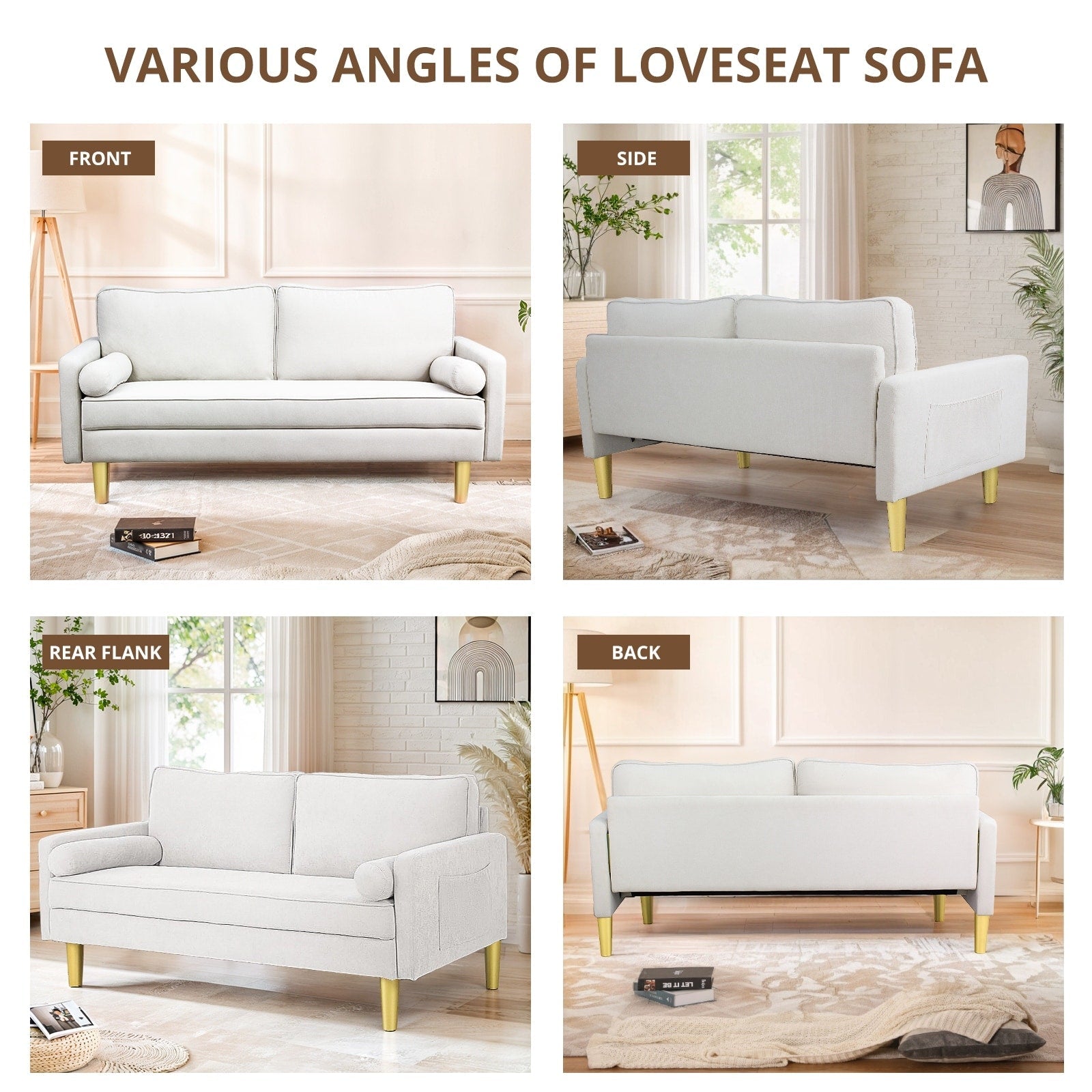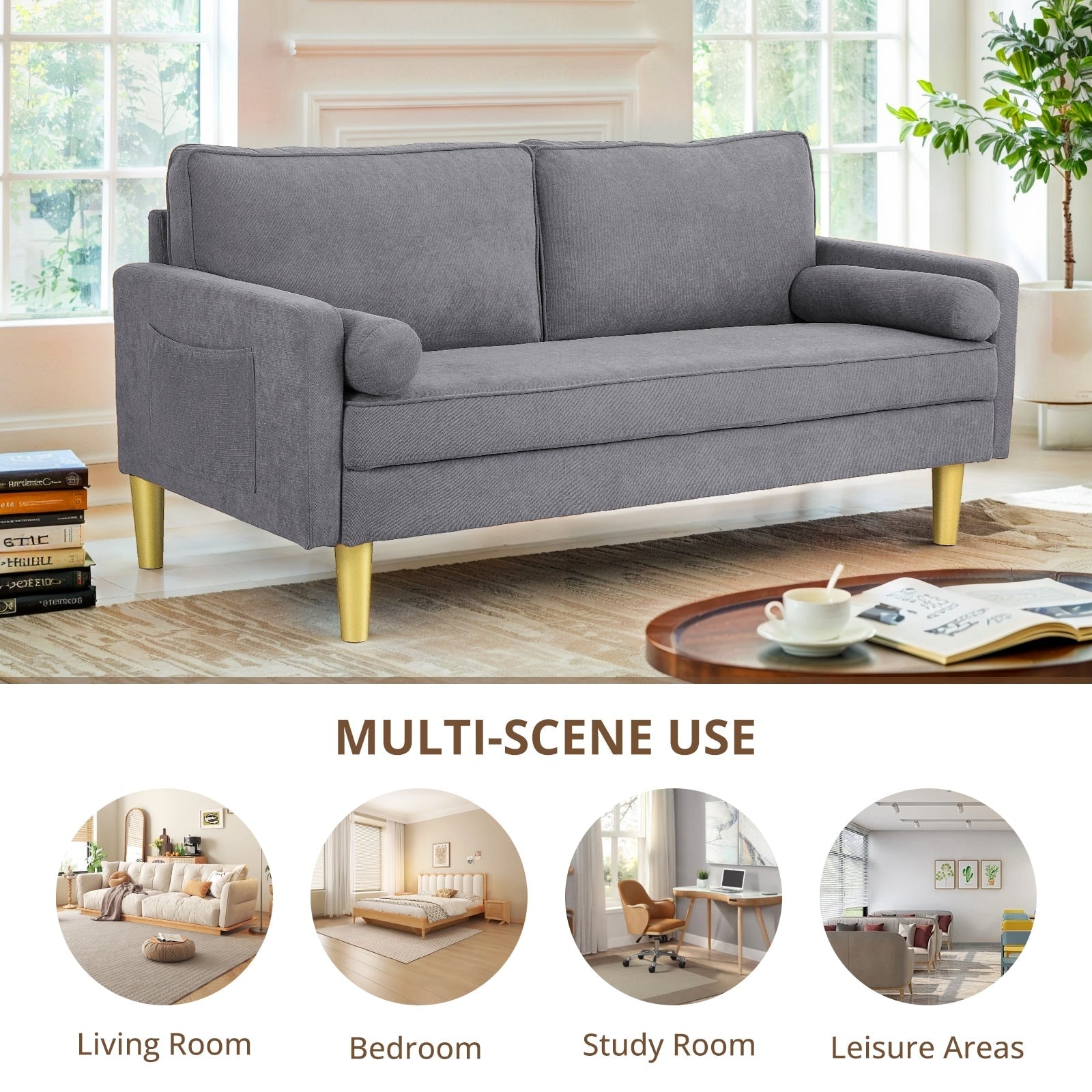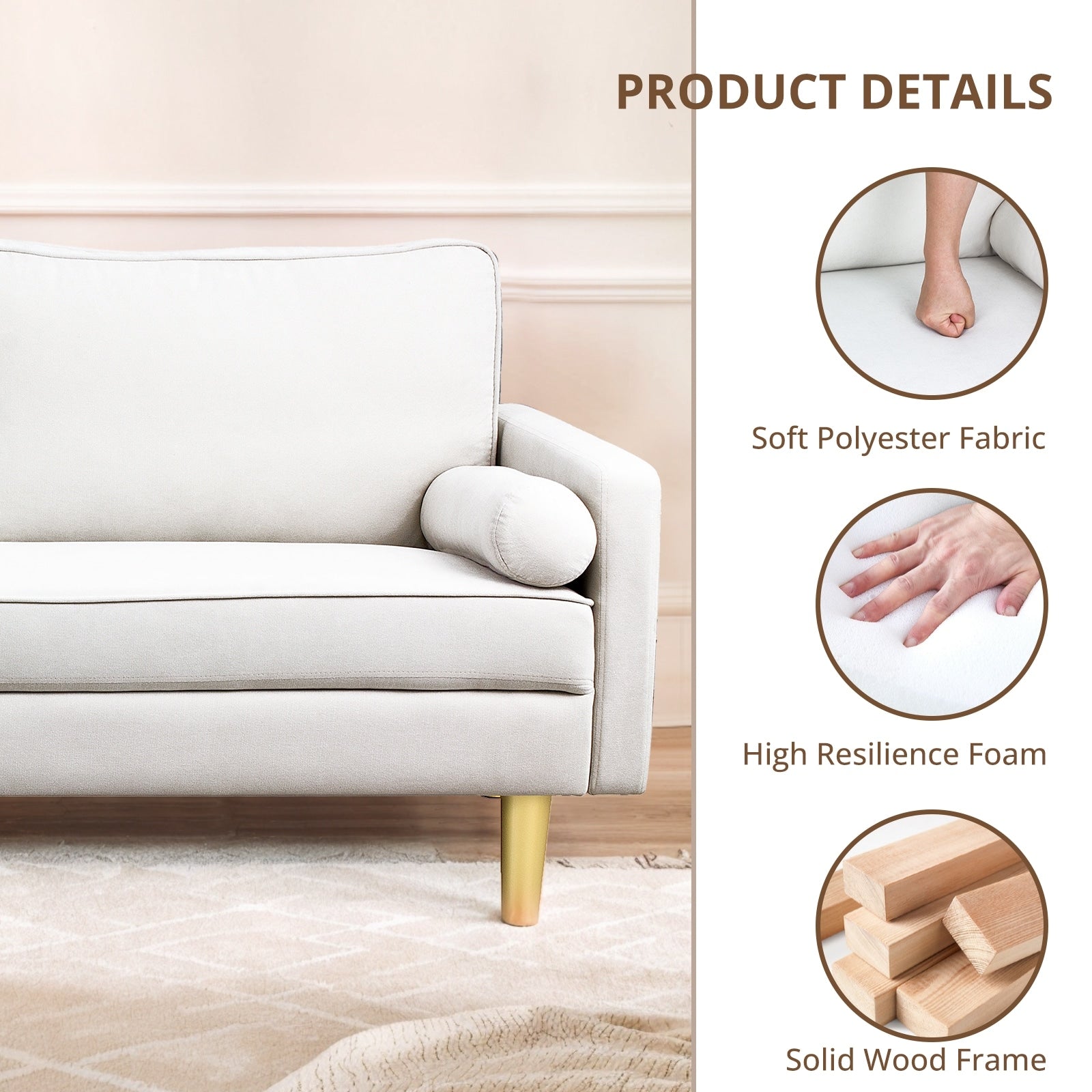 Introducing our comfortable loveseat, made with breathable and skin-friendly polyester fabric to ensure a pleasant seating experience. The seat and back are padded with high-quality foam and serpentine springs, and the sturdy solid wood frame and durable metal legs ensure stability and durability, and can easily support up to 500 pounds. Designed for versatility, this sofa features two convenient side pockets for easy access to your essentials, while two bonus round cushions provide additional body support. The space-saving compact loveseat is ideal for your living room, bedroom or any small space.