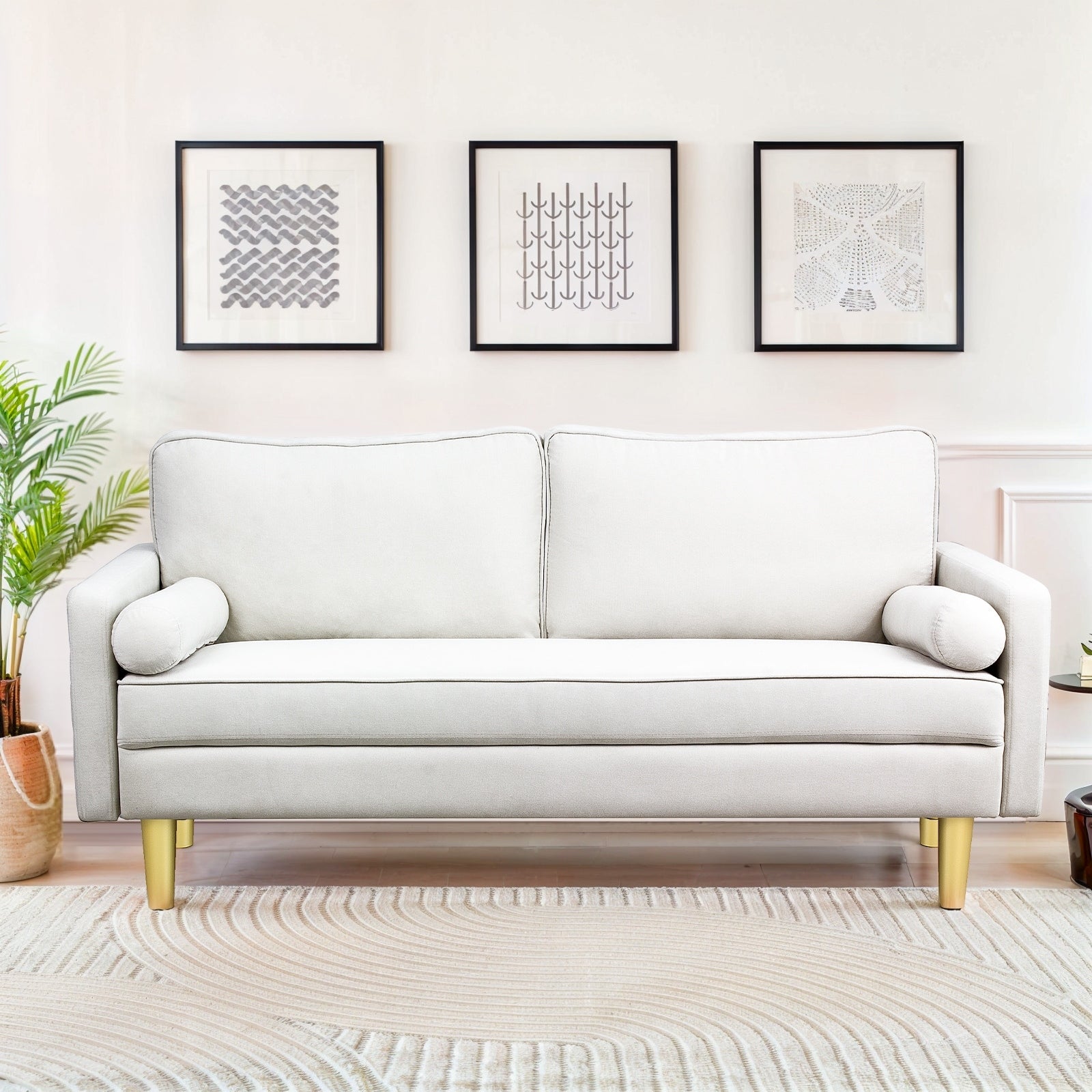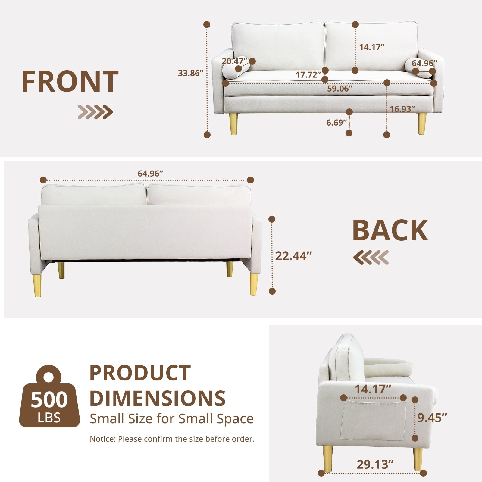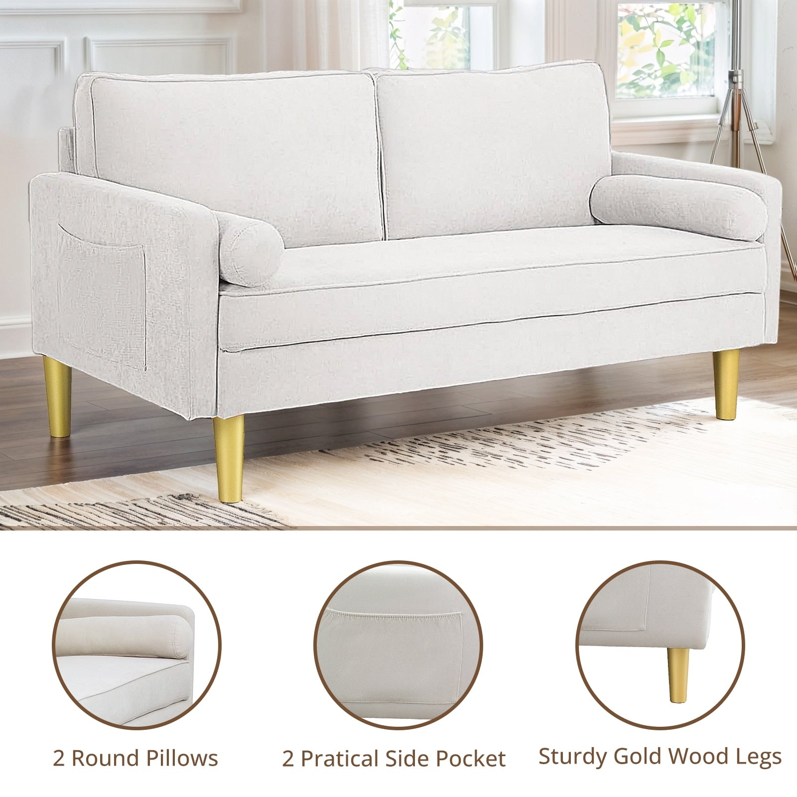 Introducing our comfortable loveseat, made with breathable and skin-friendly polyester fabric to ensure a pleasant seating experience. The seat and back are padded with high-quality foam and serpentine springs, and the sturdy solid wood frame and durable metal legs ensure stability and durability, and can easily support up to 500 pounds. Designed for versatility, this sofa features two convenient side pockets for easy access to your essentials, while two bonus round cushions provide additional body support. The space-saving compact loveseat is ideal for your living room, bedroom or any small space.
