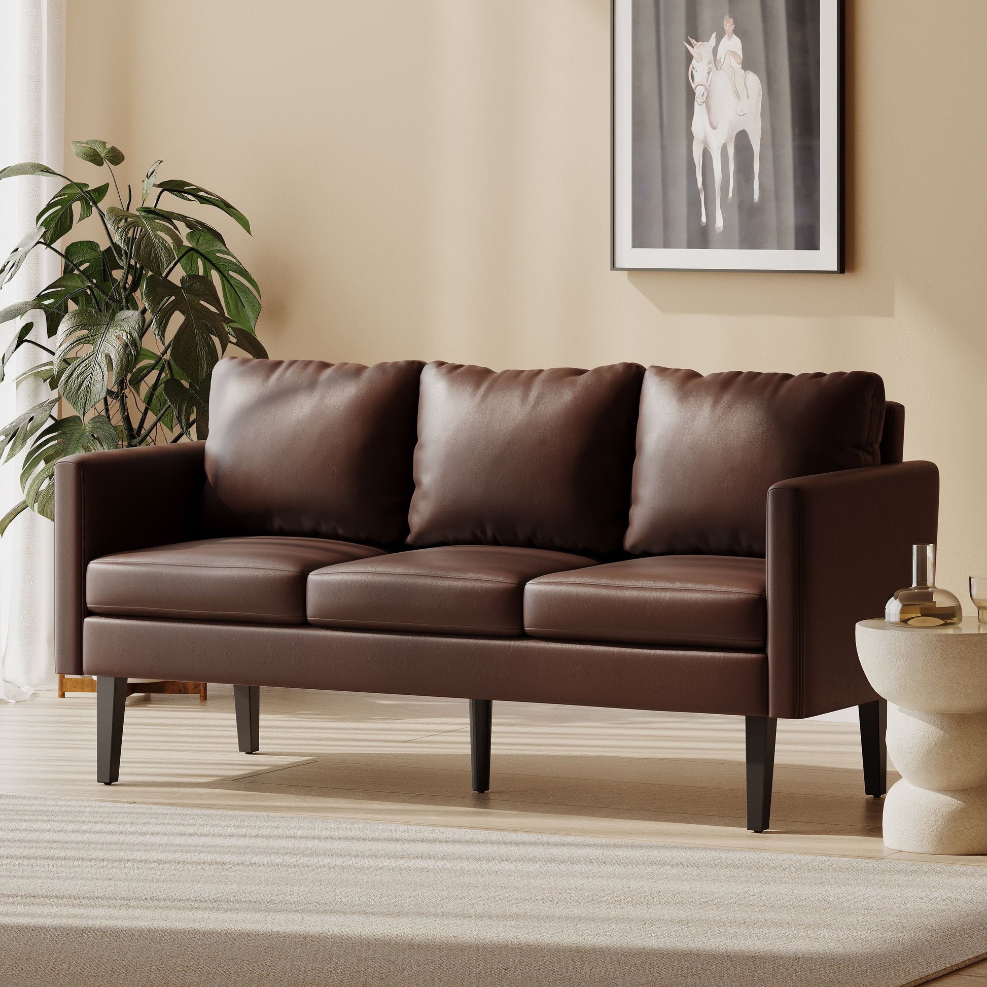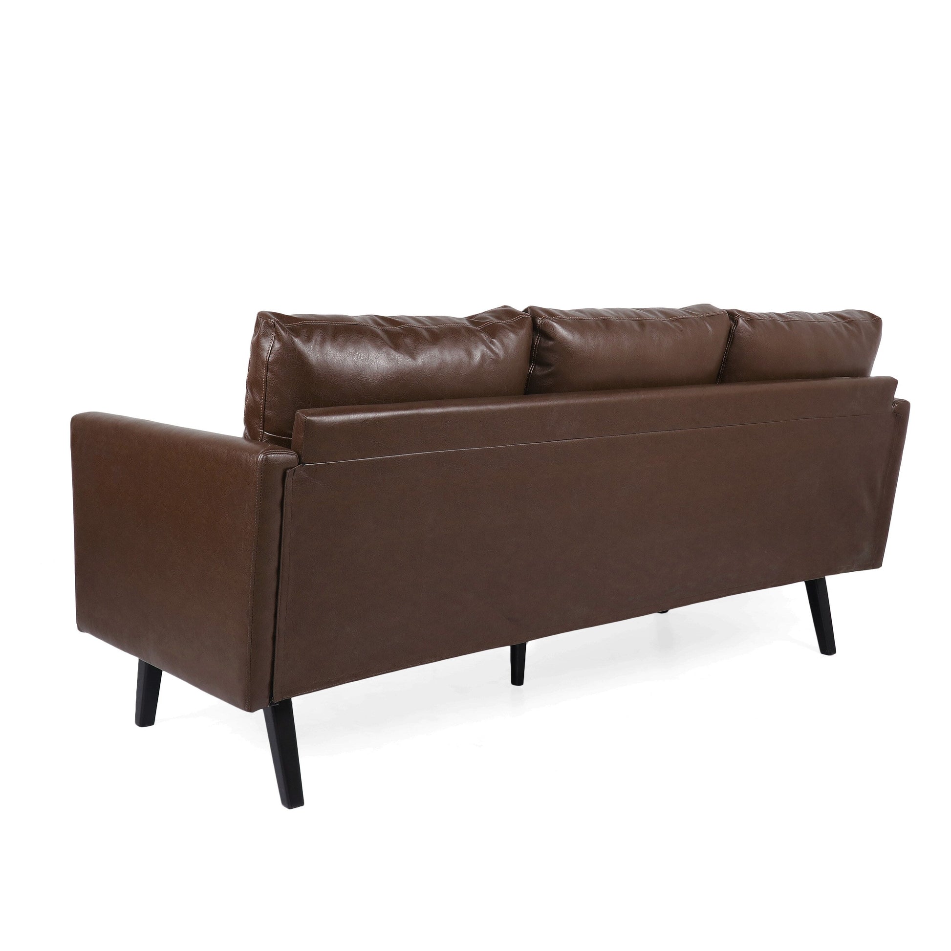 MID-CENTURY DESIGN: Blending together long tapered legs with rich faux leather upholstery, our sofa offers a mid-century look to your lounge space. With its clean lines and understated look, this three-seater sofa uses new materials to reimagine a traditional design.
