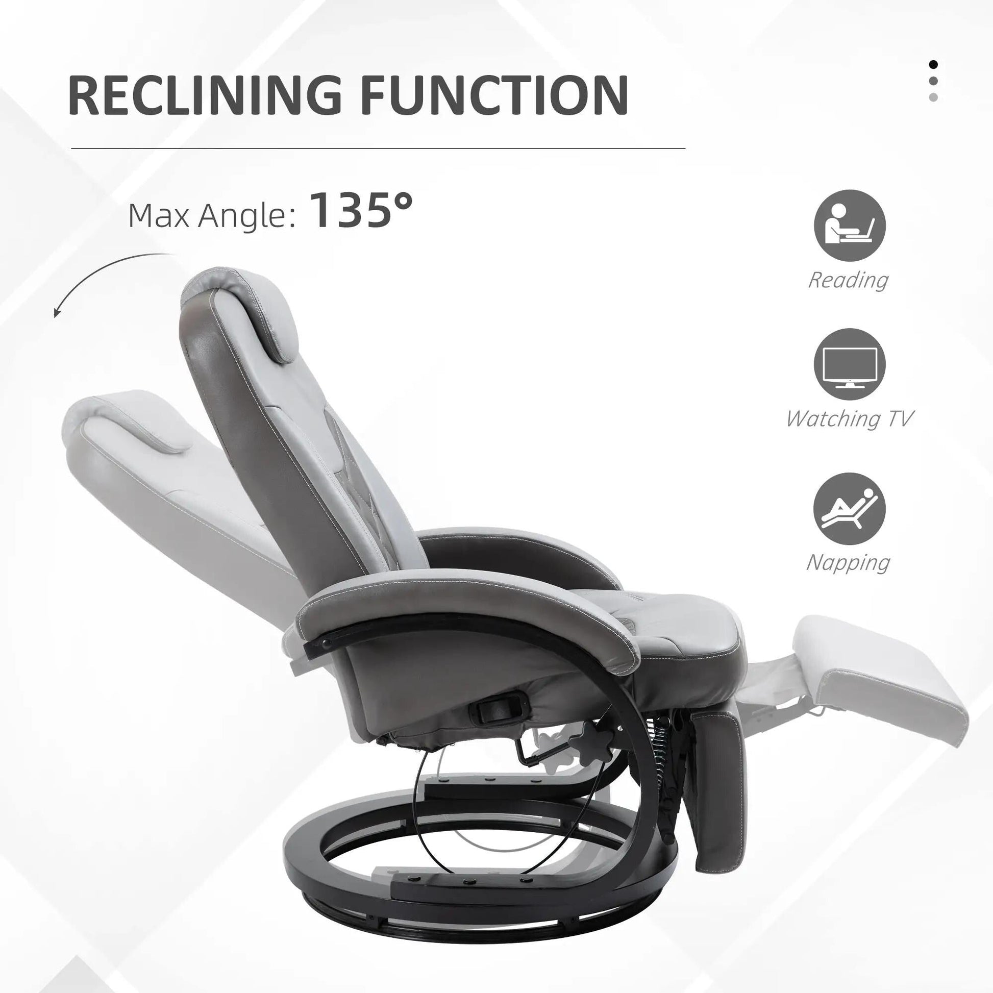 Experience ultimate relaxation with this versatile reclining swivel chair. Featuring an adjustable backrest that tilts up to 135 degrees and a built-in footrest, it provides personalized comfort for lounging, watching TV, or gaming. The 360° swivel functionality ensures effortless movement, while the soft PU leather upholstery is easy to clean. With a robust steel frame and bentwood legs, this chair offers excellent stability and support, making it the perfect addition to any living room, bedroom, or RV.