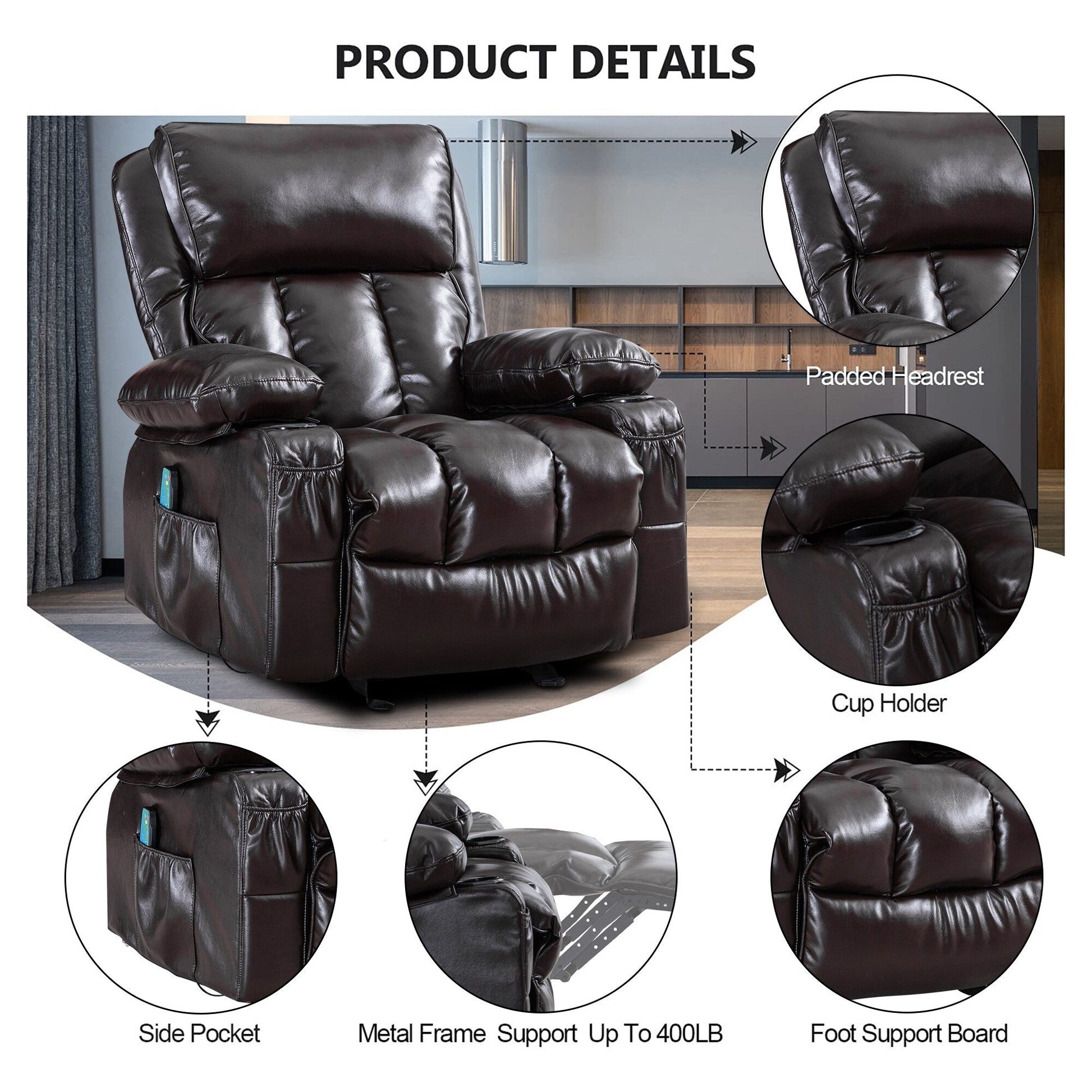 【Durable Upholstery】- With skin-friendly breathable leather to improve the sense of touch. This Rocker Recliner is filled with enough sponge to provide the user with enough back and lumbar support. The well-crafted wooden structure inside and durable metal frame at the bottom ensures the user's safety and also prolong the service life.