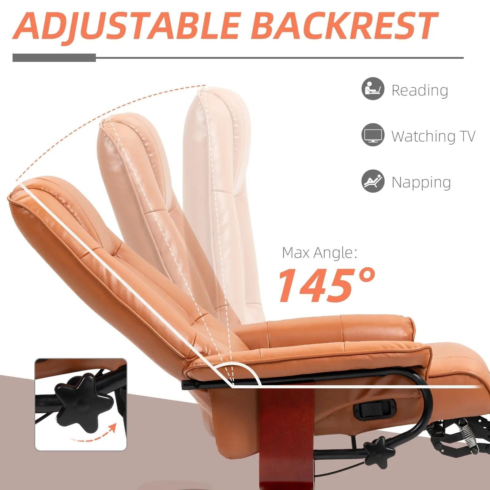Reclining Back: Adjust your swivel recliner's position to your preference, reclining to a maximum angle of 145°.