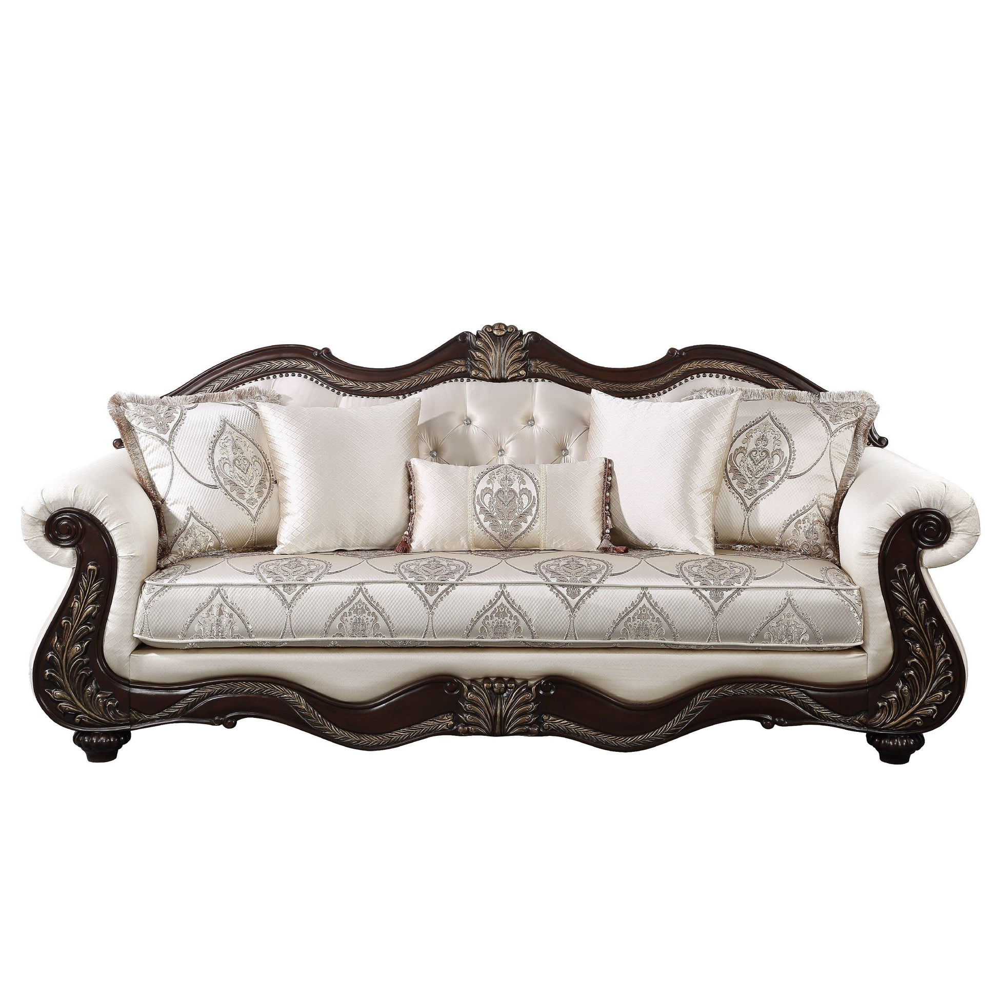 Embrace classic elegance with this sofa. Crafted with a sturdy walnut brown wood frame, it features ornate hand-carved details, antique gold accents, and a tufted ivory faux leather backrest. Rolled arms and nailhead trims exude timeless charm, while the included patterned accent pillow adds contrast. Its Baroque and Rococo-inspired design makes a statement. Explore the Faya collection for more.