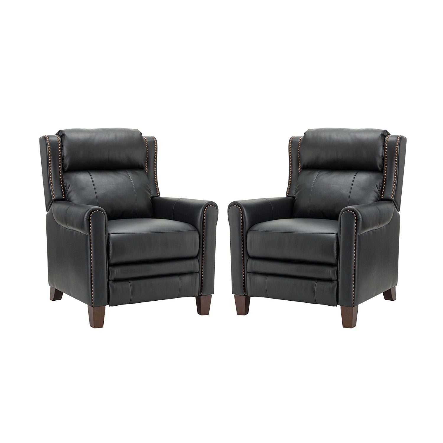 This recliner set is upholstered in luxurious premium leather for a smooth and comfortable touch. This recliner set can be manually selected to park in any position you find most comfortable, sitting, half, or fully reclining. Their sturdy wood frame is designed to support up to 250 pounds. Their nailhead trim and soft seat cushion create the ultimate relaxation and soothing treatment for your mind and body. Our exquisite craftsmanship and elegant design bring more sophistication to this recliner set. You can place them in your living room, study or office.