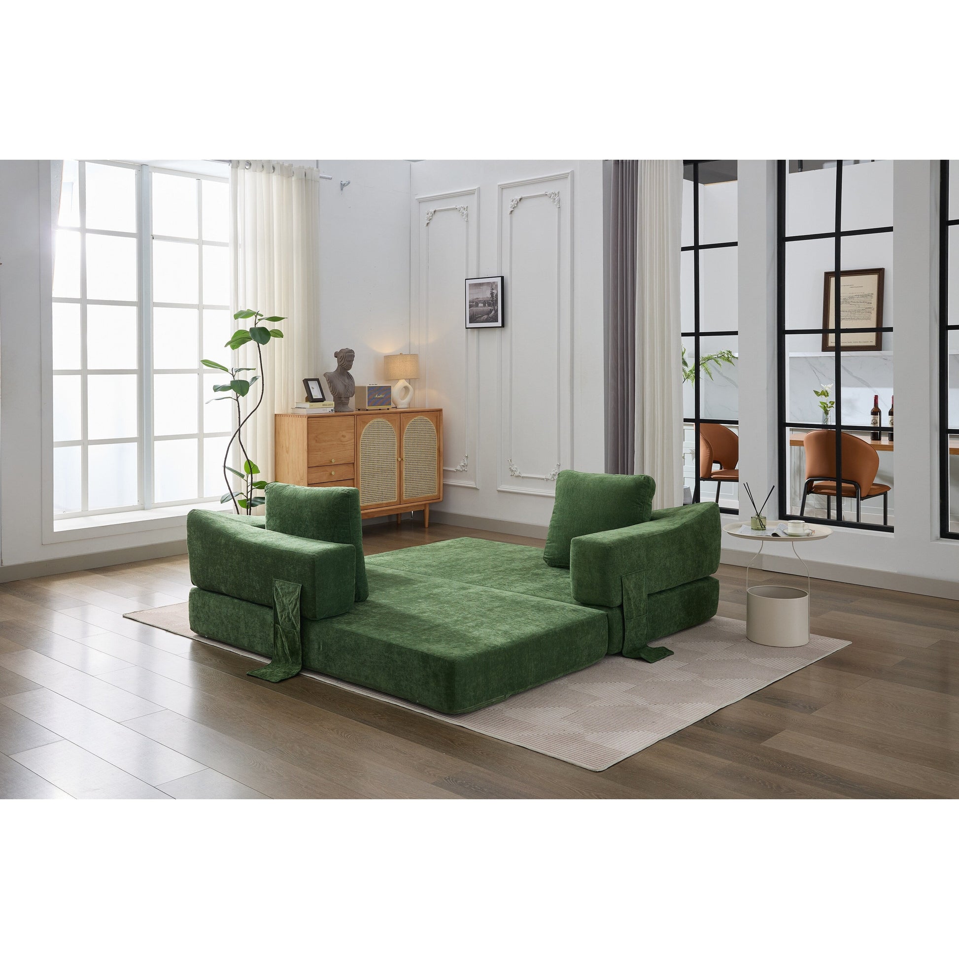 Designed for modern living, this fold-out sofa bed offers a versatile seating solution with a modular design that adapts to any space. Whether used in a living room, bedroom, or apartment, this sofa easily converts into a floor mattress for overnight guests. The chenille fabric ensures a soft and durable surface, while the removable backrest adds customizable comfort. With side pockets for added convenience, this minimalist sofa bed is perfect for small spaces where style meets practicality.