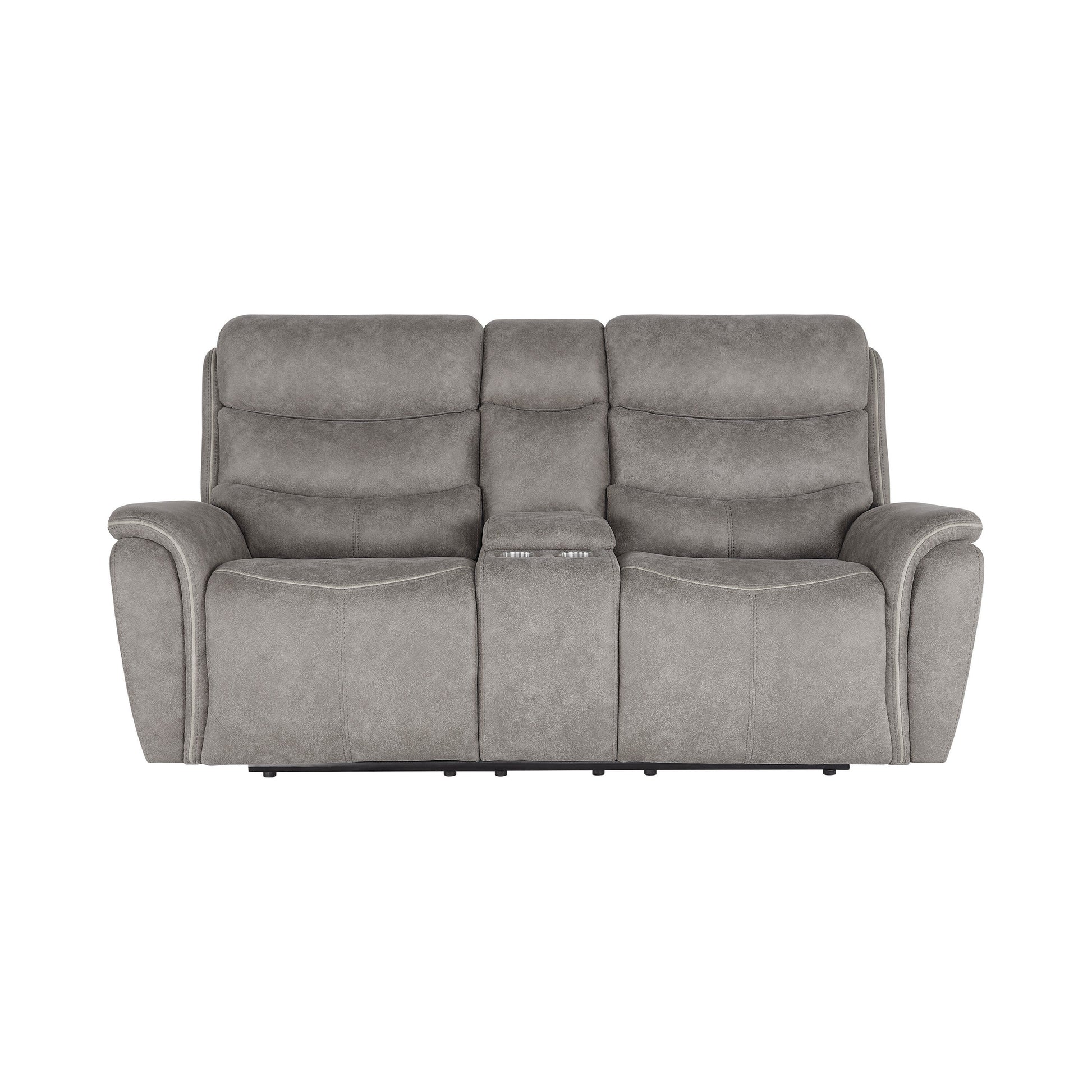 Elevate your comfort with this stylish power reclining loveseat in dappled gray, built with hardwood and manufactured wood frames and upholstered with polyester and faux leather blend. Featuring triple roll backs, wrap-around arms, and contrasting welt accents, USB chargers, cupholders, and a center console for convenience. Explore our Folu collection for more options.