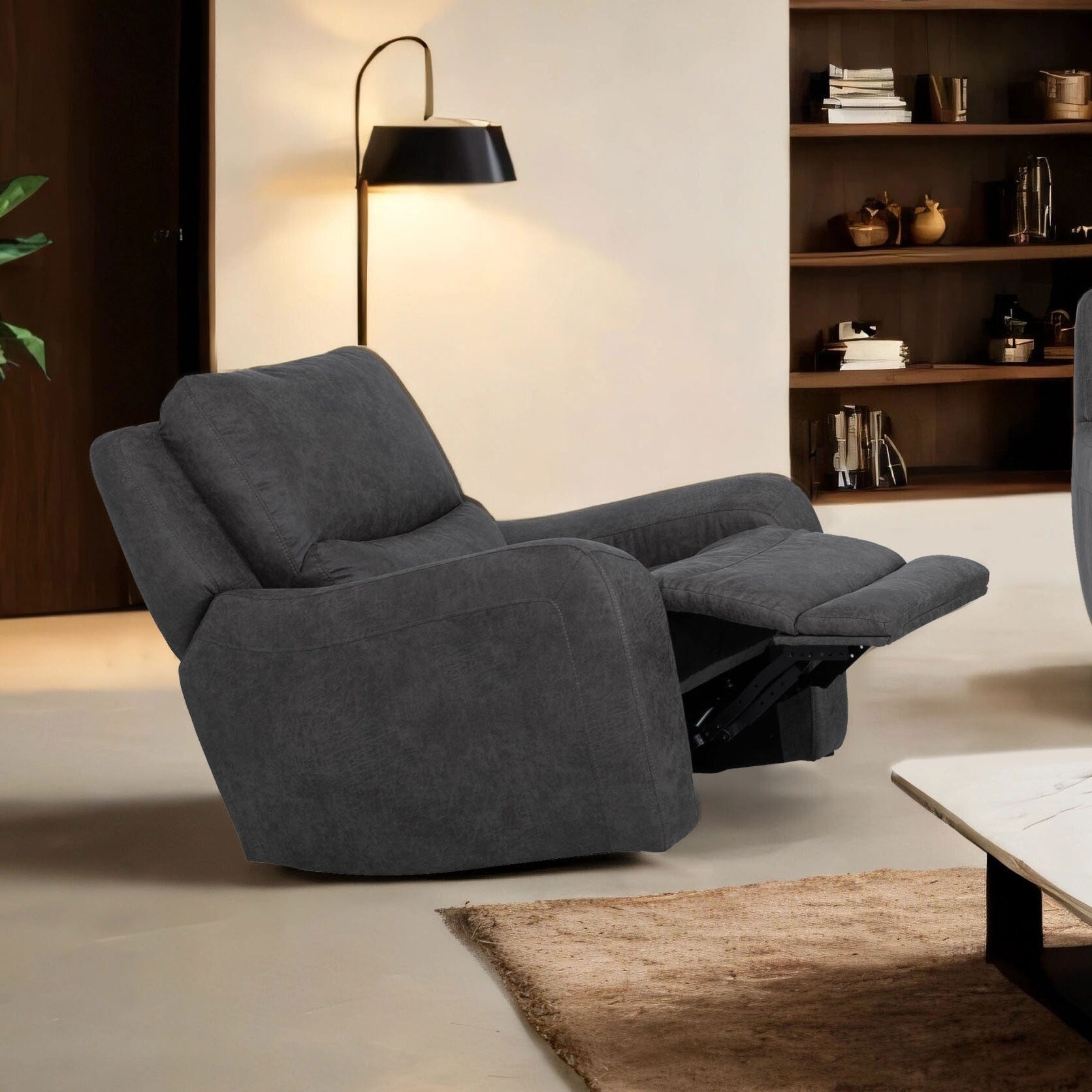 Sink into comfort with this oversized contemporary recliner chair, available in brown or dark grey. Featuring plush 1.5-seat power reclining, soft track arms, and advanced seat zone support, it's perfect for unwinding after a long day. Built-in USB-A & USB-C ports keep your devices charged as you relax.