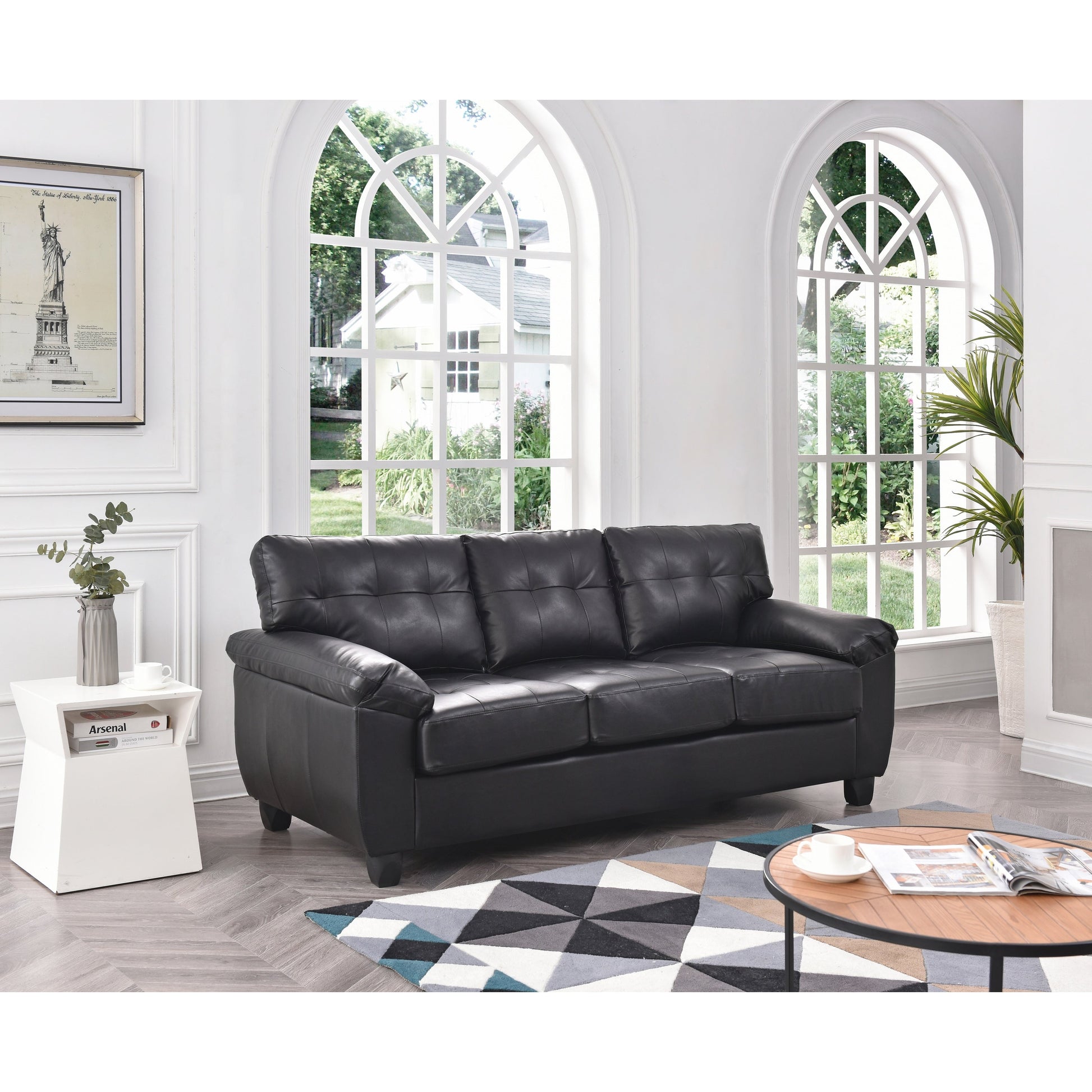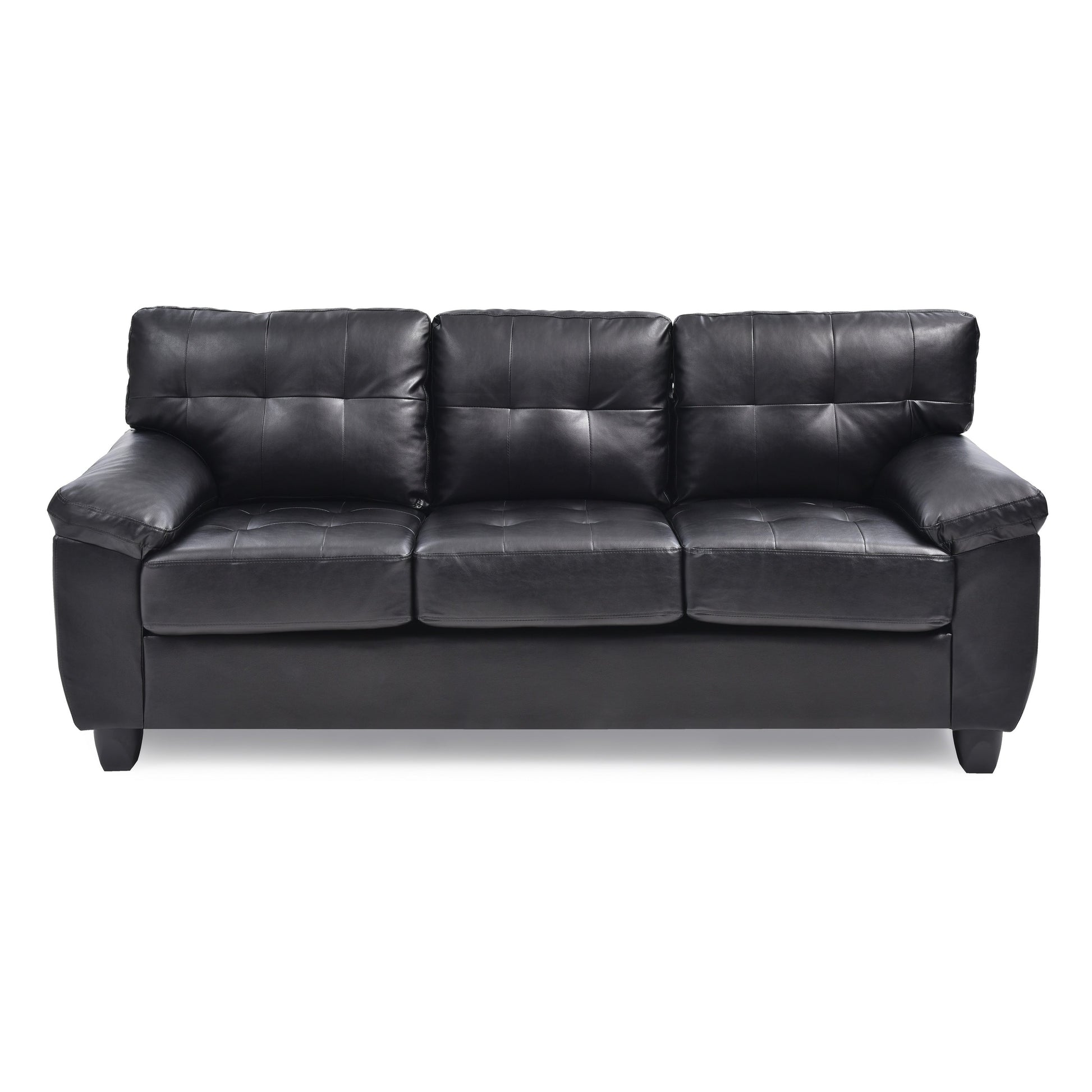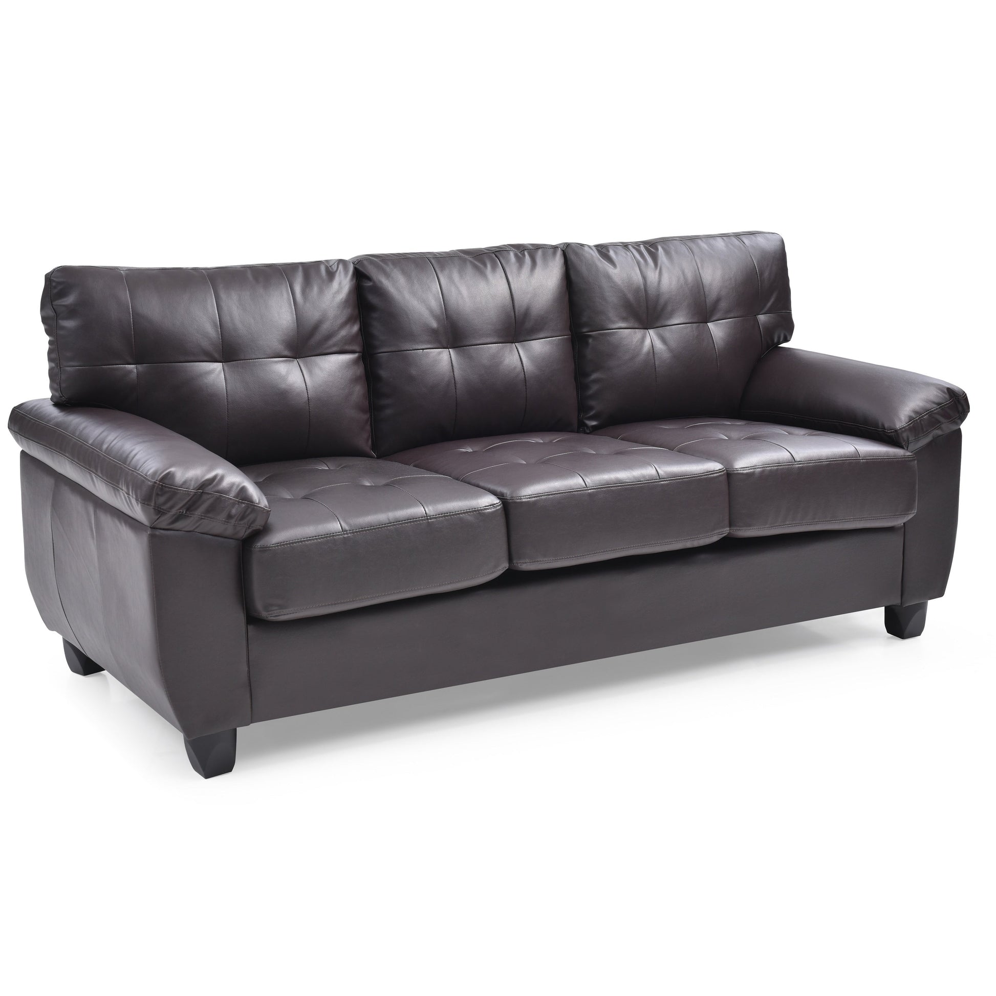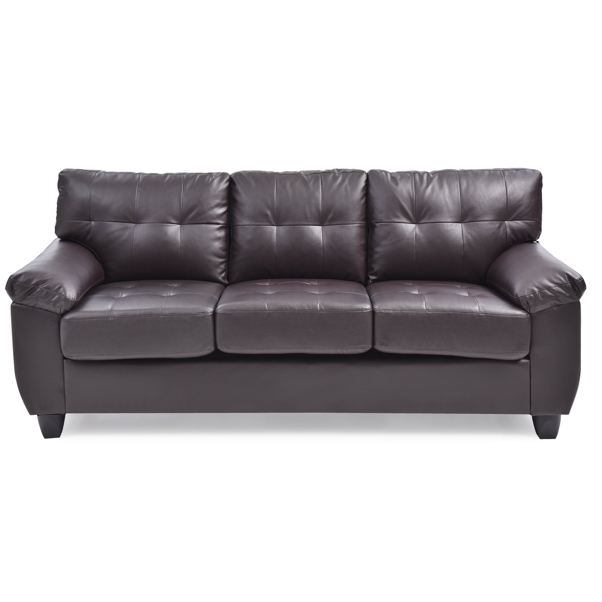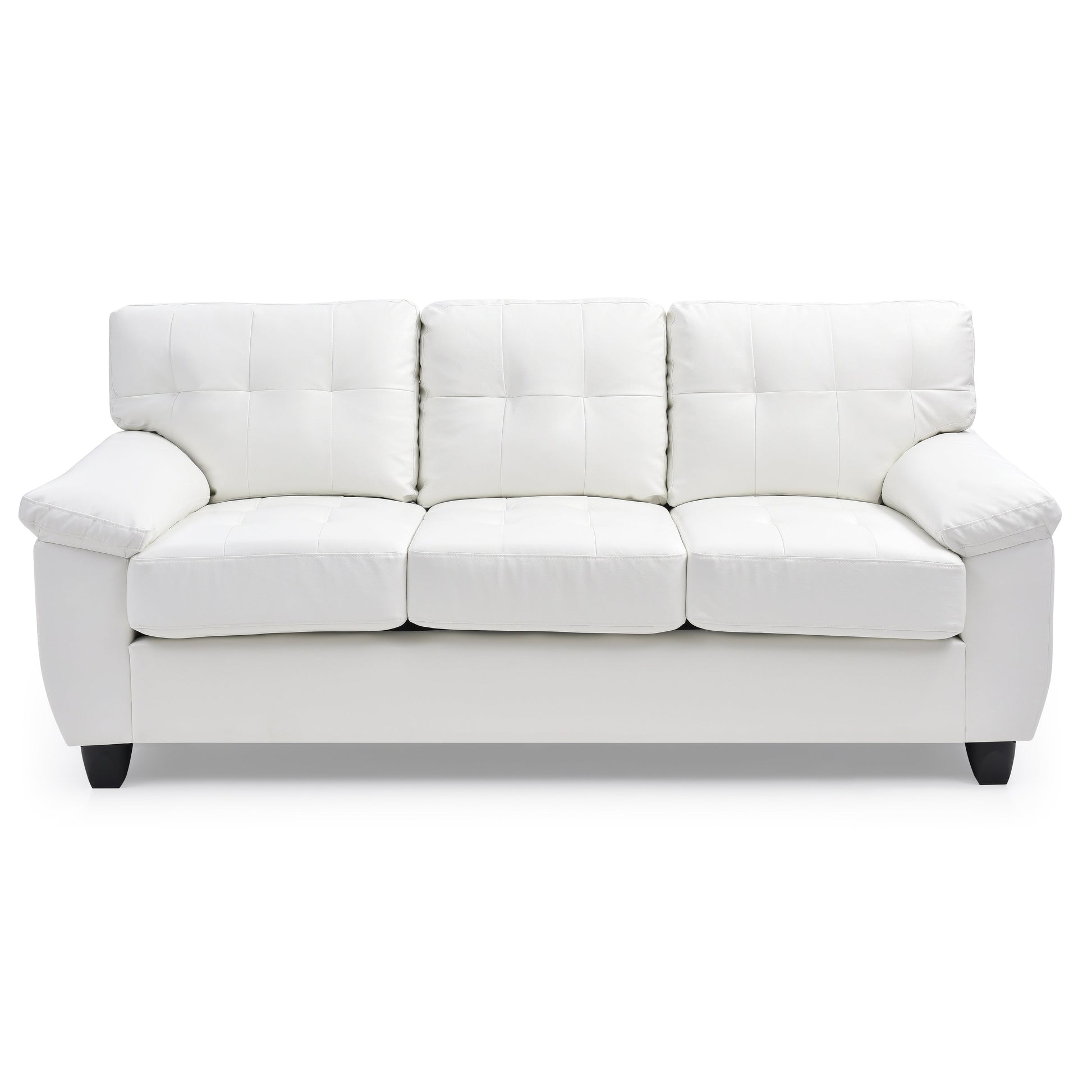 Experience the perfect blend of comfort and modern style with our Gallant Faux Leather Sofa. Built with a sturdy wood frame and featuring pocket coil seating padded with foam, this sofa is upholstered with easy-to-maintain faux-leather. Tufted seat backs and plush pillowtop arms provide a cozy lounging experience, while the semi-firm seats offer support. Available in white, black, grey, or cappuccino color, this sofa seats up to 3 people and stands at a comfortable 19-inch seat height. Assembly is required.