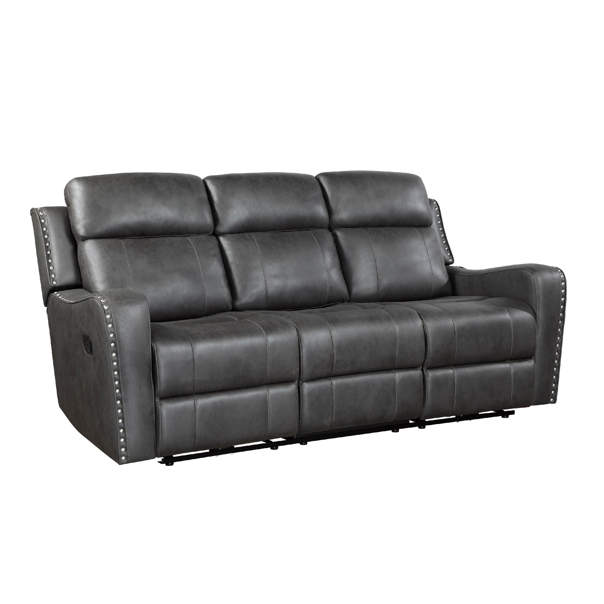 Unwind in refined comfort with this dual recliner sofa. Expertly crafted with a solid wood and plywood frame, it features a Dacron-wrapped high-density foam seat cushion and polished microfiber upholstery in a dark gray finish. Designed with a pull-handle recline mechanism and elegant nailhead trim, this piece offers style and support. Explore our Gimo collection for more options.