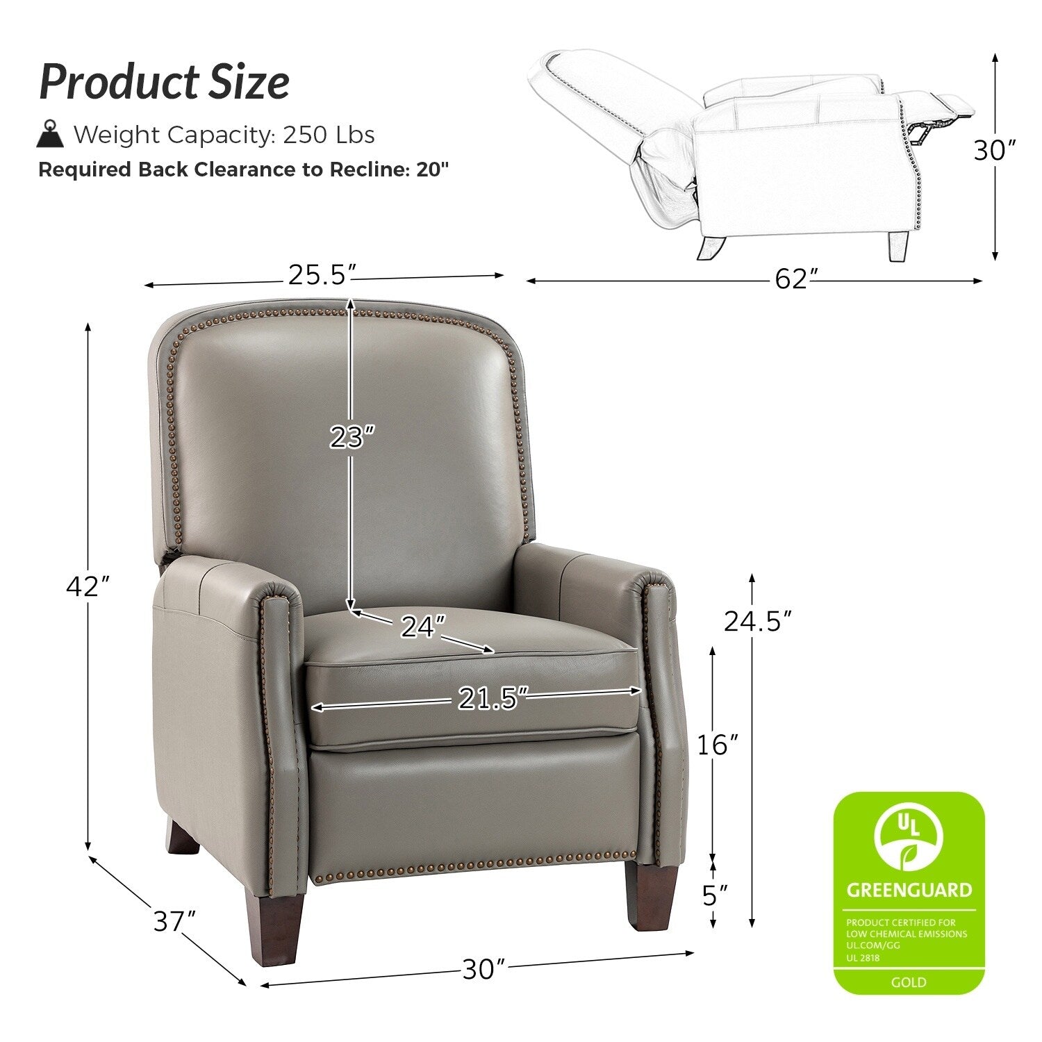 Experience the ultimate combination of luxury, comfort, and style with our Gladis Cigar Genuine Leather Pushback Recliner with Nailhead Trim. Designed with high-quality materials, including genuine leather, sturdy wooden frame and legs, and high-density foam filling, this recliner offers the perfect place to relax and unwind after a long day. The beautiful nailhead trim adds an elegant touch to its sophisticated design, making it a timeless addition to any home.