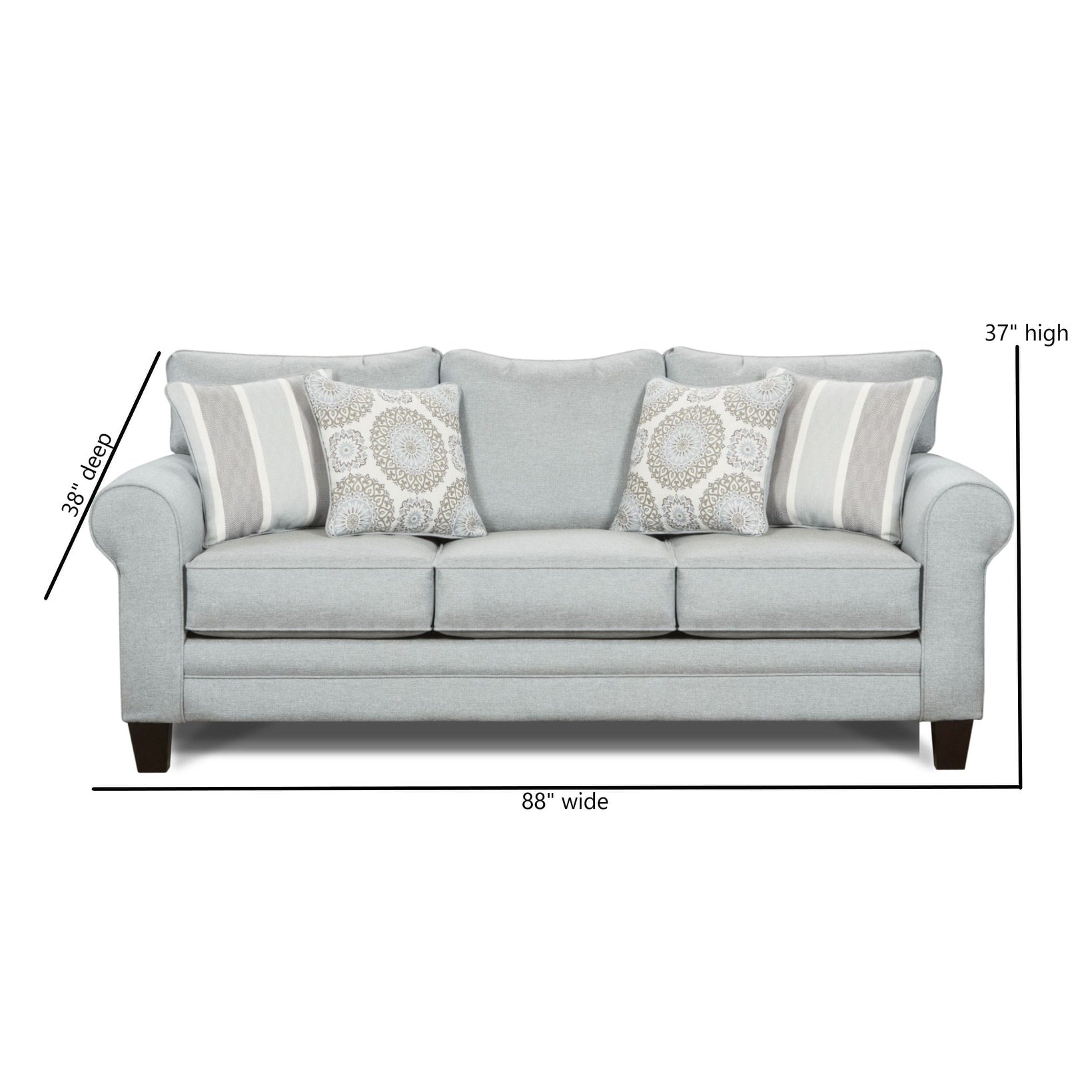 Elevate your living room with this charming Grande Mist Round Arm Transitional Light Blue/Grey Sofa. With its polypropylene upholstery and semi-firm cushions, this sofa can comfortably seat up to three people. The reversible cushions make it easy to maintain the sofa's quality and extend its lifespan. The elegant round arms and transitional style add a touch of sophistication to any décor.