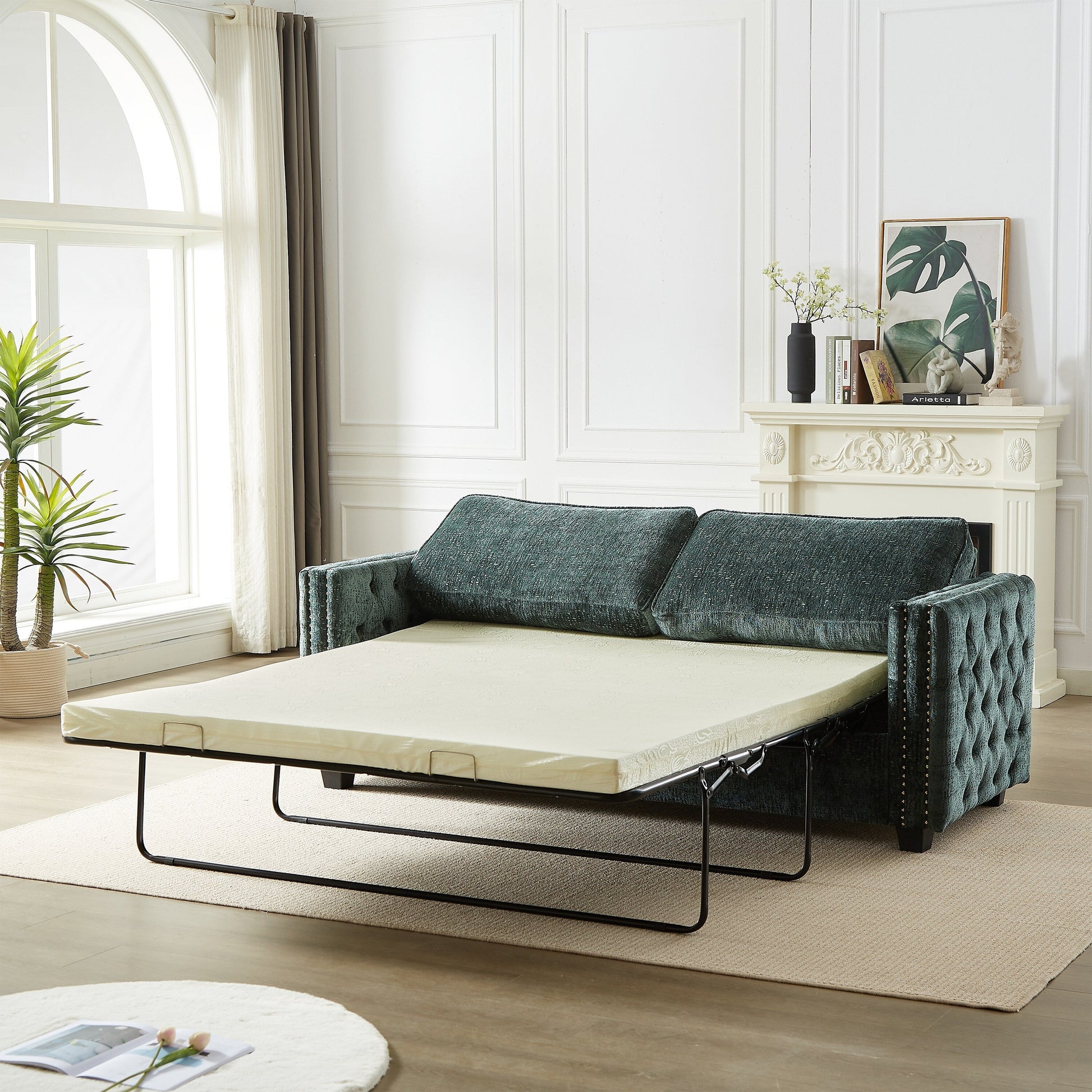 Green Chenille Sleeper Sofa with Memory Foam Mattress