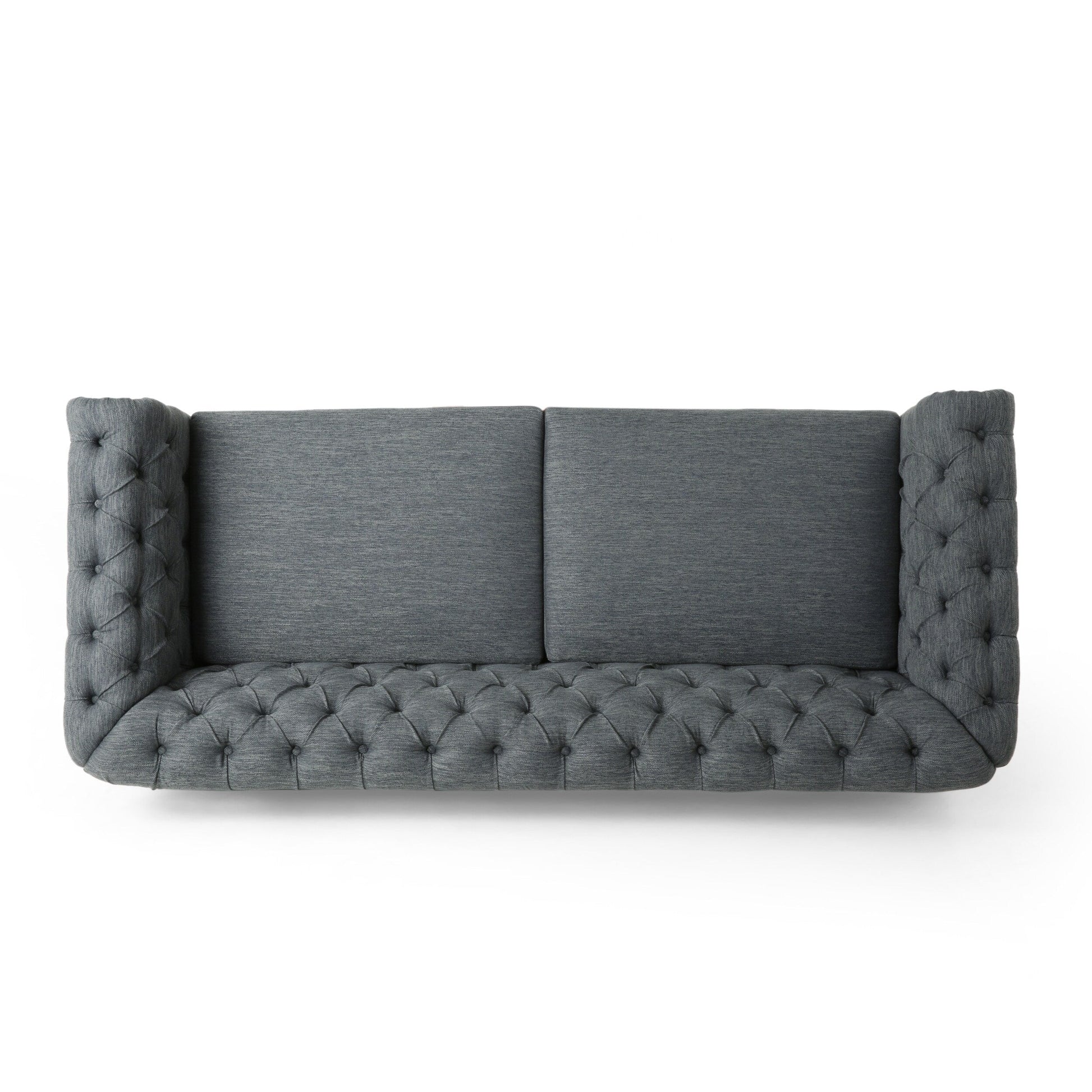 Grey 78.75 Fabric 3-Seater Sofa with Wooden Legs, Rivet Detailing, and Pull-Tab Backrest Design