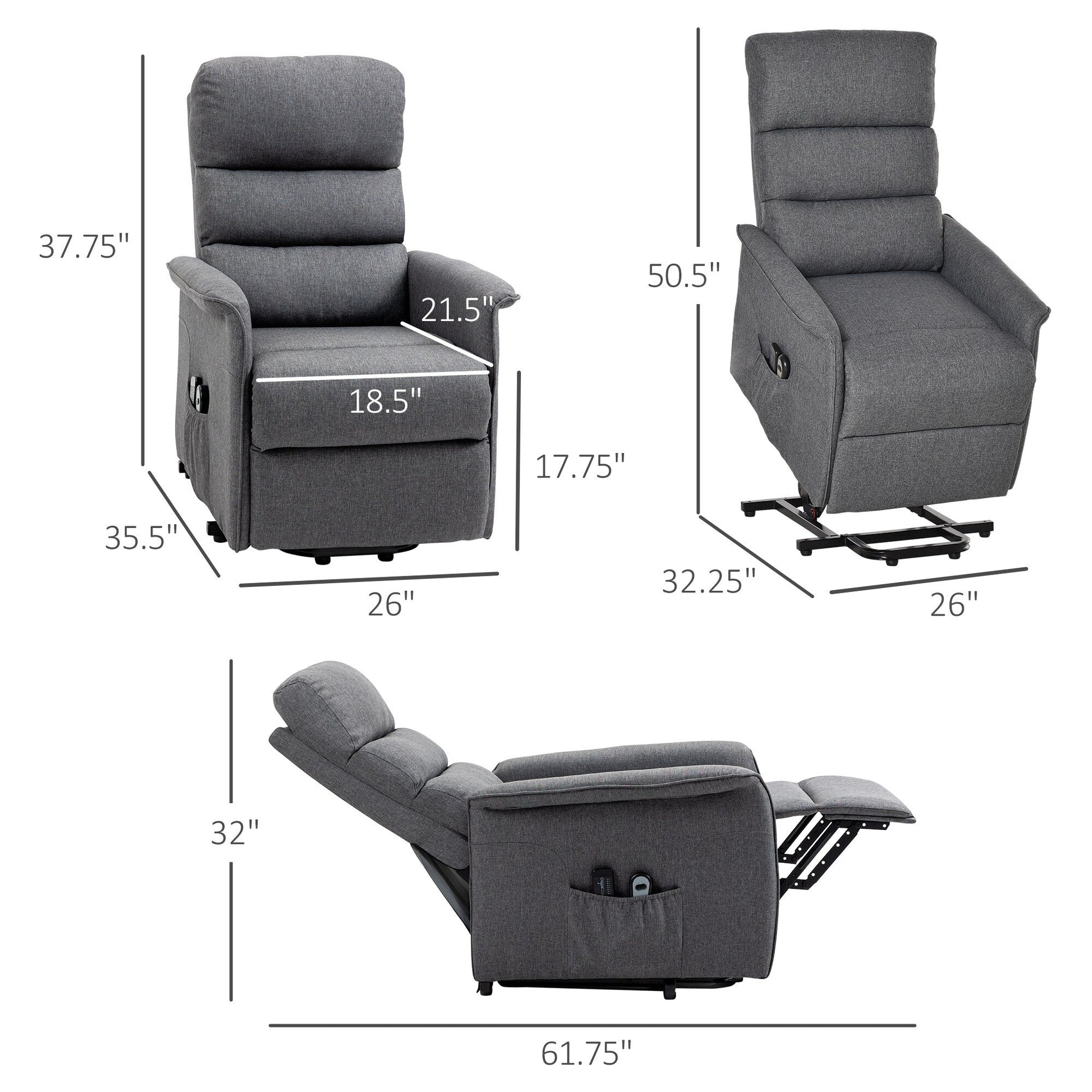 Power Lift Chair Information: Overall Dimensions: 35.5' D x 26' W x 38.75' H, Reclining Dimension: 61.75' L x 26' W x 32' H.