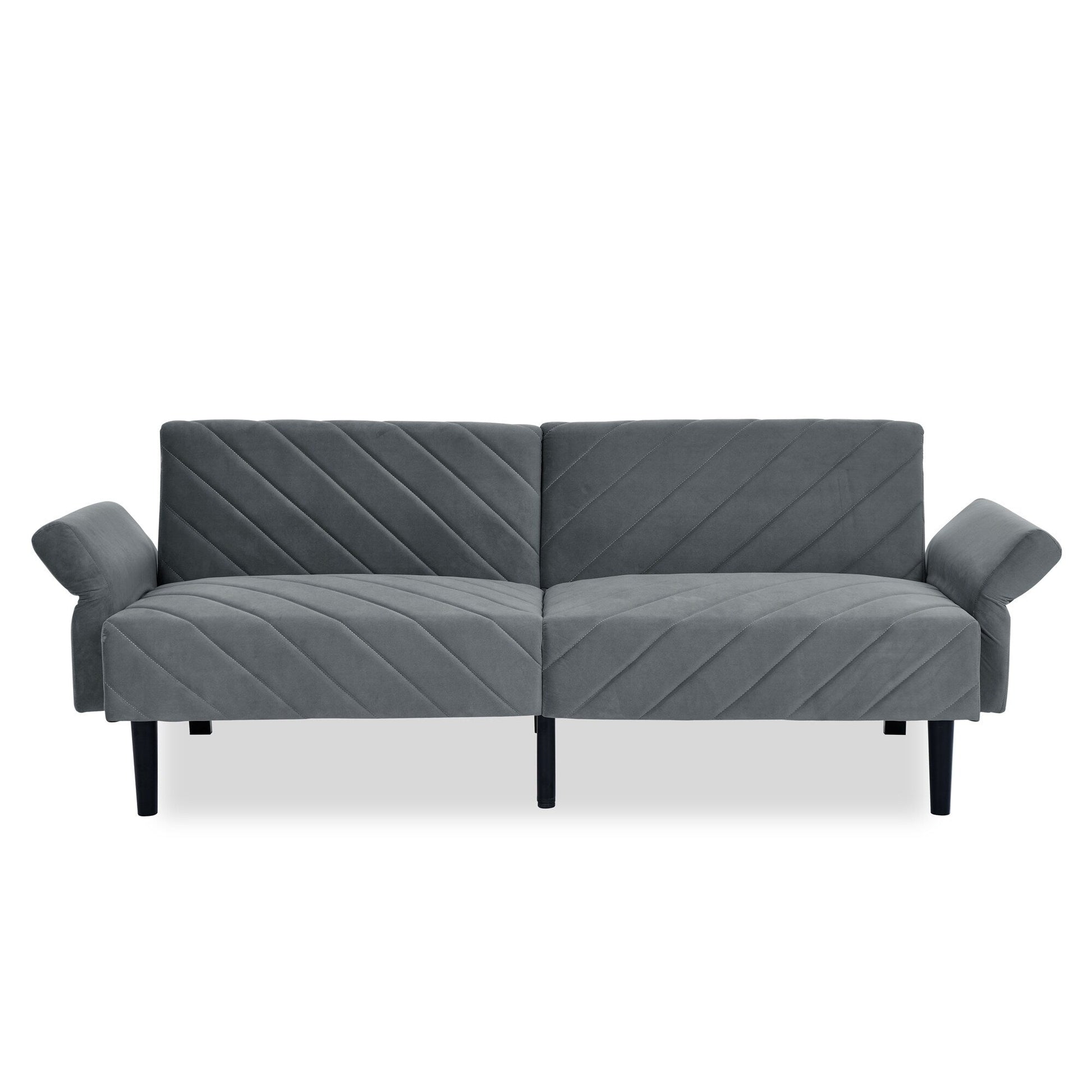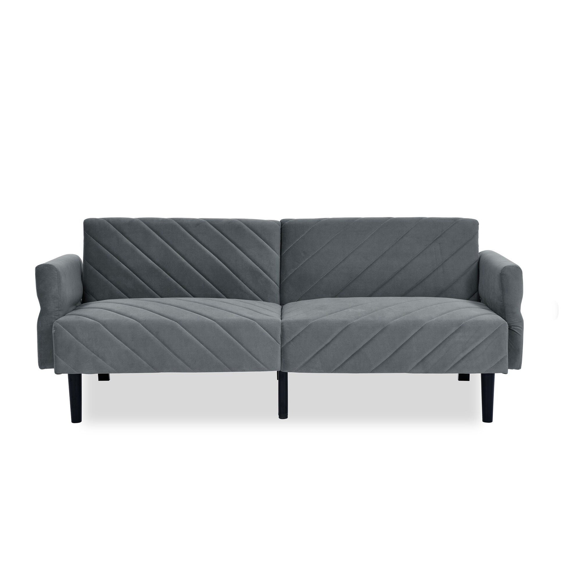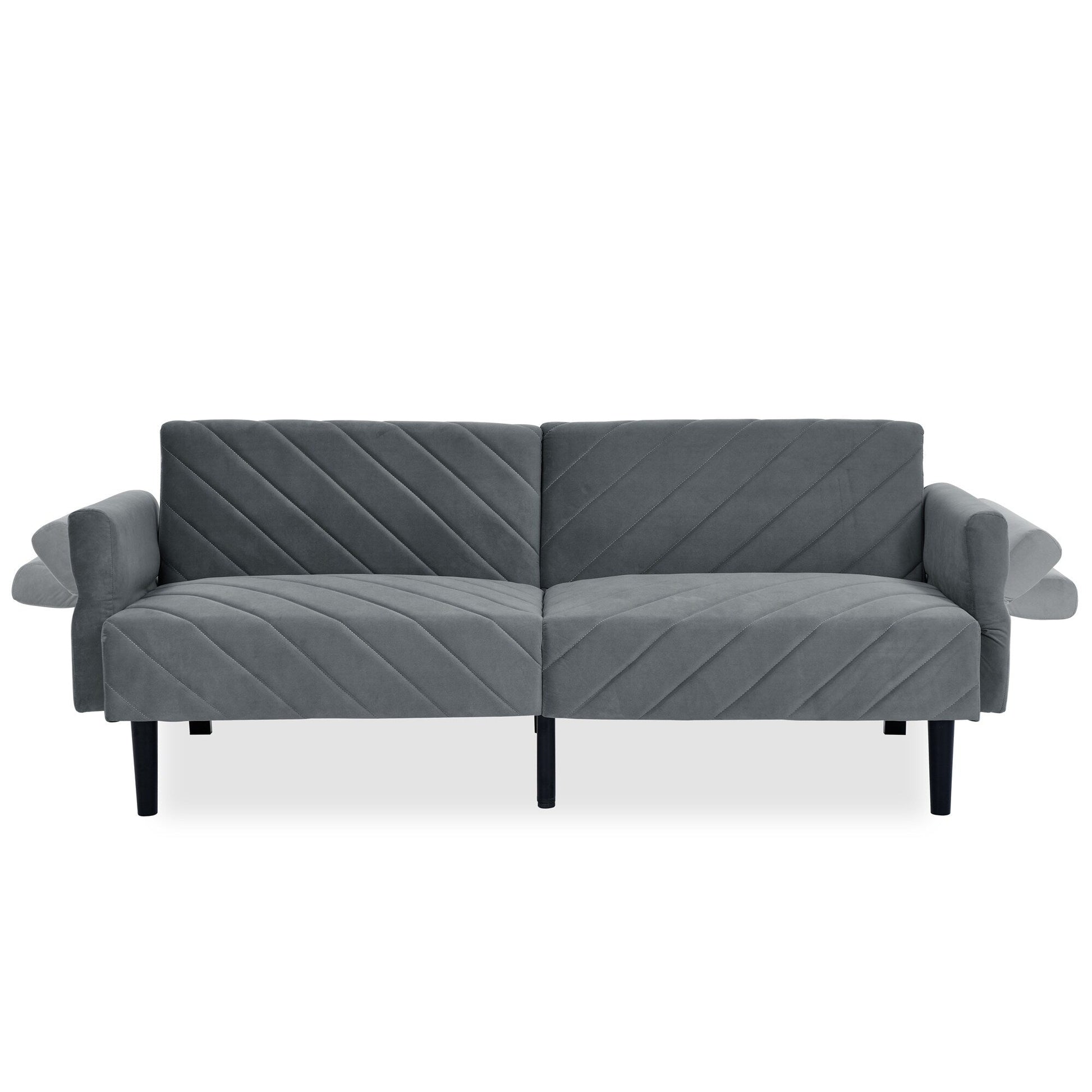 Elevate your living space with this timeless and versatile velvet futon sofa bed. Combining modern lines with mid-century modern details, such as chevron tufting and tapered plastic legs, this piece adds style to any decor. The velvet upholstery not only looks elegant but also adds extra comfort and durability, allowing you to enjoy its softness and warmth. The multi-angle adjustable armrests and backrests provide customized comfort, with the backrest adjustable in 6 positions (90° to 180° reclining), making it perfect for reading, entertainment, or sleeping. Simply pull to switch it between a sofa, bed, and recliner. Built for long-term use, the frame is made of iron and solid wood, ensuring a stable structure, while the high-density foam provides firm and comfortable support that will not deform. The adjustable armrests offer more sleeping space, allowing you to stretch comfortably on the sofa bed instead of curling up. The sleeper area measures 87' x 39.5' x 17.5', providing ample space for relaxation.