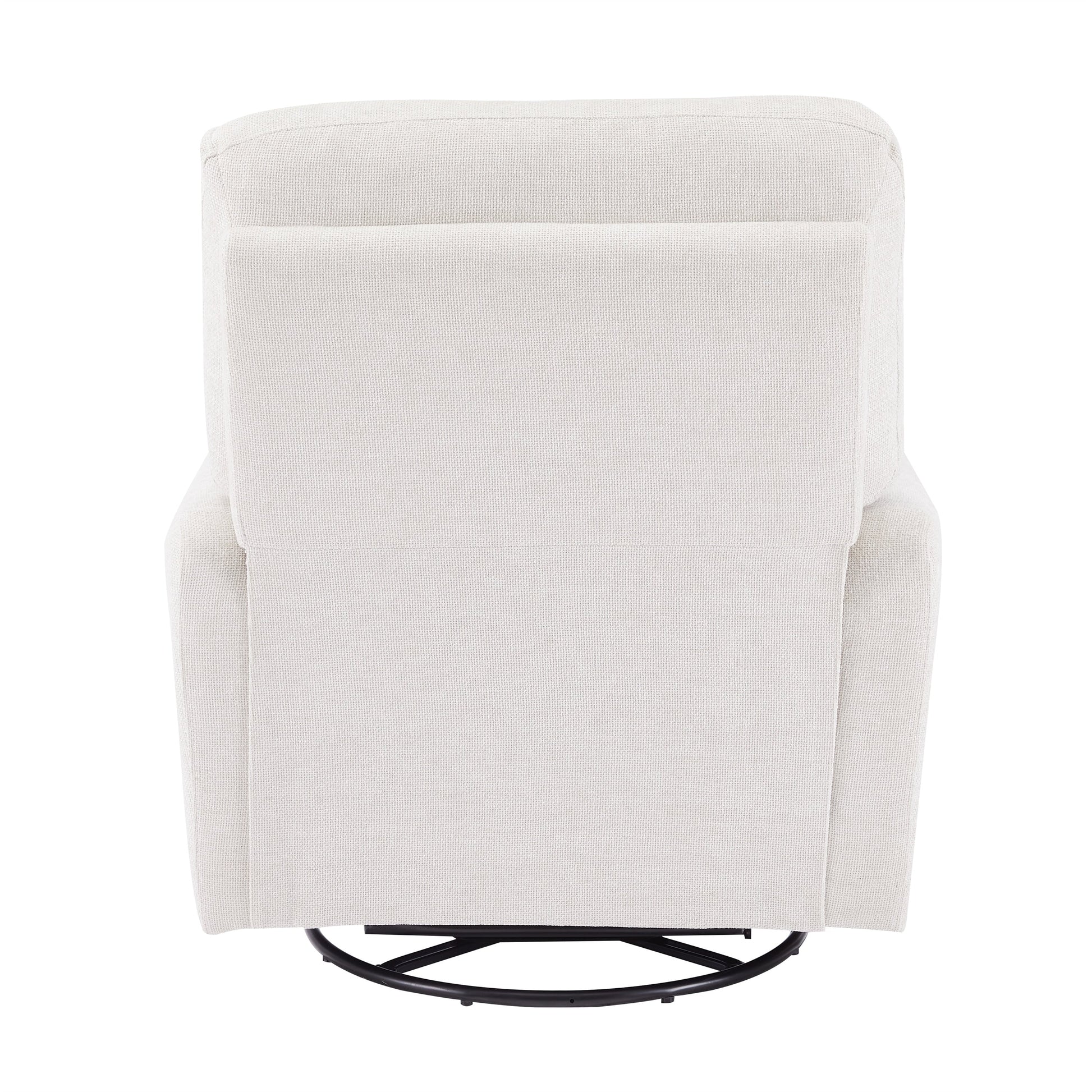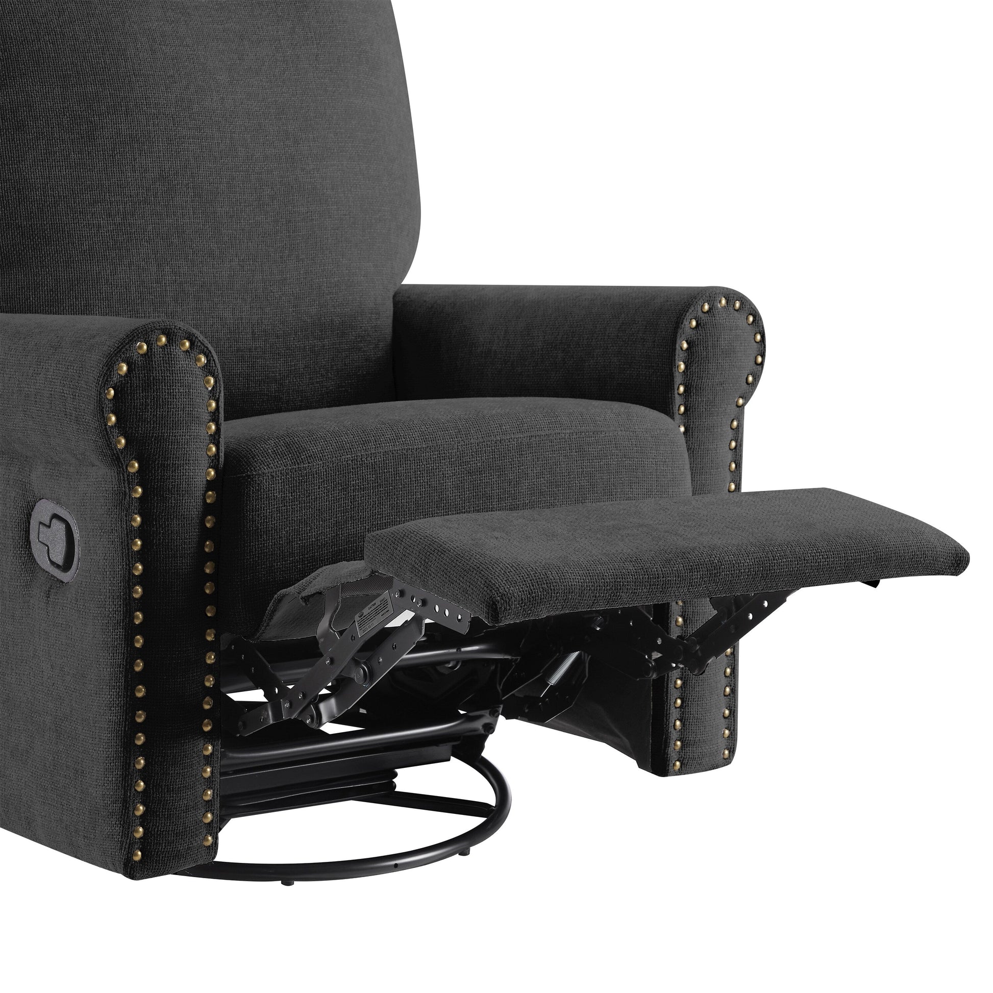 This 360 Swivel Rocker Recliner blends comfort, function, sustainability, and style in your nursery space. With a soft pillowback and cozy armrests, the chair provides a space to unwind throughout the day, while the elegant nail head details add a thoughtful touch to its classic silhouette.