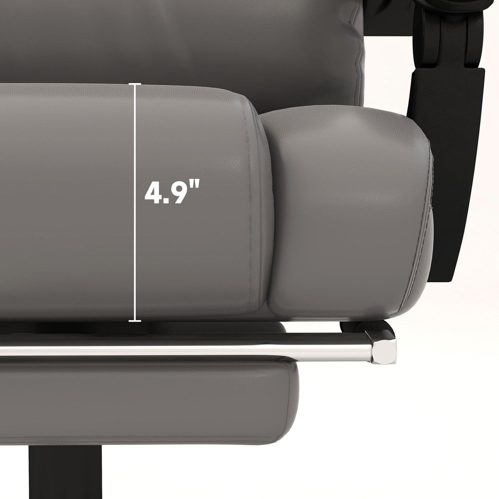 • This executive office chair features six-point vibration massage with five different modes to help alleviate back pain and fatigue after long hours of sitting. The lumbar pillow adds extra relaxation, while the adjustable settings via the remote control allow you to customize massage and timing. The chair’s backrest reclines up to 130 ° to relieve lower back and spine pressure, and the extendable footrest enhances comfort. The high-back design and padded armrests provide all-day support, ensuring you stay comfortable at your desk.