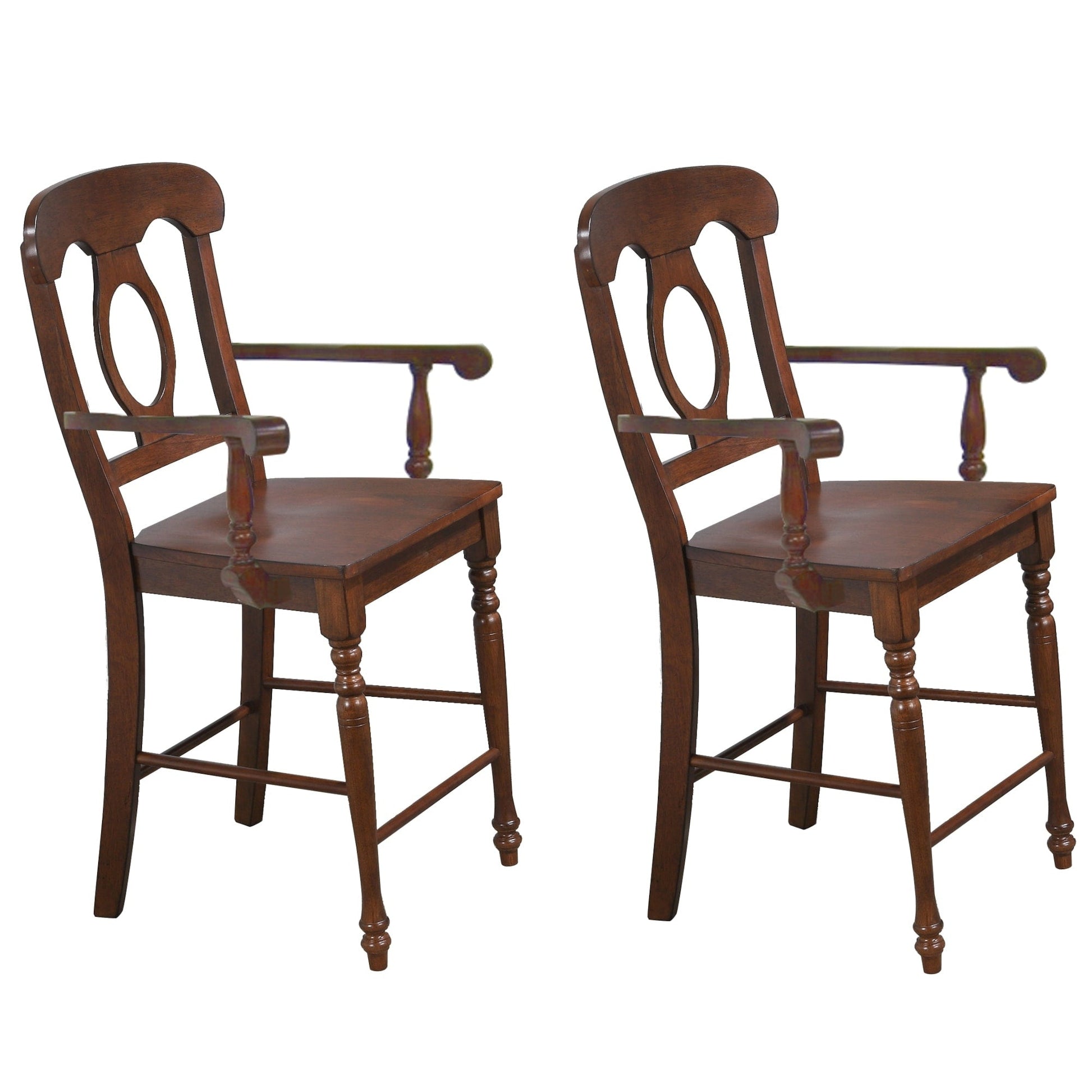 Upgrade your kitchen or dining area with these brown high-back bar stools, featuring French provincial style and classic charm. Traditional turned accents on the front legs and arms infuse farmhouse country appeal, while the oval back creates a casual atmosphere. Enjoy comfort with the sculpted seat and durability with the solid wood construction, making these barstools perfect for daily use.