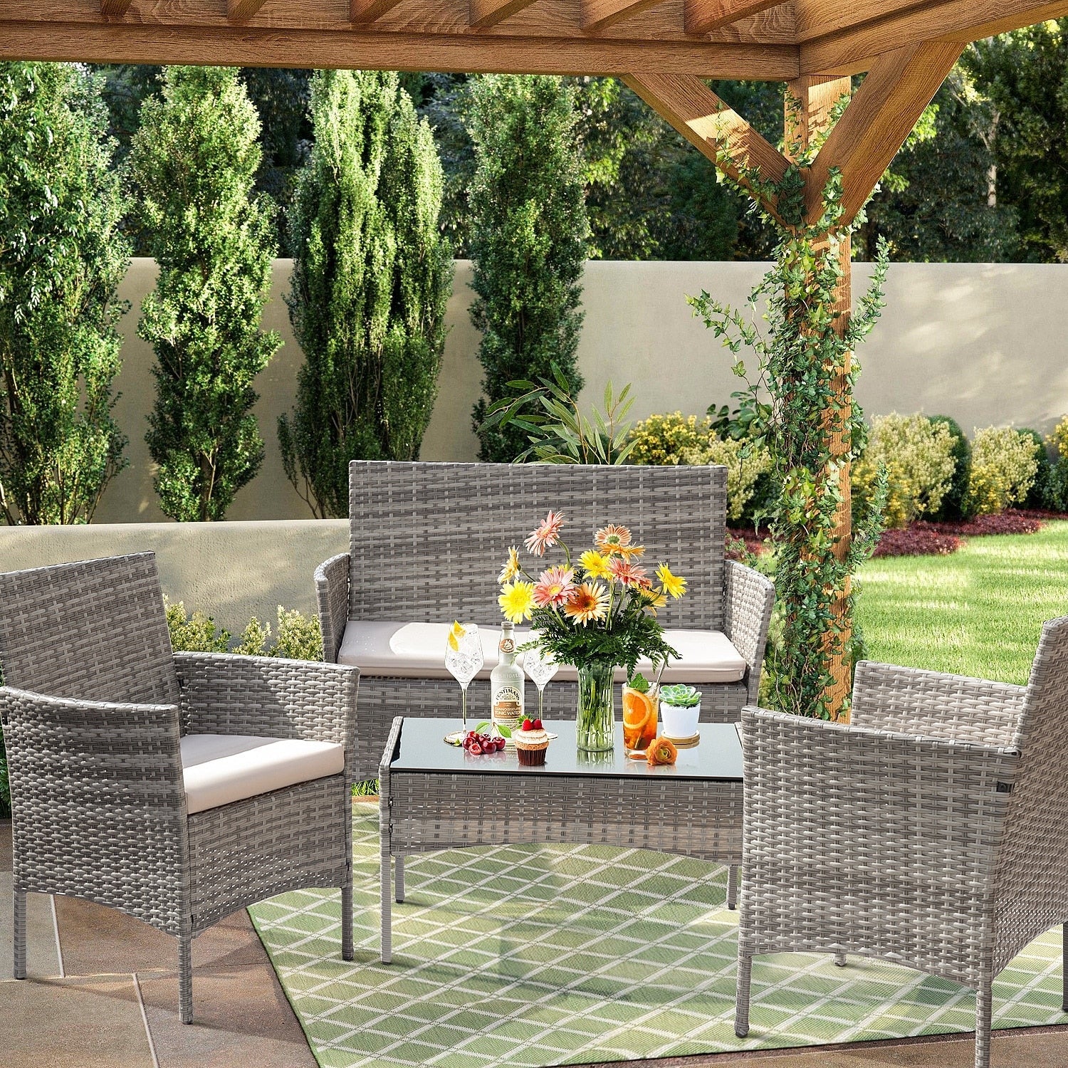 Enjoy the outdoors with the comfortable and stylish 4-piece PE rattan patio set. The handwoven all-weather PE rattan on steel frames resists chips, splits, fades, and rot, providing you with long-lasting durability. The set includes one loveseat, two chairs, and a coffee table with a tempered glass top that adds elegance to any space. The sponge-padded cushions are removable and washable, making maintenance a breeze. Perfect for indoor or outdoor use.