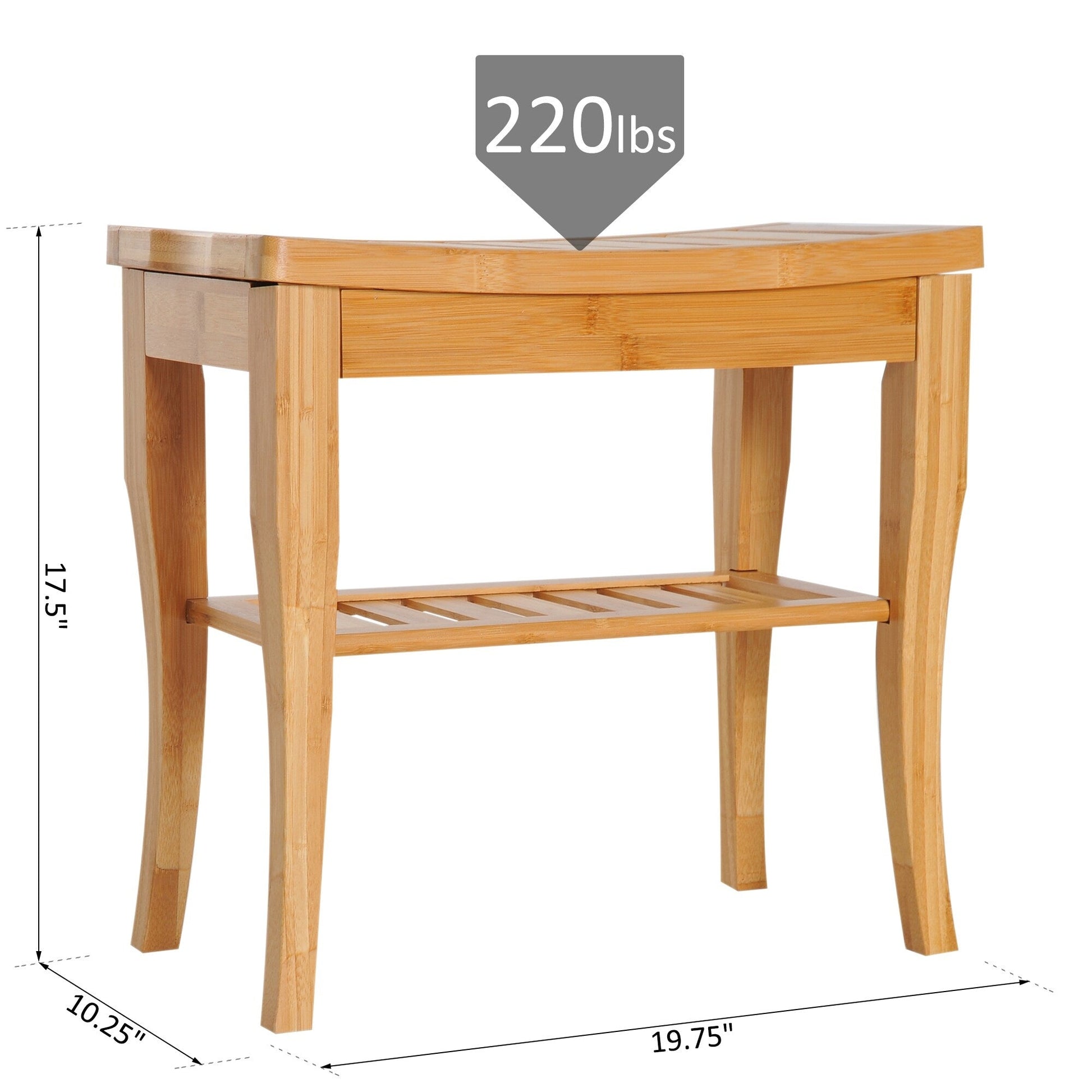 With its wide range of uses, HomCom's bamboo wood shower bench brings you convenience and style around your home. The entire seat is made from 100% eco-friendly natural bamboo material to help minimize your carbon footprint. Bamboo is naturally water-resistant and anti-microbial for long-lasting use, which also makes it easy to clean. With a lower shelf to store all your spa accessories, this bench seat is perfect for use in the bathroom, living room, spa, RV, and more.