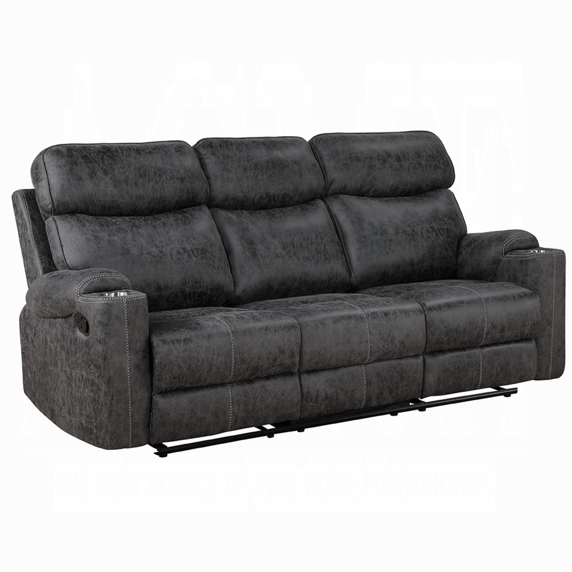 Unwind in comfort with this dark gray polish microfiber motion sofa, designed for both relaxation and convenience. Crafted with a sturdy wooden inner frame and pocket coil seat construction, it offers exceptional support. The armrests feature stainless steel cup holders, ensuring modern functionality. Explore our Hori collection for more options.