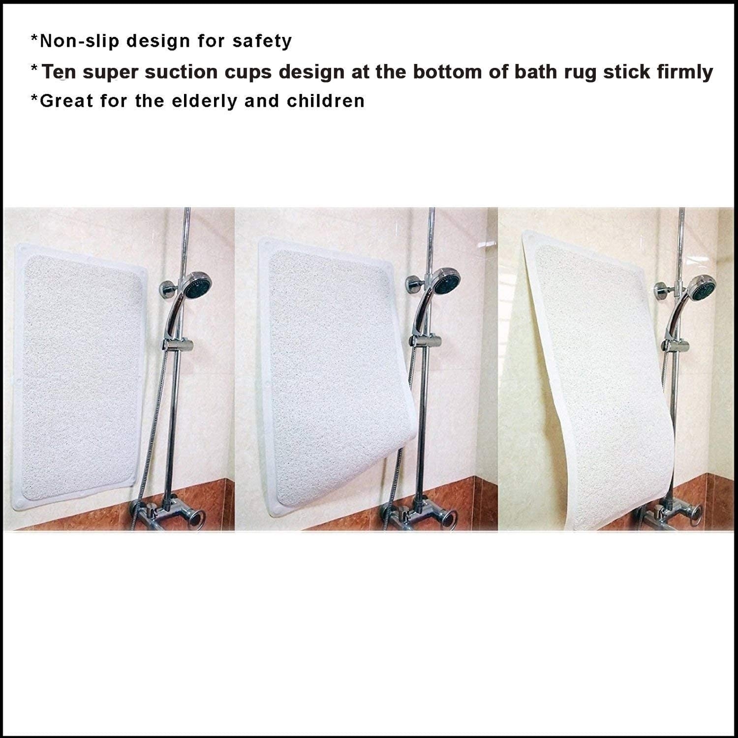 Experience the perfect combination of safety and comfort with our Slip-Resistant Loofah Shower Mat from HUJI. Its open-weave loofah texture allows water to drain quickly, preventing mildew and stains, while also providing a soft and secure standing area. The mat comes equipped with 10 strong suction cups at the bottom to ensure that it stays firmly in place, making it ideal for use by the elderly and children. This cream white shower mat dries quickly and is both machine washable and mildew/stain resistant. Upgrade your shower experience with HUJI Slip-Resistant Loofah Shower Mat!