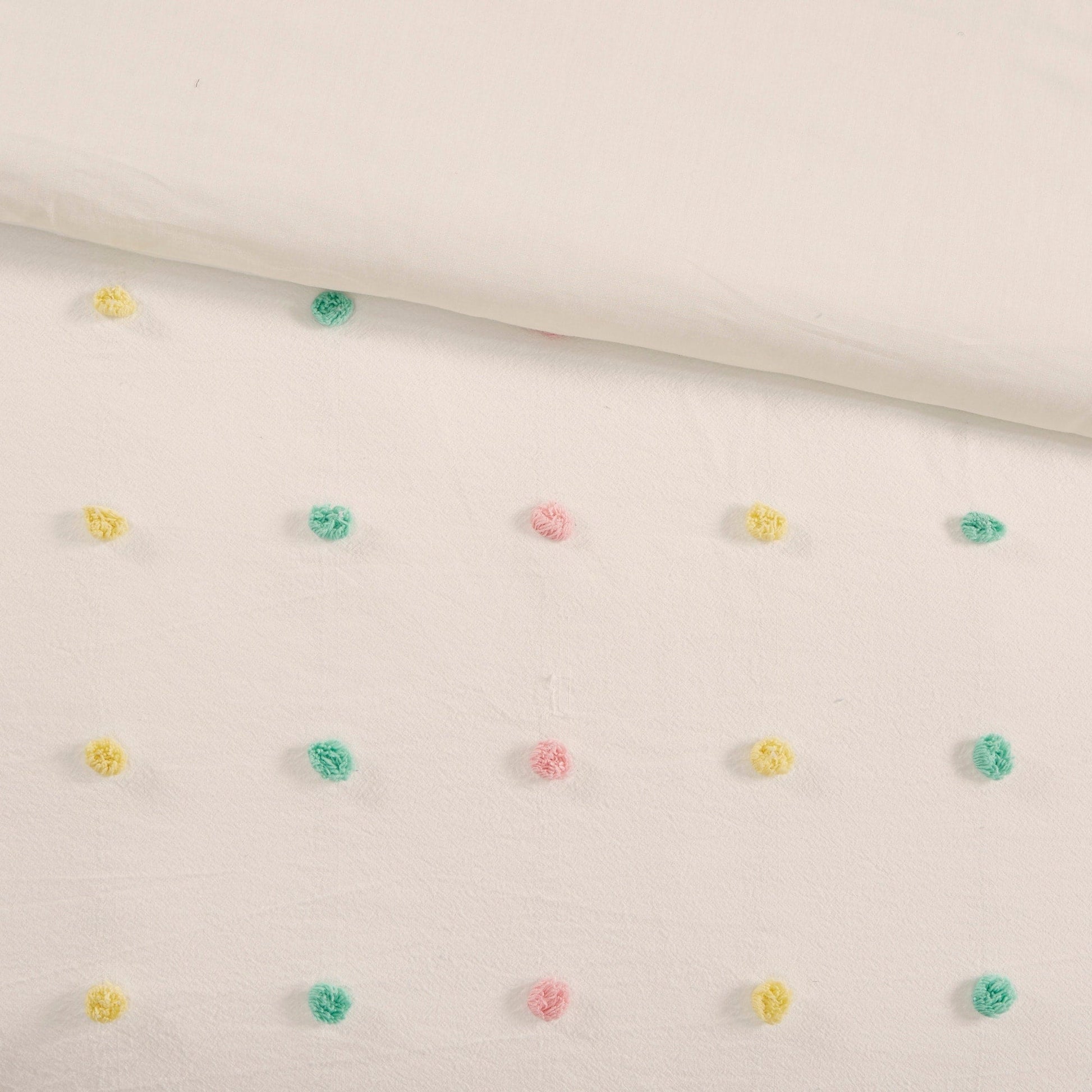 Create a cute and cozy look in your child's bedroom with the Intelligent Design Kids Ensley Cotton Jacquard Pom Pom Duvet Cover Set. This cotton duvet cover features an all-over jacquard pompom design that adds dimension and charm, for a shabby chic look. Matching shams (1 for Twin Sizes) pair perfectly with the duvet cover, while a square and an oblong decorative pillow complete the adorable kid's duvet cover set. Machine washable, this bedding set is also OEKO-TEX certified, meaning it does not contain any harmful substances or chemicals, and uses an antimicrobial treatment that provides built-in freshness protection, reducing the growth of odor causing bacteria to keep fabric lasting longer. Button closures allow you to place a comforter insert within the duvet cover and internal corner ties help prevent it from shifting (Insert is NOT included).