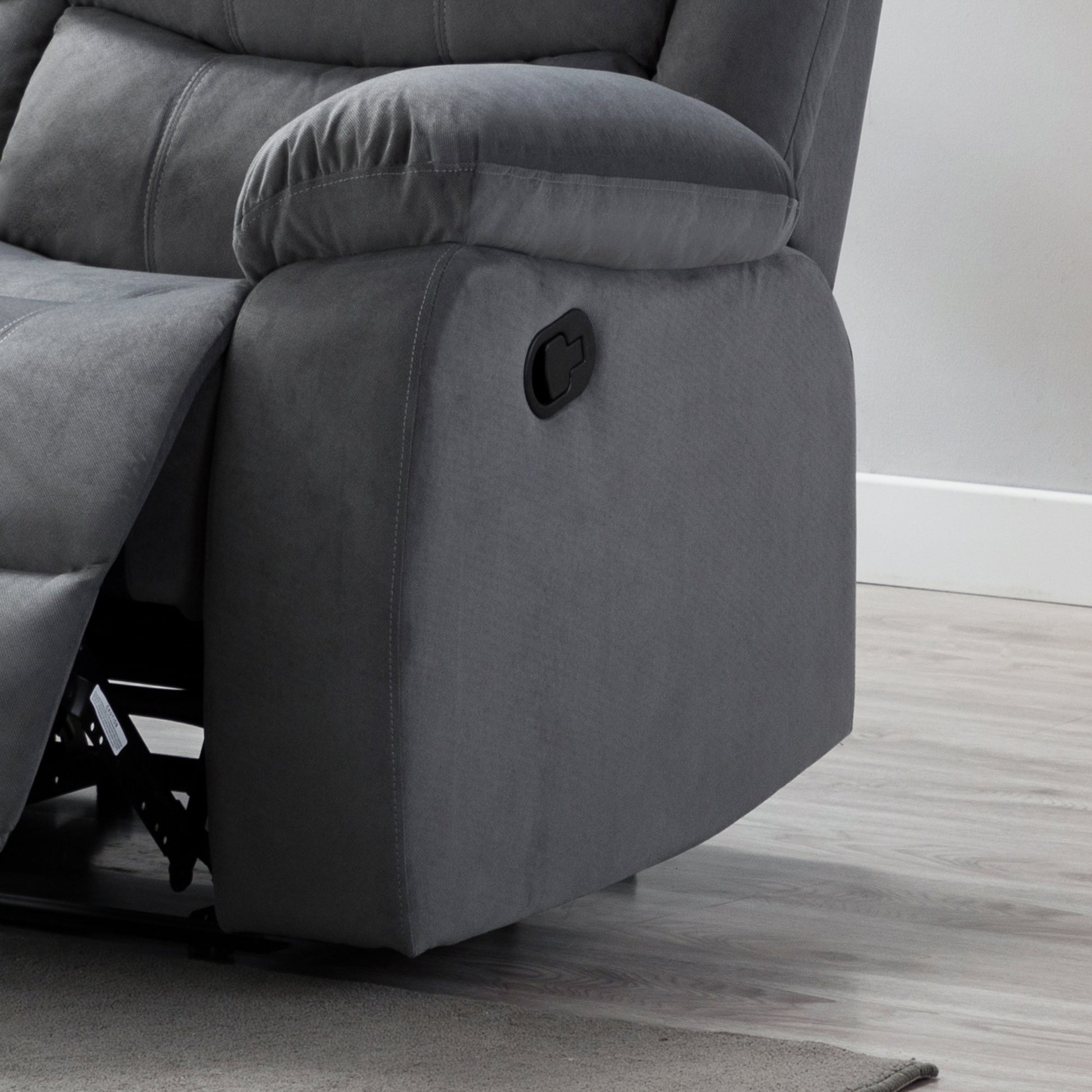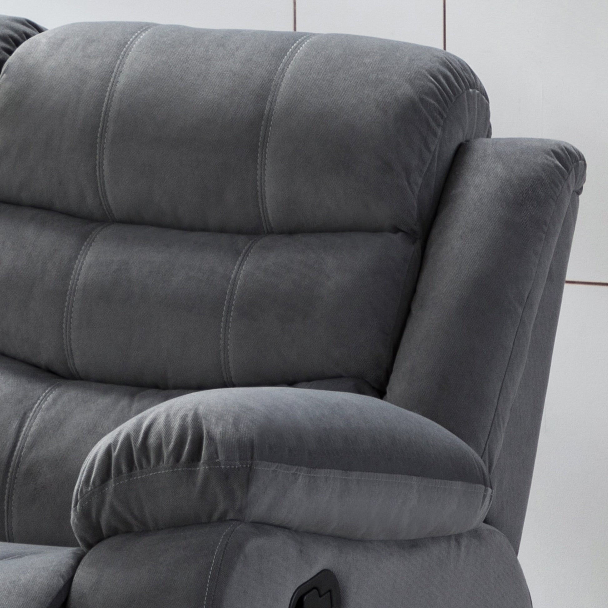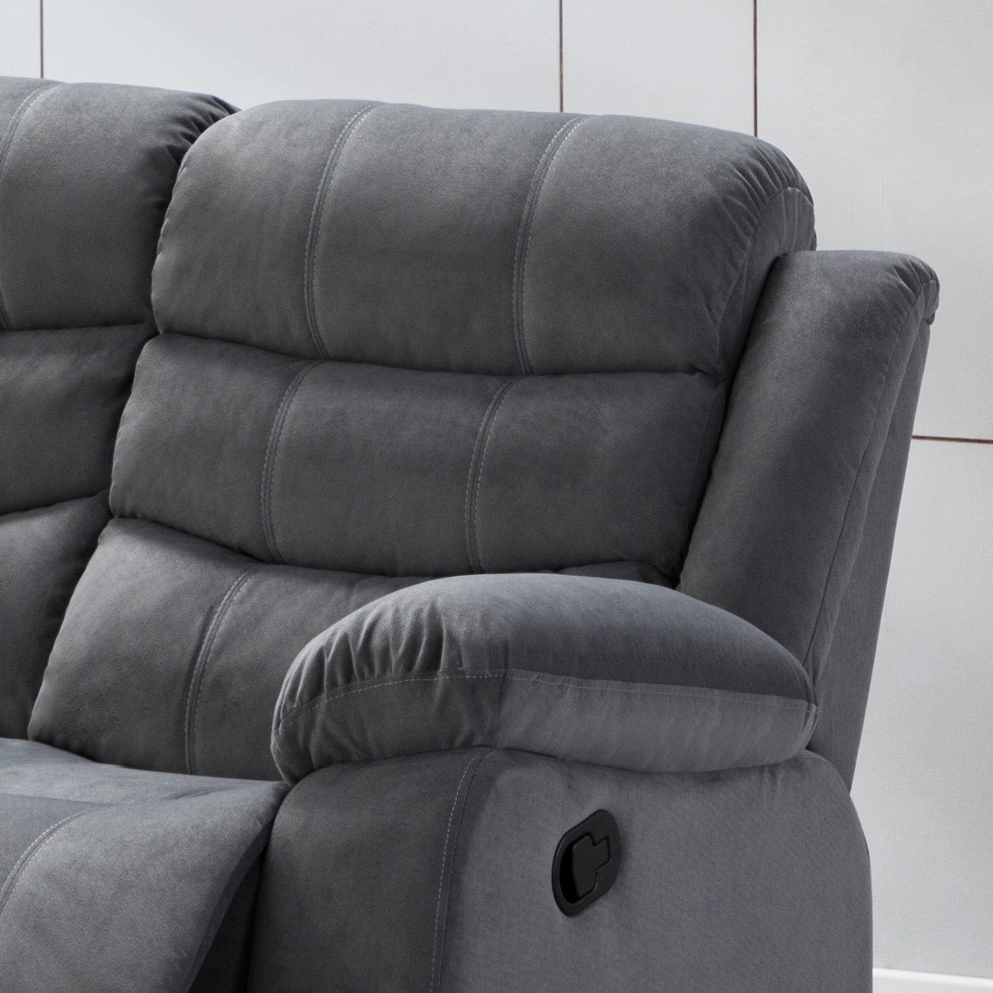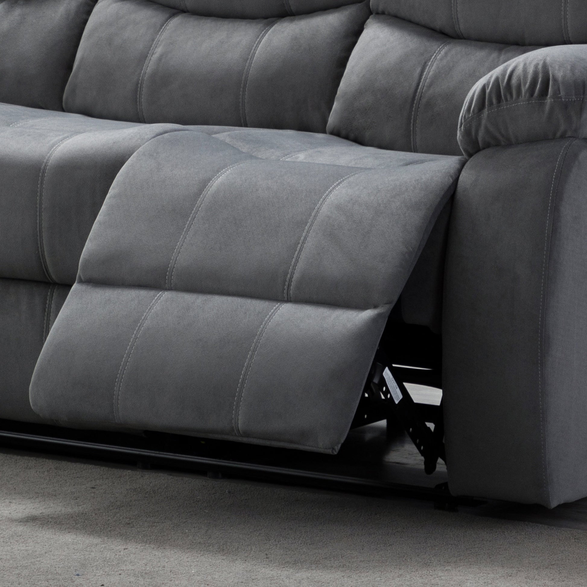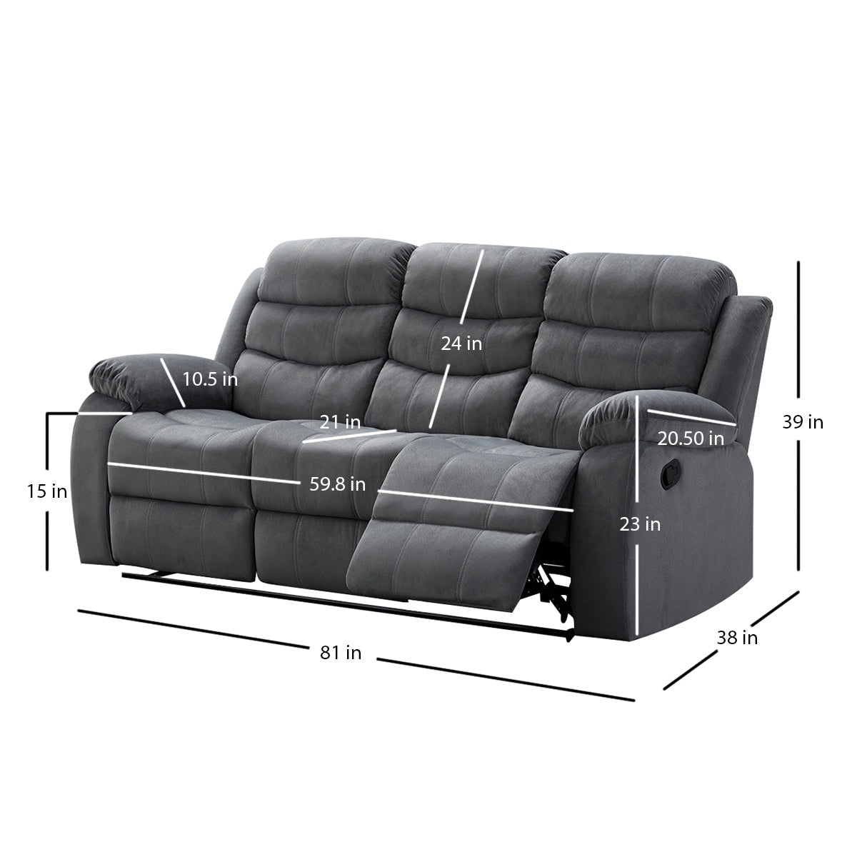 Don't sacrifice quality and comfort for the price. Our upholstered dual reclining sofa meets all the qualifications for true relaxation and entertainment. Our sofa seats three (3) people and has two (2) recliners! ( the middle seat in the sofa does not recline ). The fabric is a soft to touch 100% polyester which makes cleaning small spills a breeze. Brown furniture isn't your thing. We understand you and that's why we've taken a contemporary design and given you this grey option.