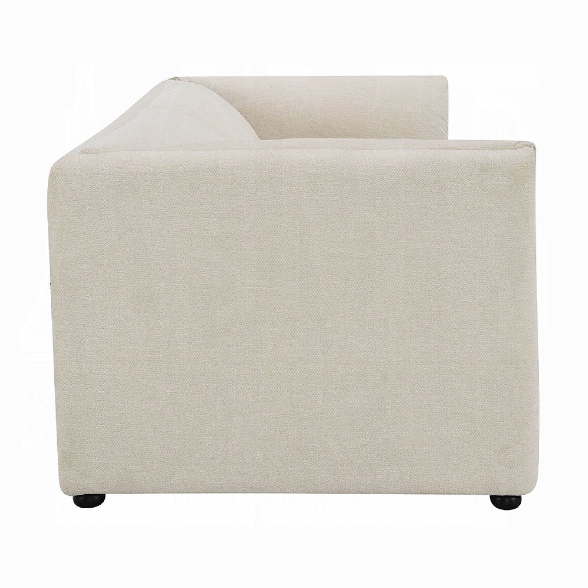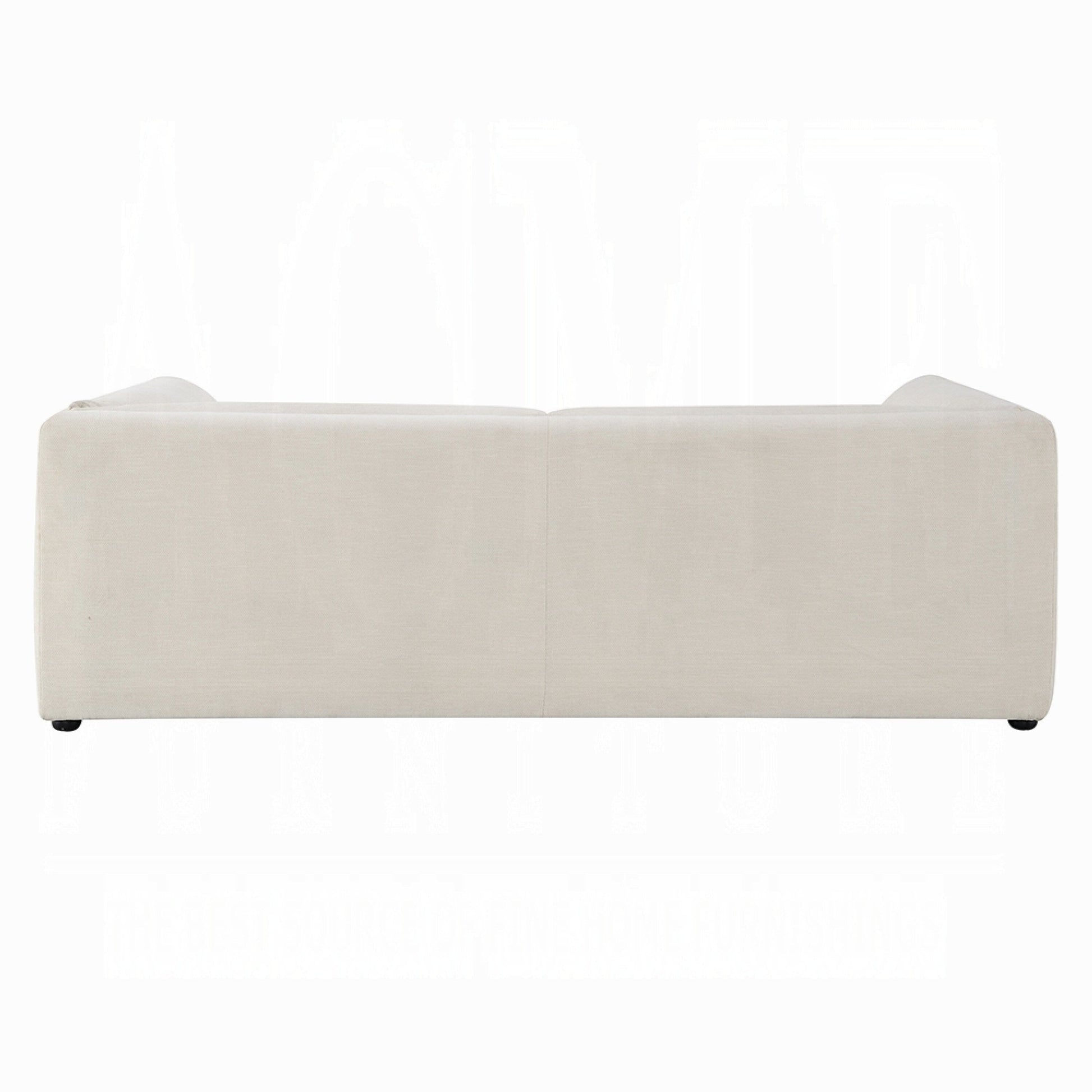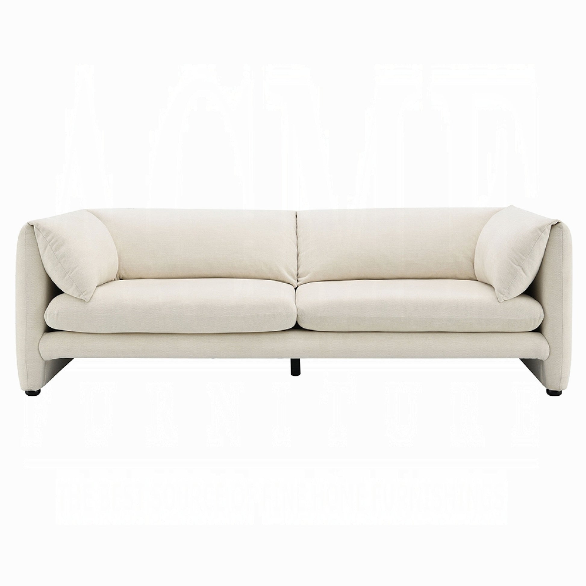 Elevate your living space with this sofa, a perfect blend of modern style and plush comfort. Upholstered in soft ivory linen fabric, it boasts pillow armrests and tight seat and back cushions for a sleek, tailored look. The sturdy wood frame and pocket coil seat construction ensure lasting durability and relaxation, while black legs add a refined touch. Explore the Kami collection for more.