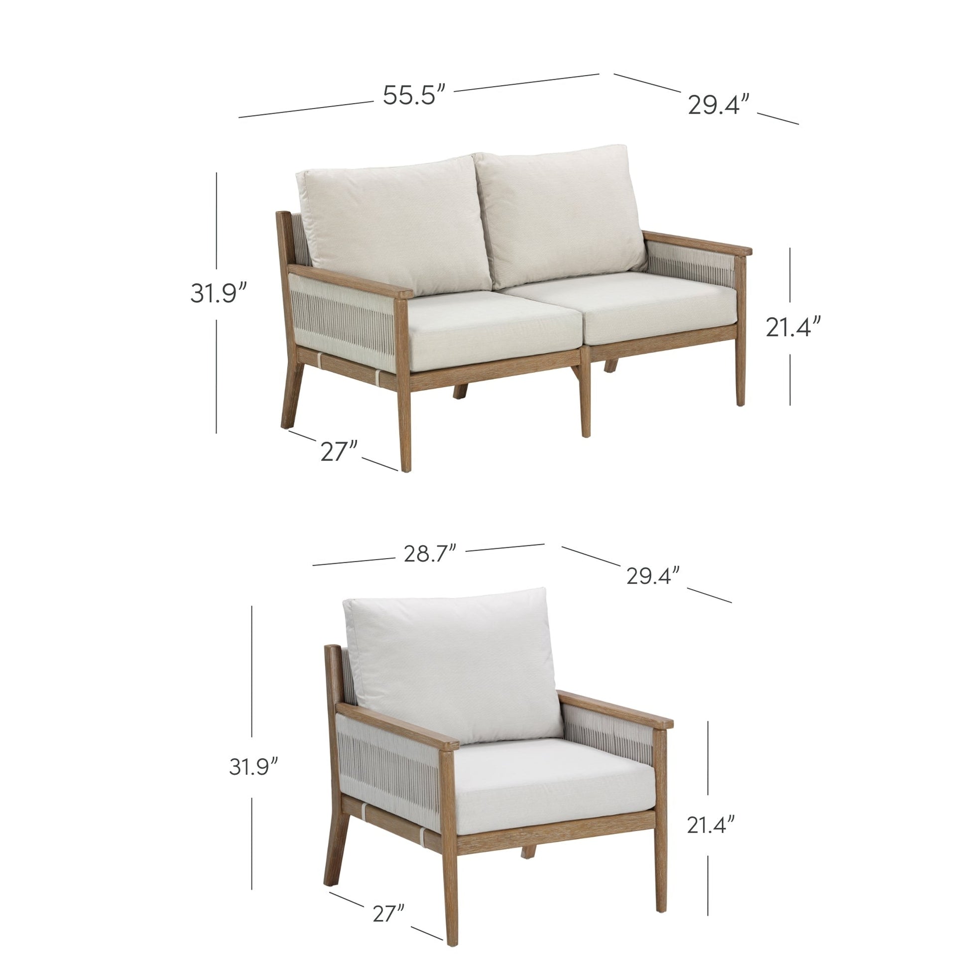 Introducing the Kayden boho 3-piece patio conversation set, your ticket to al fresco relaxation and style. This set is designed with sturdy solid wood frames with rope accents for that bohemian vibe. The solid acacia wood frame doesn't only exude natural beauty but also offers durability to make sure your outdoor furniture will last for years. With an ergonomic back design and plushly upholstered seats, each piece provides optimal support and comfort, making lounging in your backyard truly a one-of-a-kind experience.?