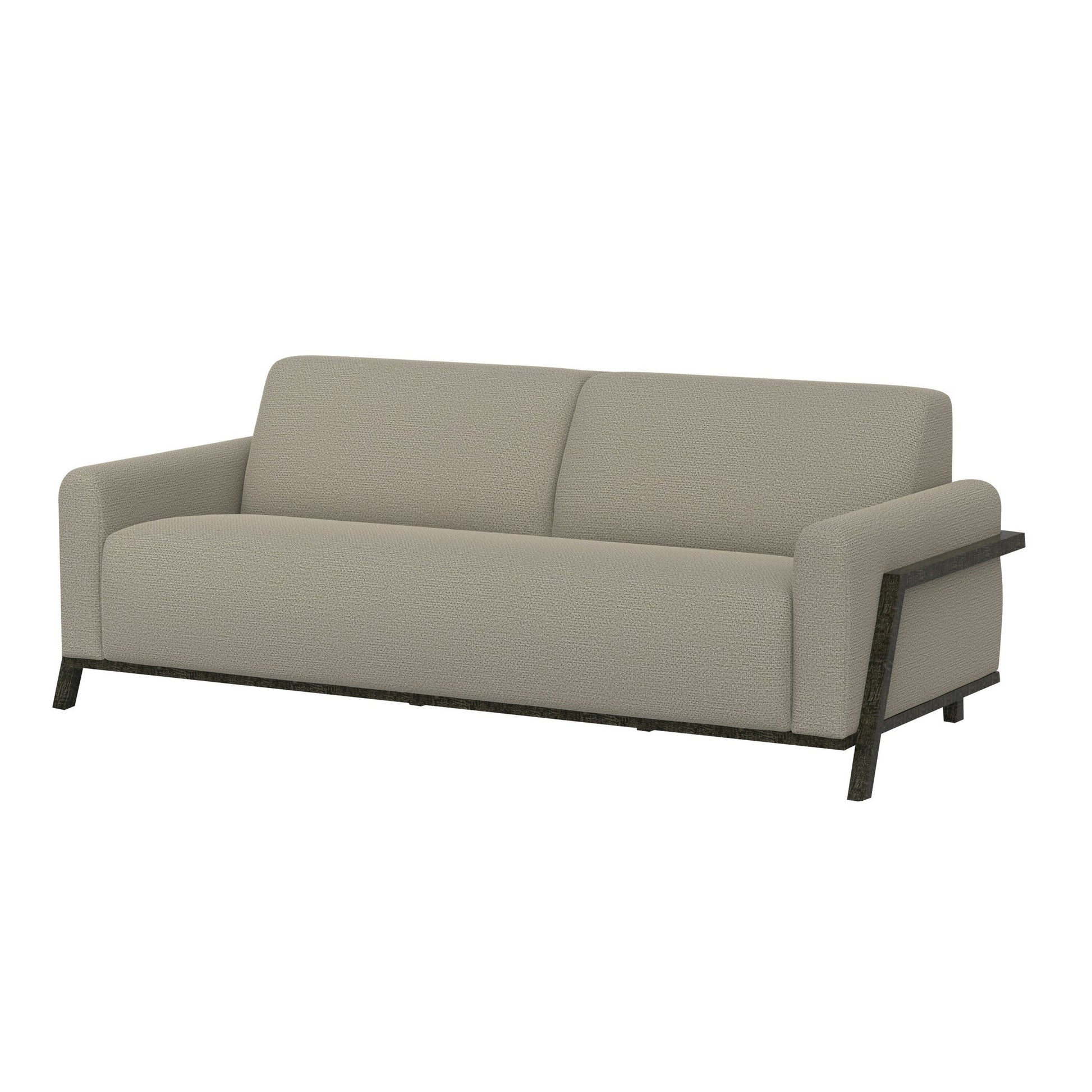 Indulge in midcentury modern luxury with this inviting sofa.?The solid pine wood frame,?hand painted with a charred log finish,?adds a touch of rustic charm to the sophisticated almond gray upholstery. Two throw pillows add a finishing touch,?creating a cozy and inviting atmosphere perfect for relaxation and entertaining. Check out our Kelly collection for more options.?